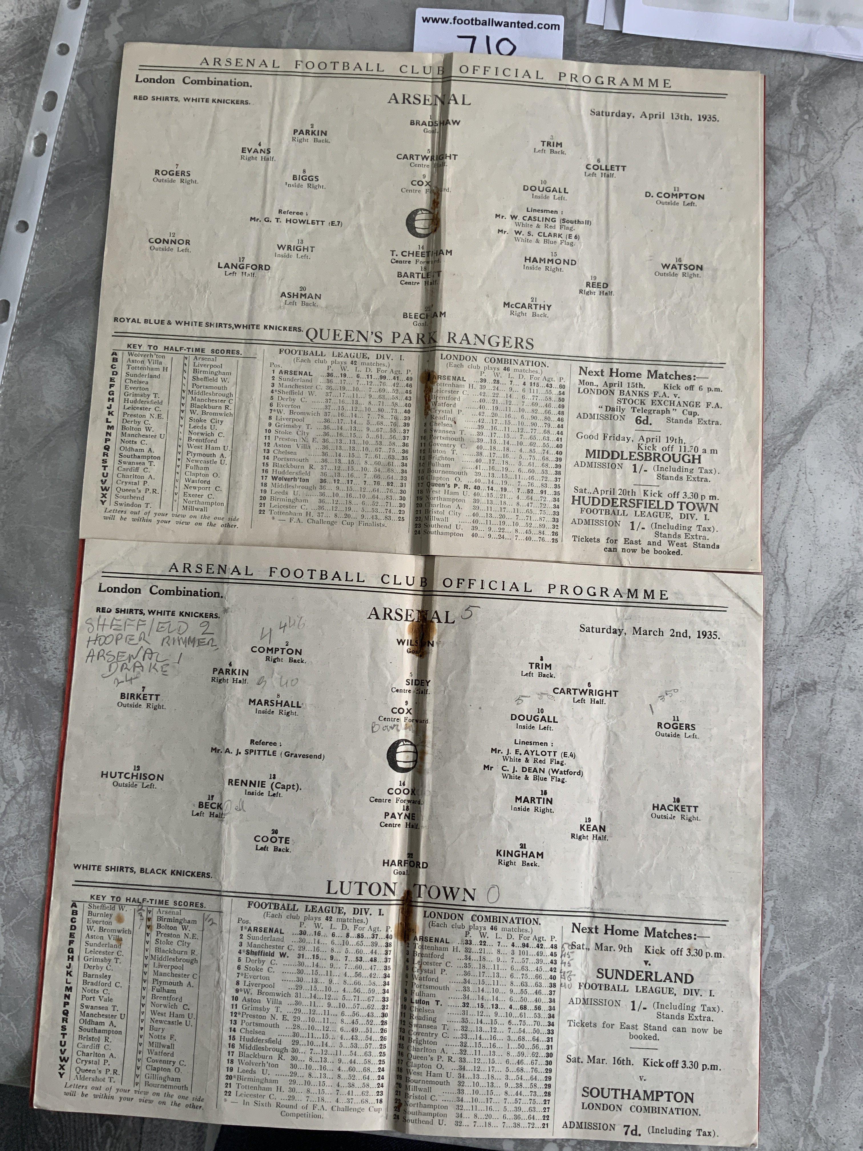 34/35 Arsenal Home Reserve Football Programmes: London Combination matches v Luton and QPR in fair condition. Staples have rusted away. (2)
