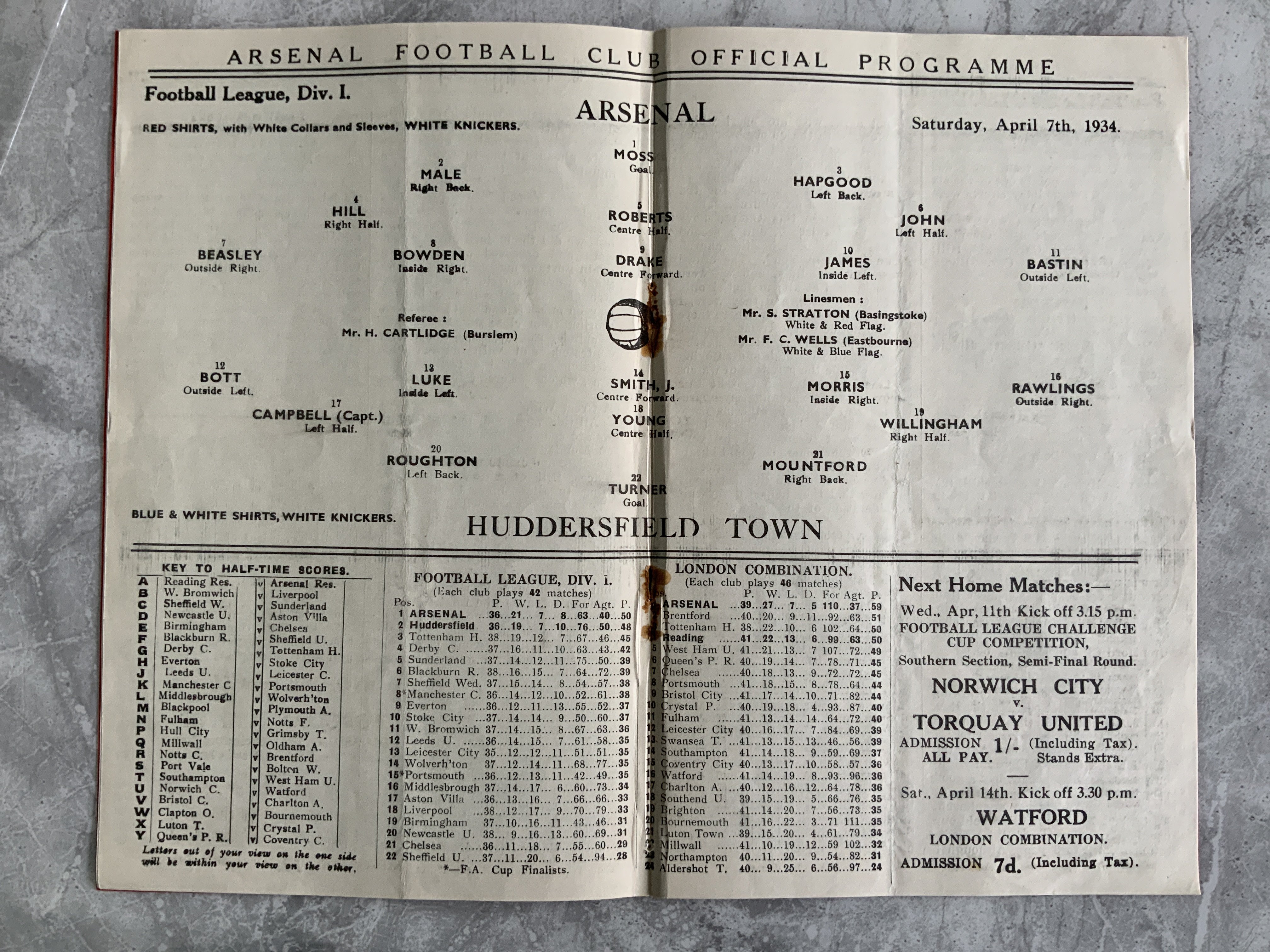 33/34 Arsenal v Huddersfield Football Programme: Good condition no team changes. Staples removed not rotted away.