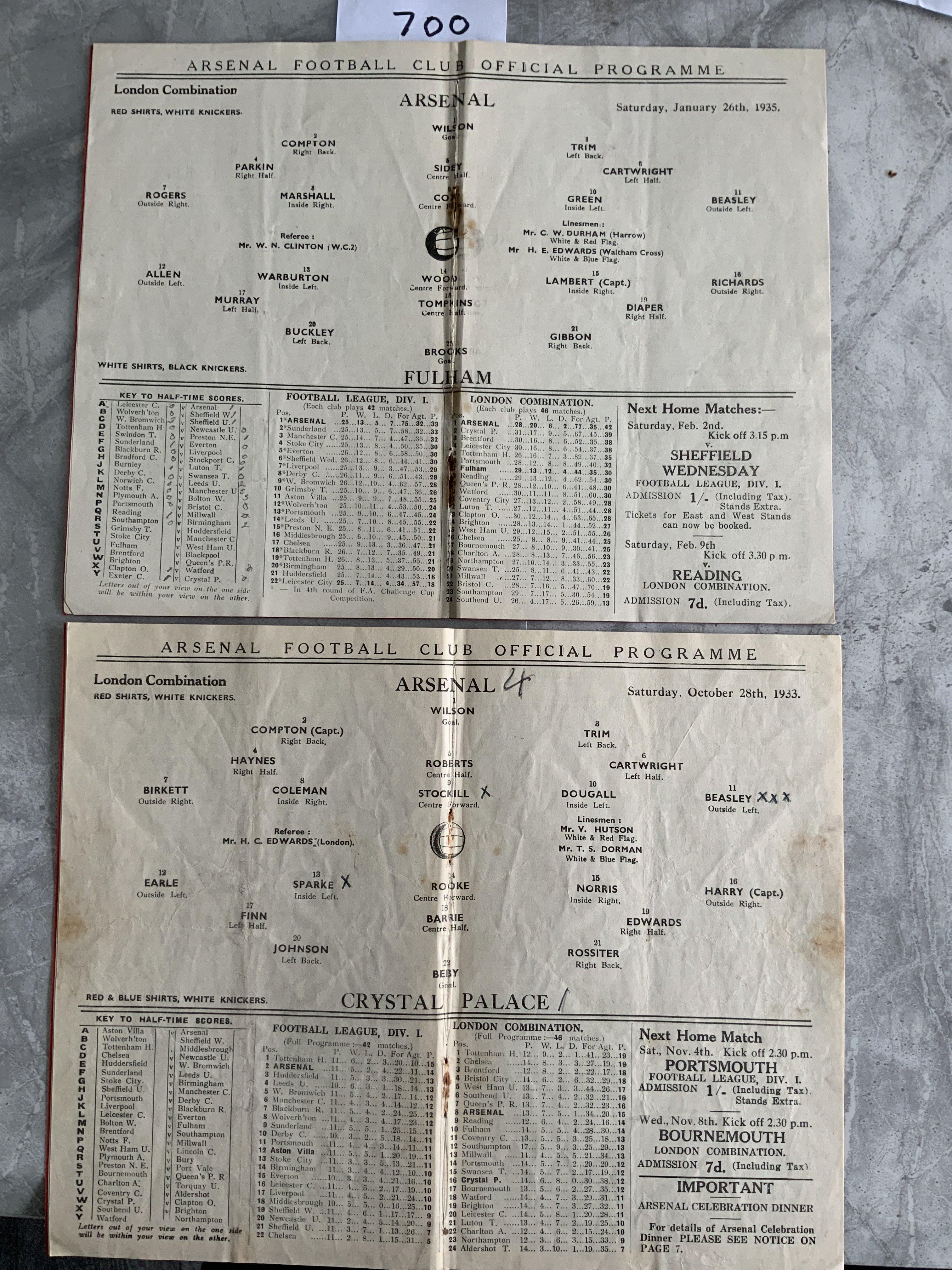 Arsenal Home Reserve Football Programmes: London Combination matches v Fulham staples rusted away leaving holes and 33/34 Crystal Palace staples removed not rusted away. (2)