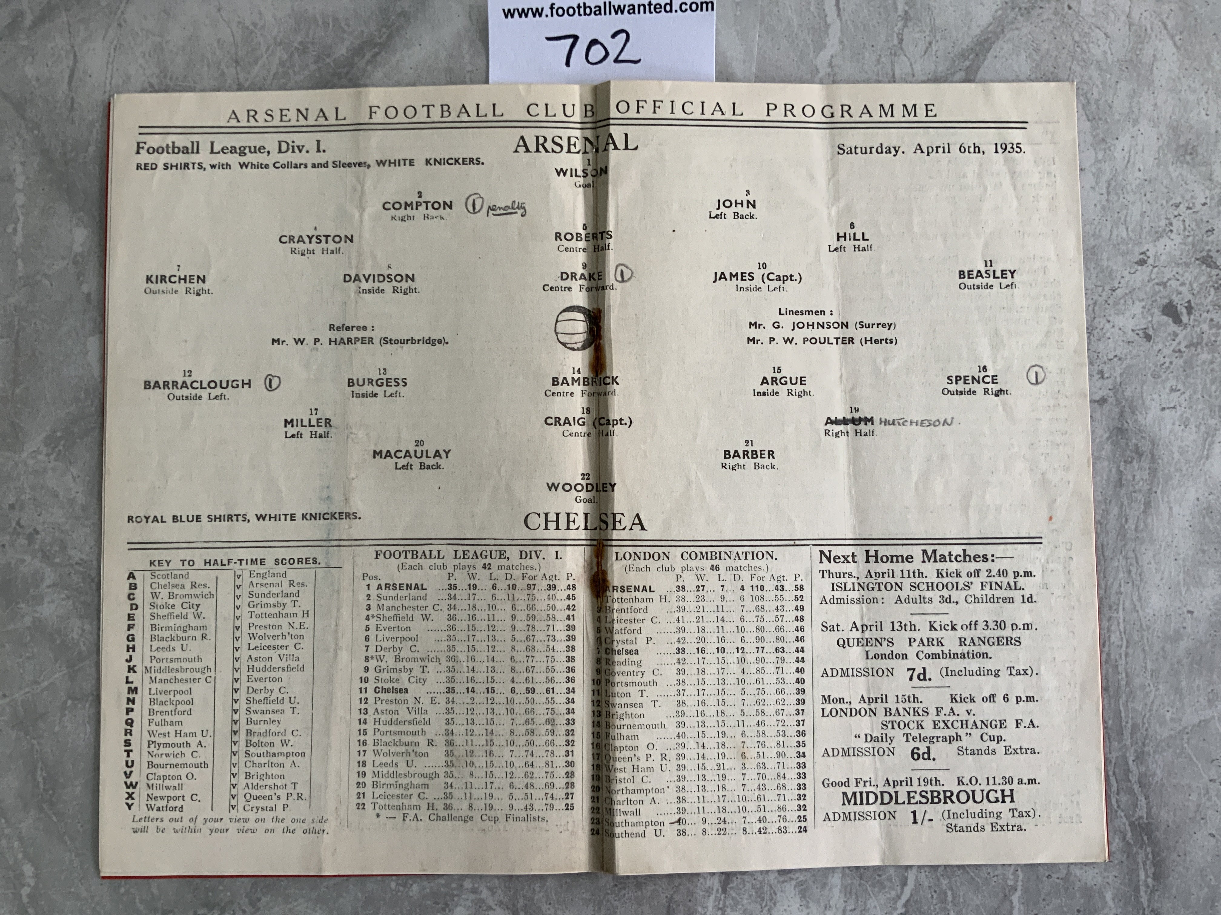 34/35 Arsenal v Chelsea Football Programme: From Arsenals championship season in good condition with team changes. Staples removed not rotted away.