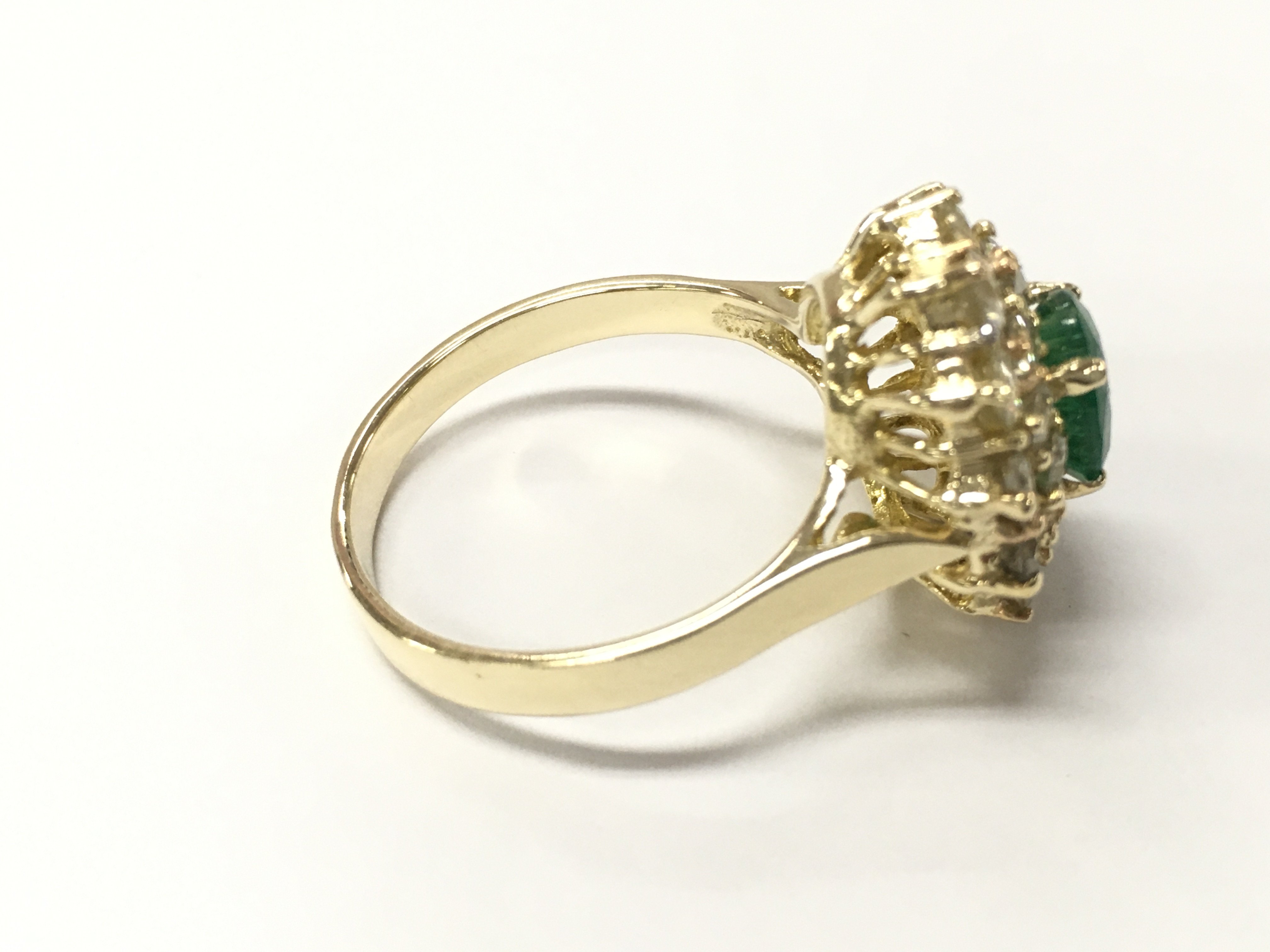 A 14ct gold oval emerald and round cut diamonds in a double halo ring. Emerald 1.05ct and diamond approximately 2.35ct. Size R. Postage B