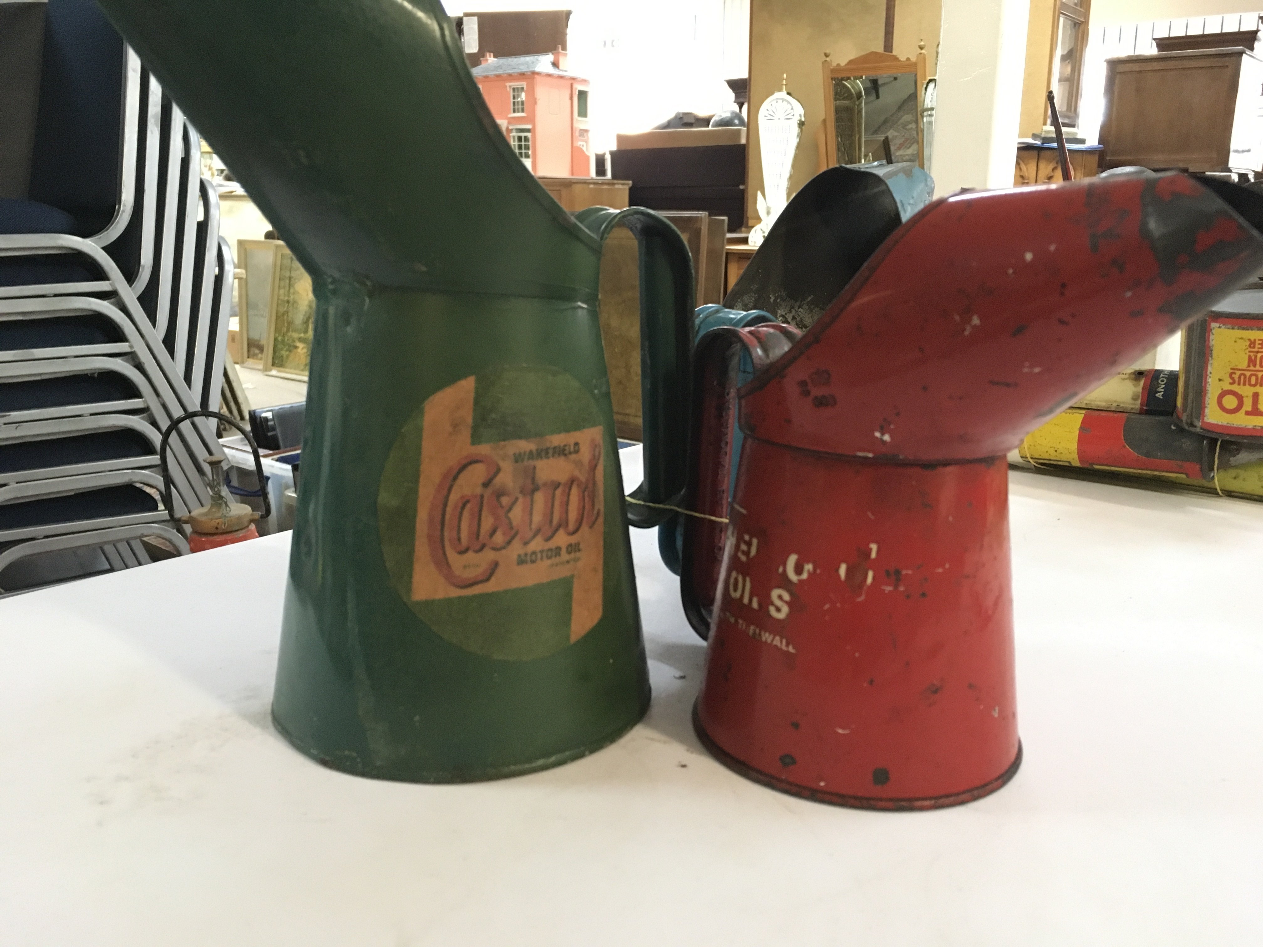 Three vintage oil jugs, castrol, shell, Thelson. No reserve