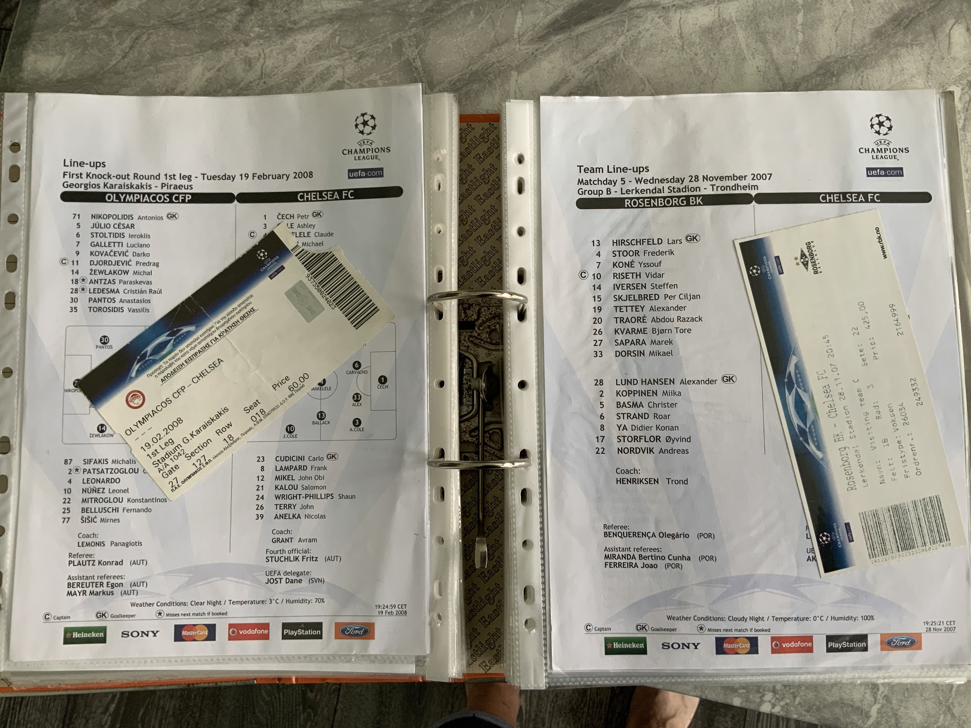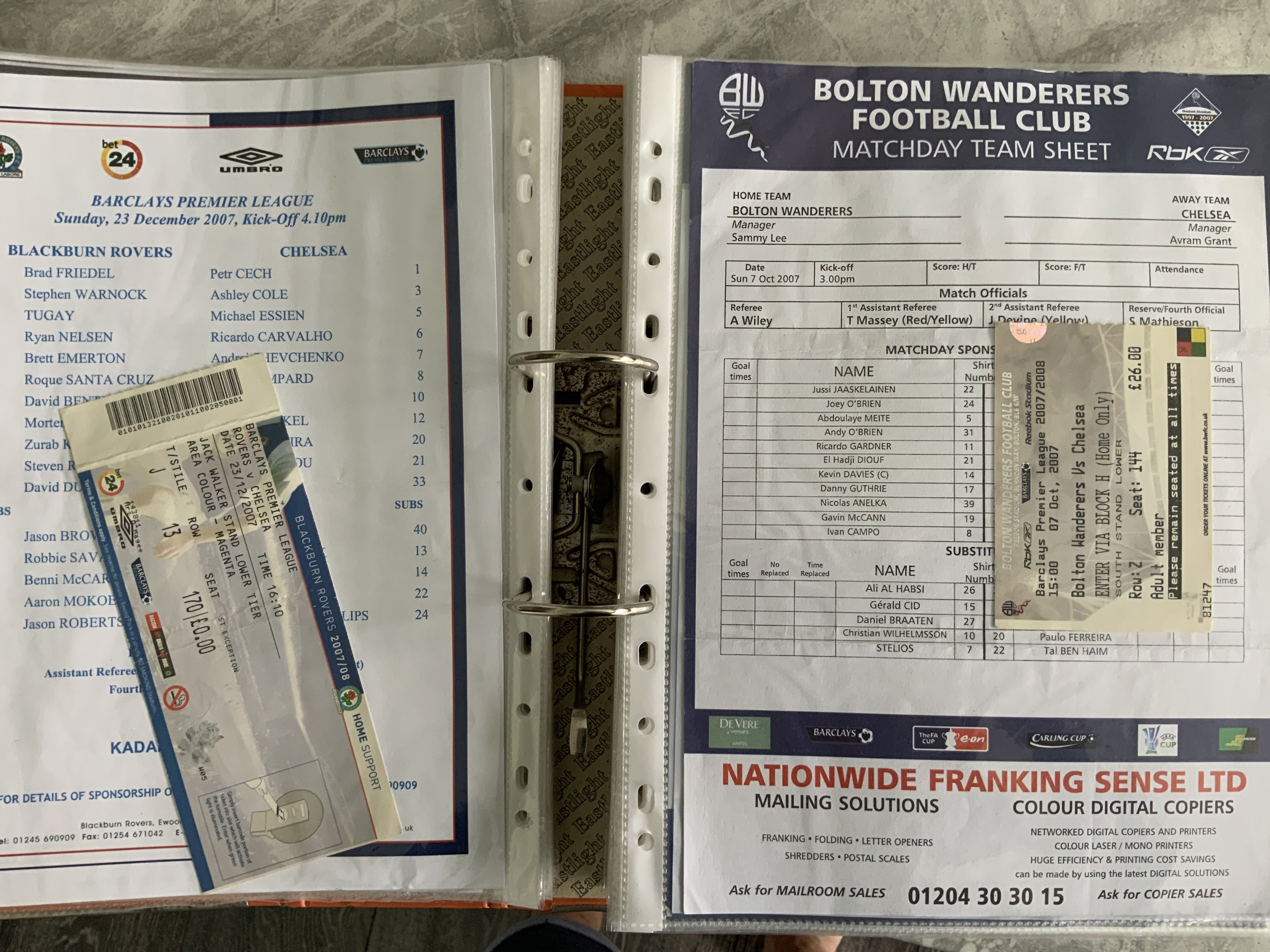 Chelsea Away Football Team Sheets + Tickets: From 2006 to 2011 there are 120 colour unwritten team sheets with accompanying tickets. Includes European matches. (240)