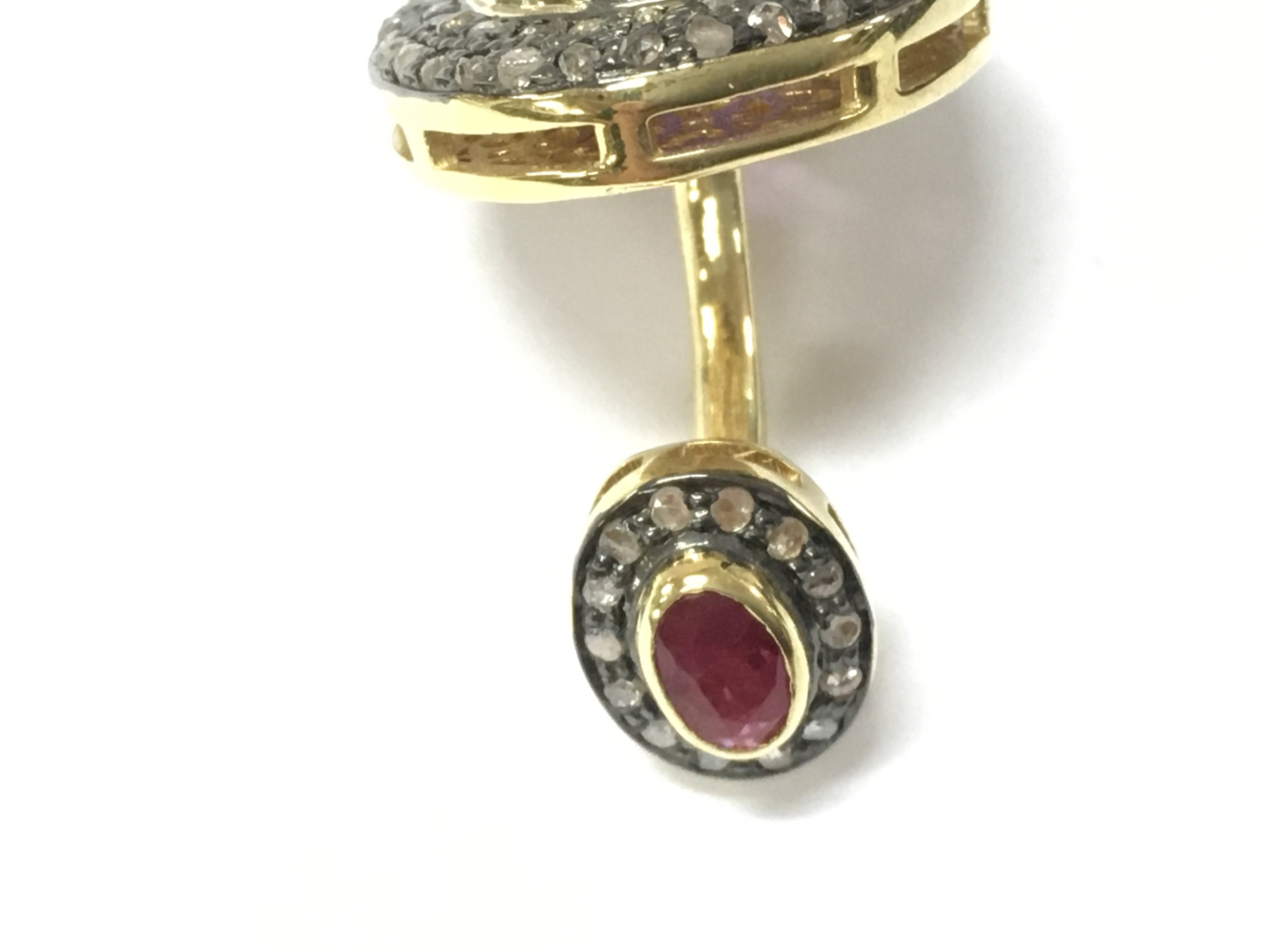 A pair of cufflinks in yellow metal set with oval amethyst surrounded by diamonds together with oval rubies surrounded by further diamonds. Amethyst 7.60ct Diamonds 1.15ct and rubies 0.40ct. Postage B