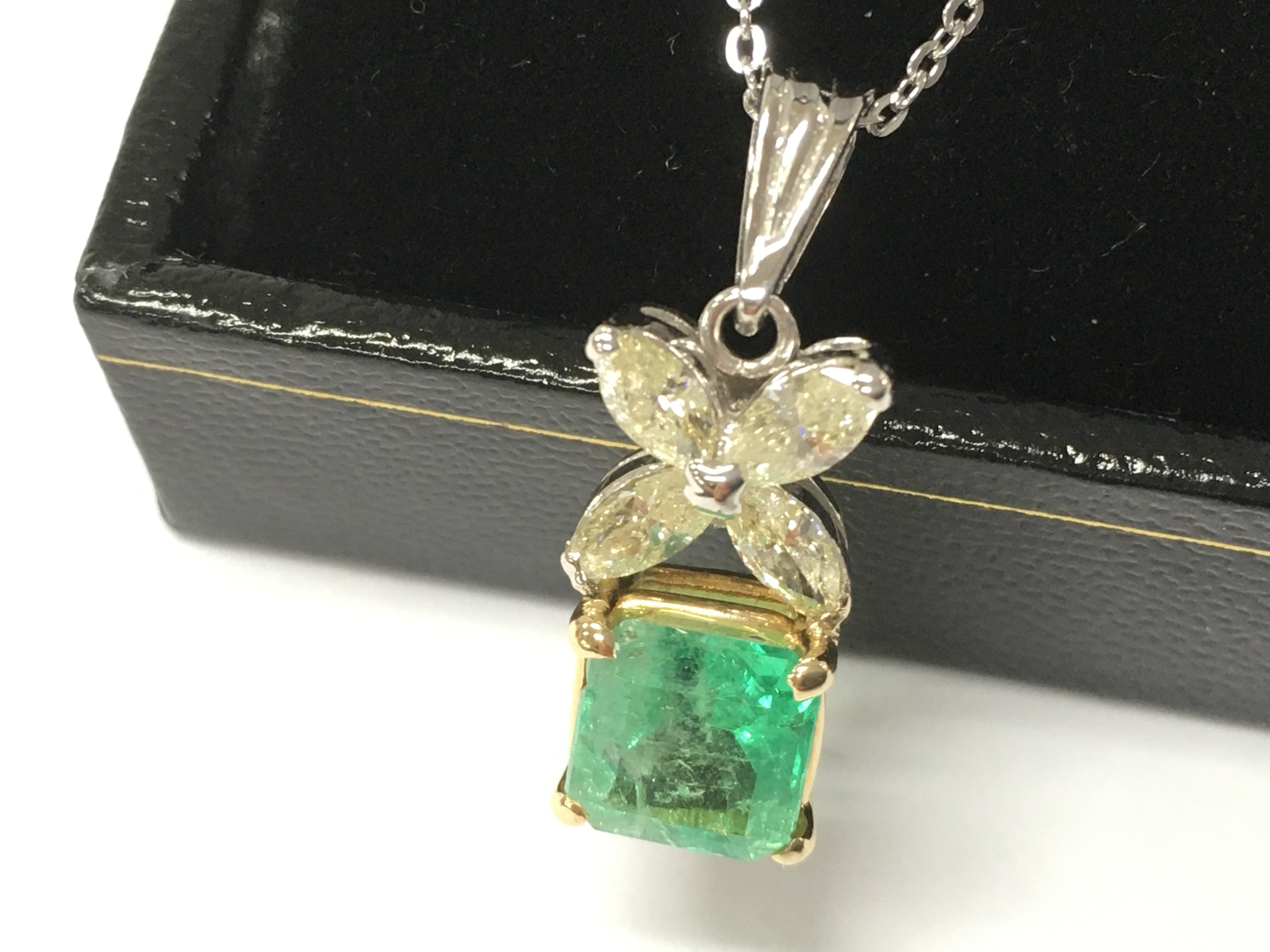 An 18ct white and yellow gold pendant set with square step cut emerald beneath 4 marquise cut diamonds on a silver chain. Emerald 1.25ct approx and 0.80ct diamonds approx. Postage B