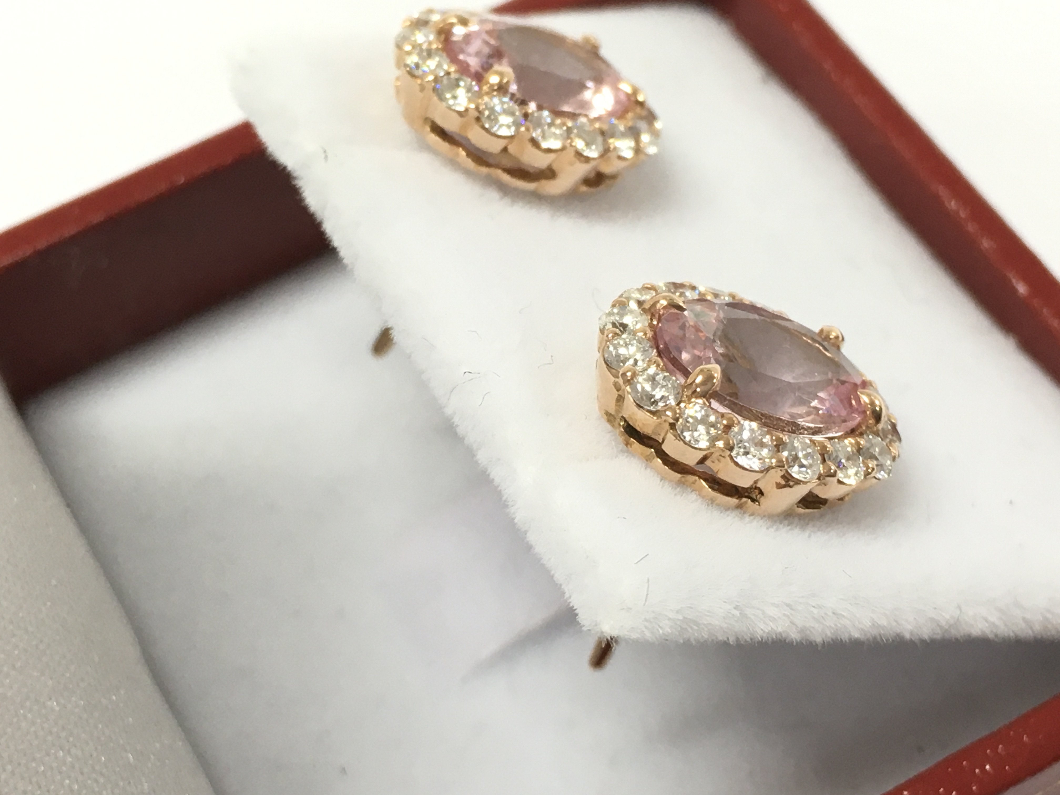 A pair of rose gold oval morganite and diamond cluster studs. Morganite 2.86ct and diamonds 0.78ct approx. Postage B
