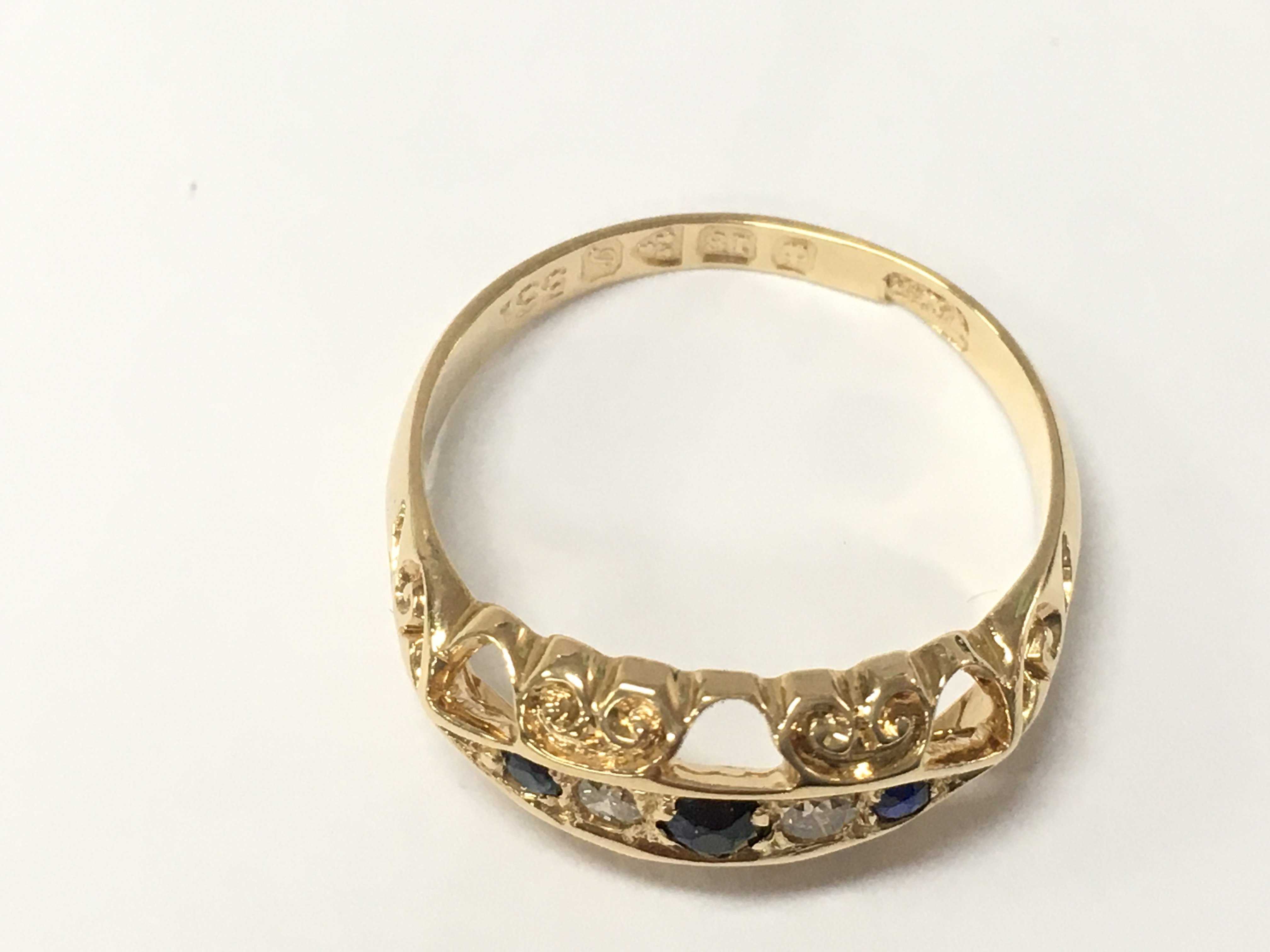 An 18ct yellow gold sapphire and diamond ring with carved detailing. Circa 1915. Sapphire 0.10ct and diamonds 0.04ct Approx. Size L