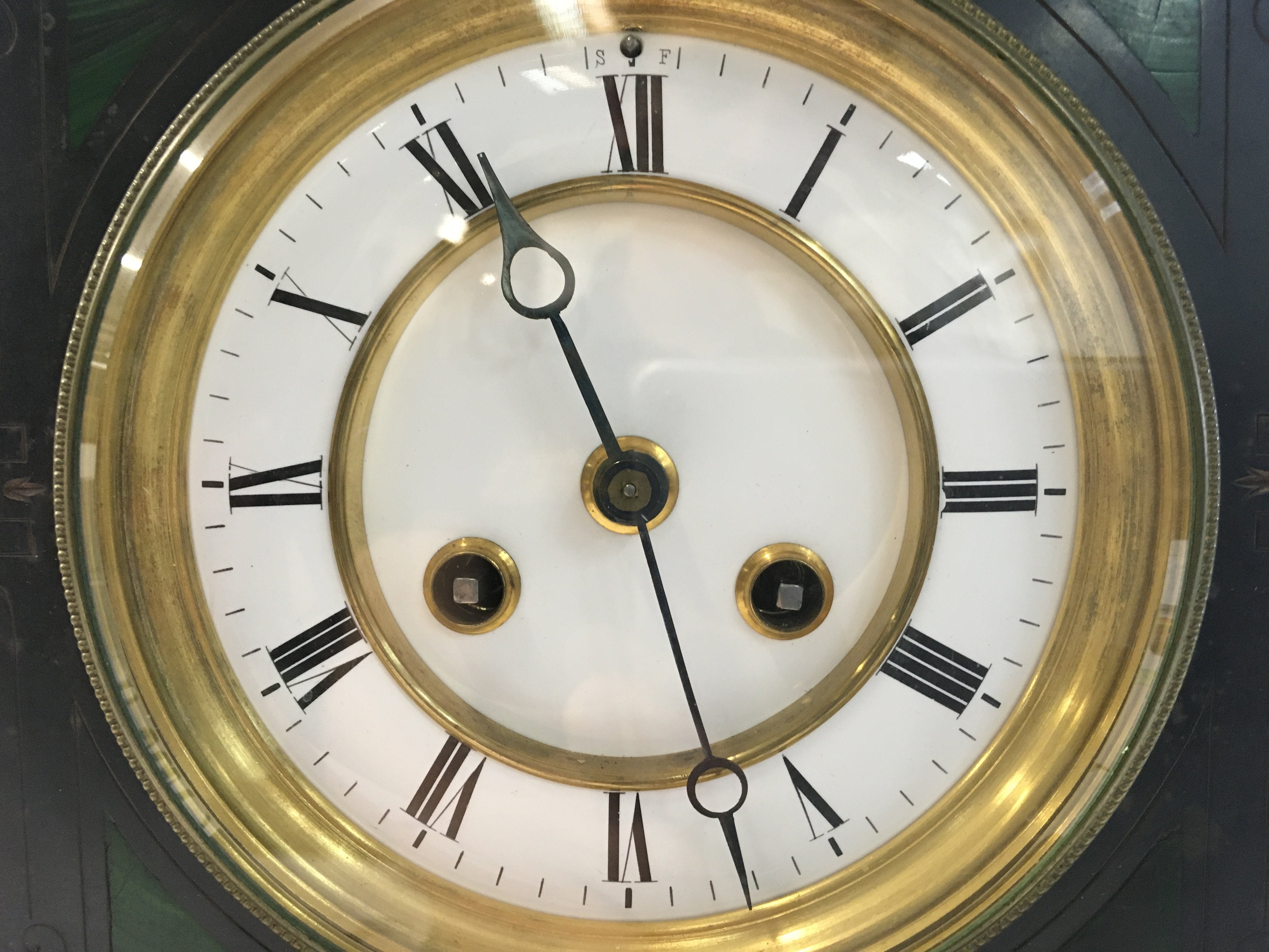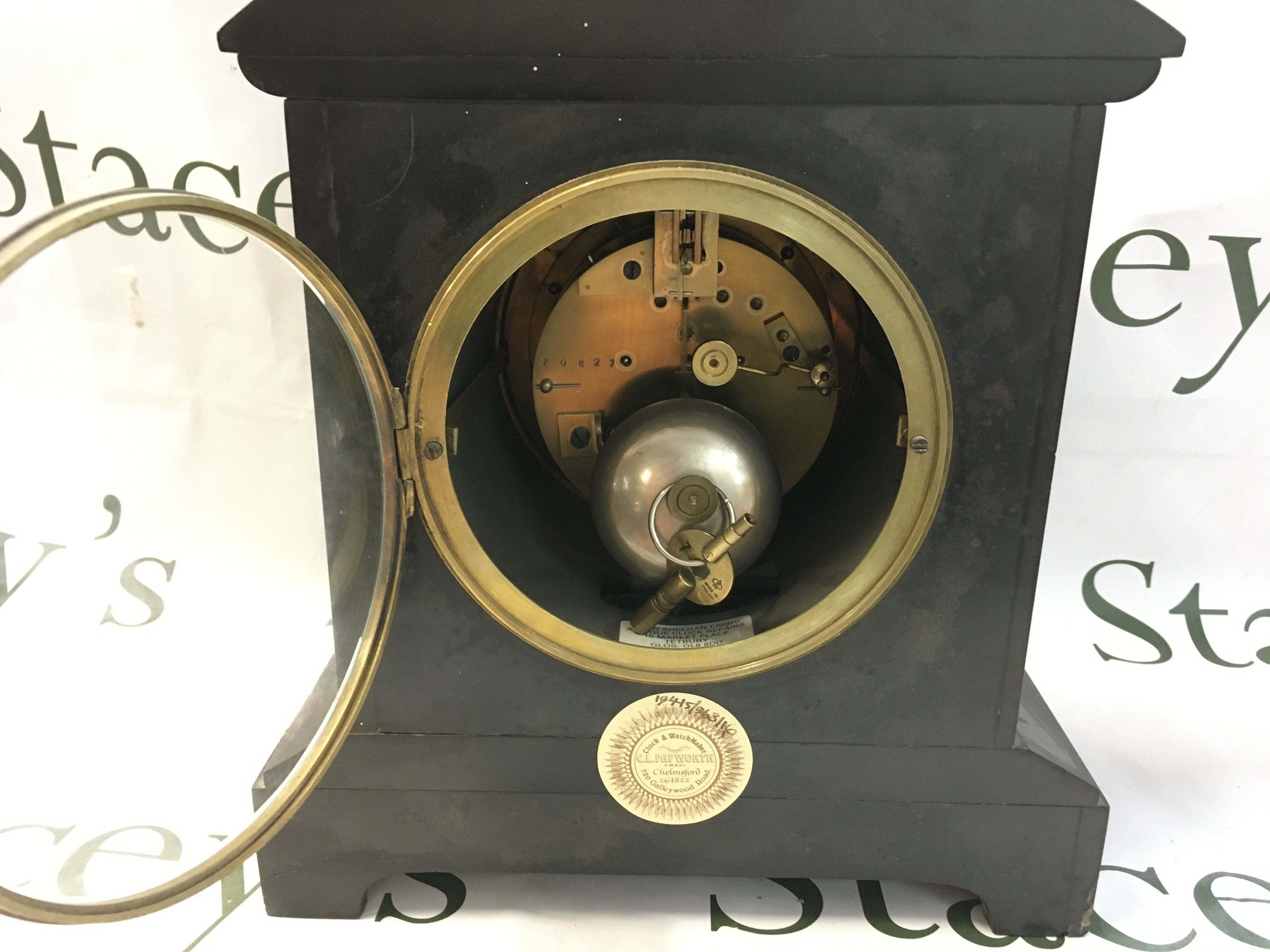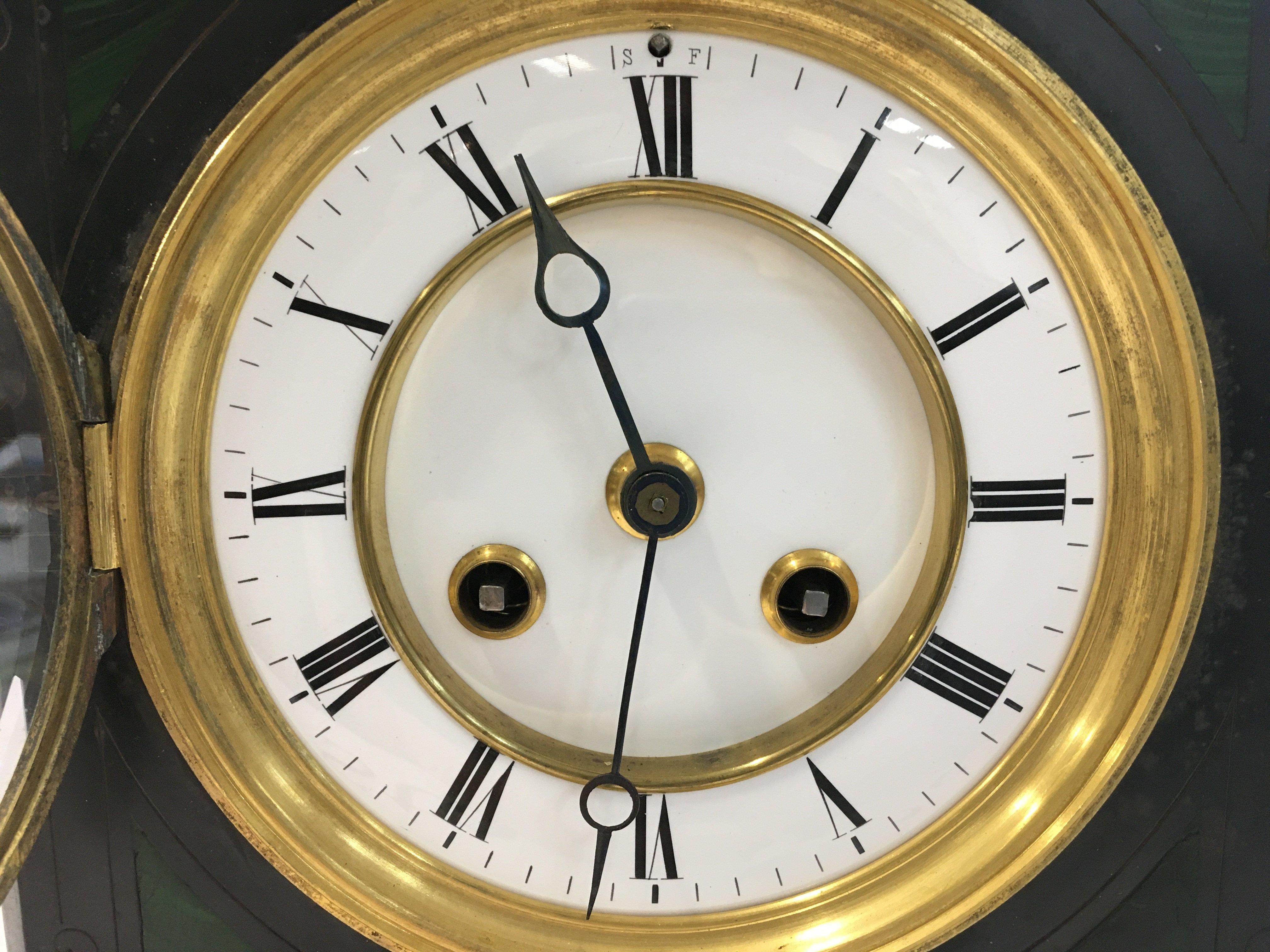A slate mantle clock with a white enamel Roman numeral face and green stone inlay . Seen working. This lot cannot be posted