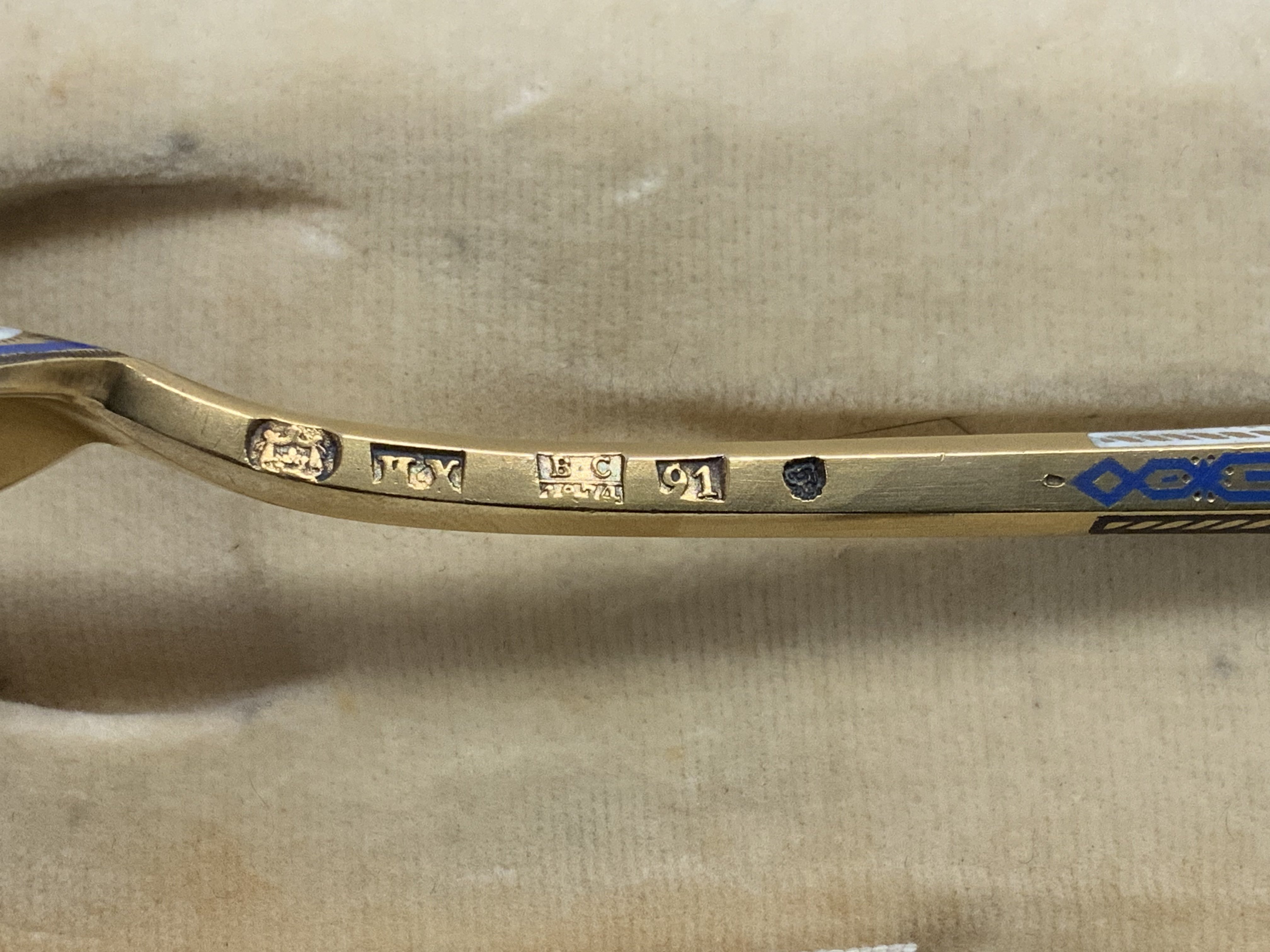 A Russian silver gilt and enamel spoon, with marks for Viktor Vasilyevich Savinsky, Moscow 1874, fitted case. (B)