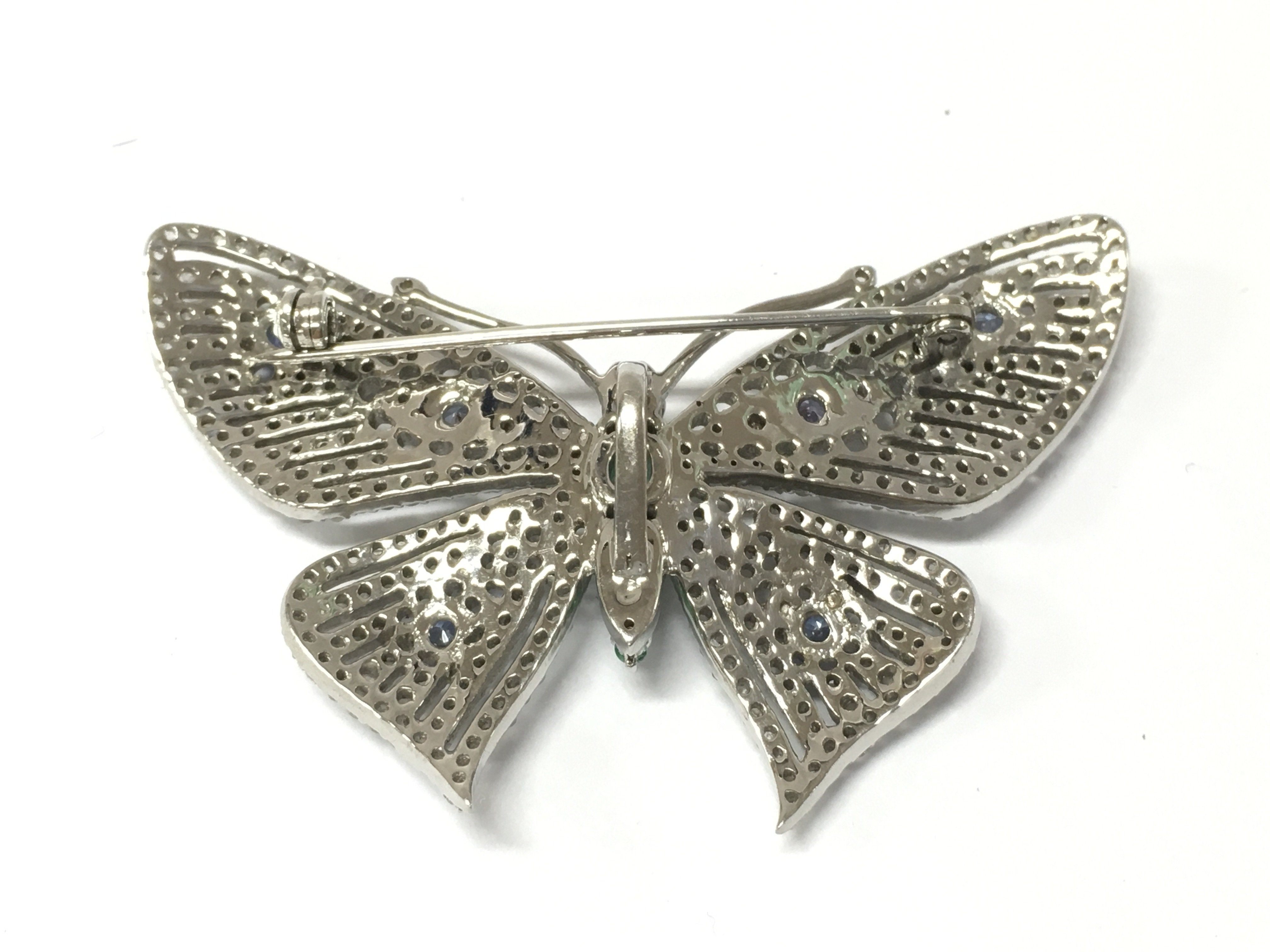 An attractive silver brooch / pendant combined set with Emeralds tanzanite and several diamonds. Emeralds 0.80ct Tanzanite 0.61ct and diamonds 1.86ct approx. Postage B