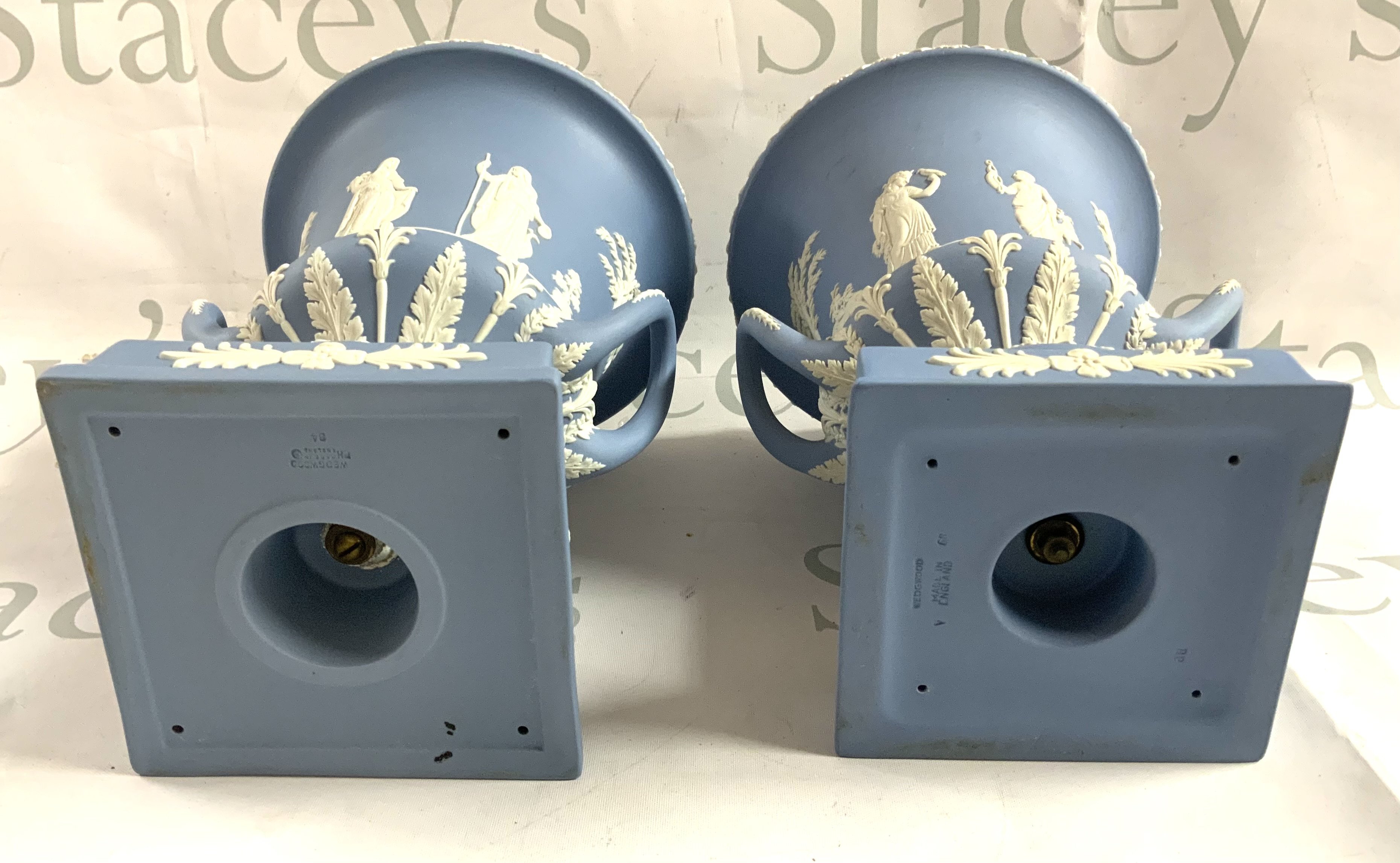 2 Wedgewood Jasperware urns and covers with classical scenes. 31cm/30cm. (68/84) (D)