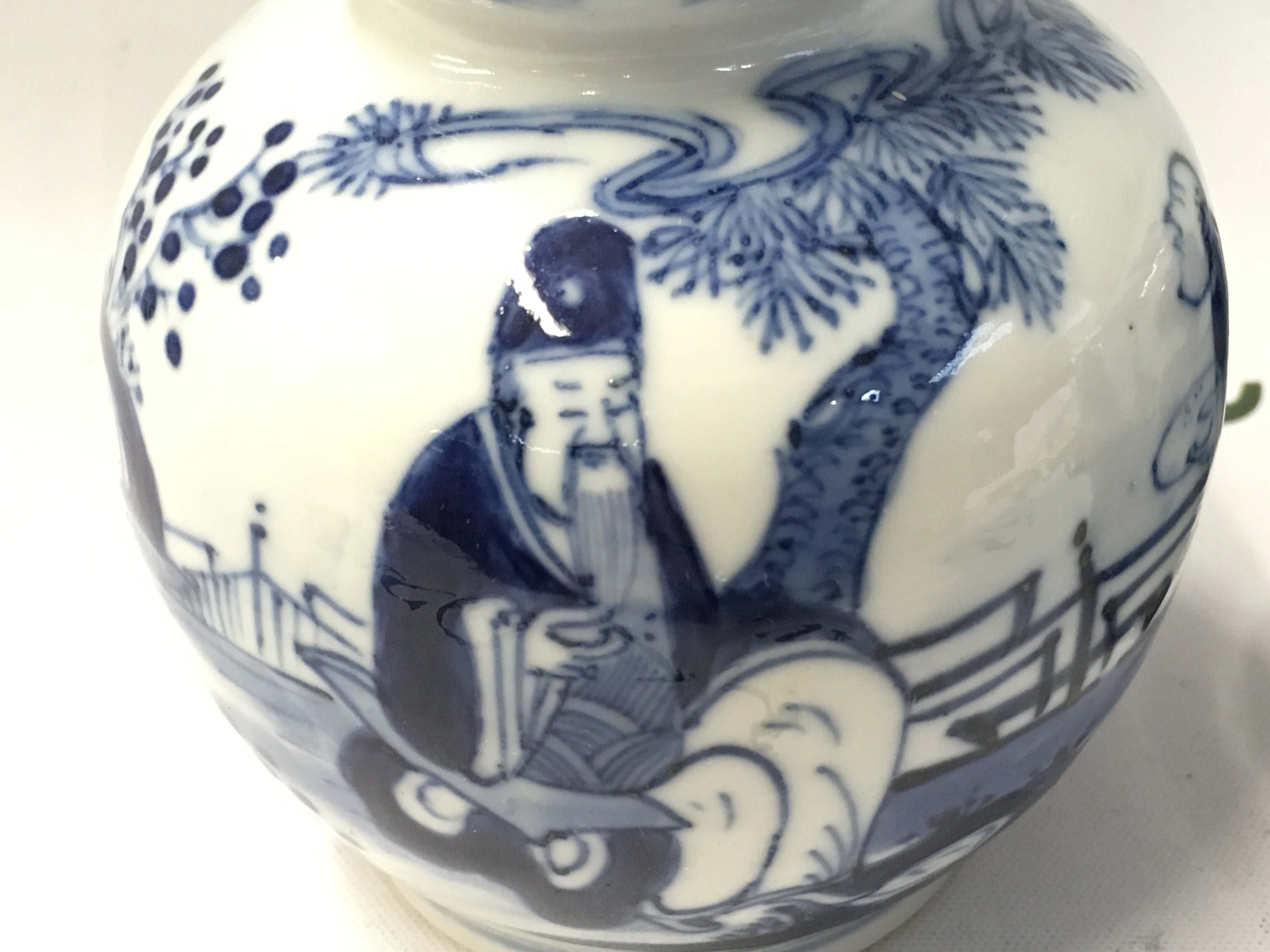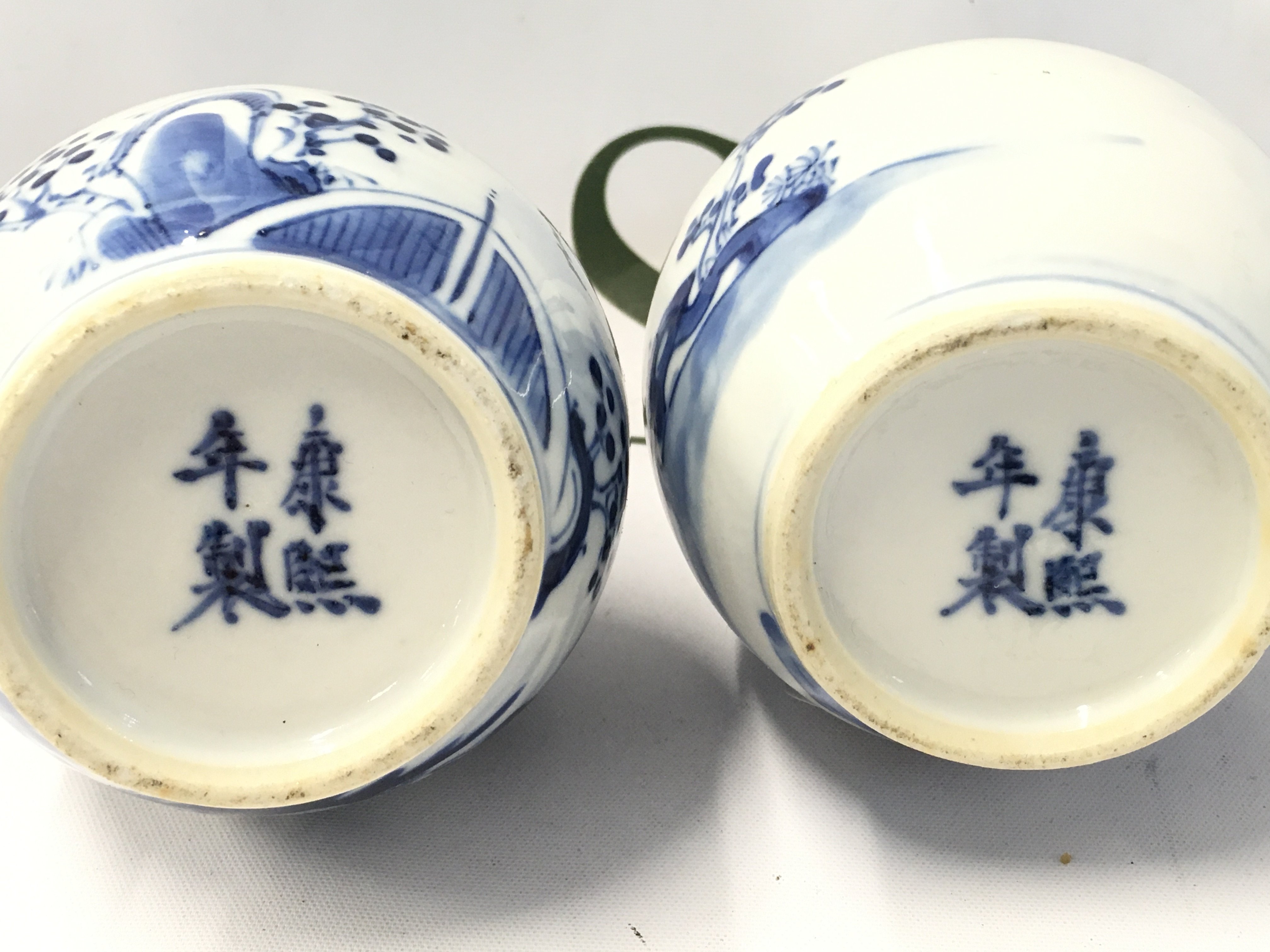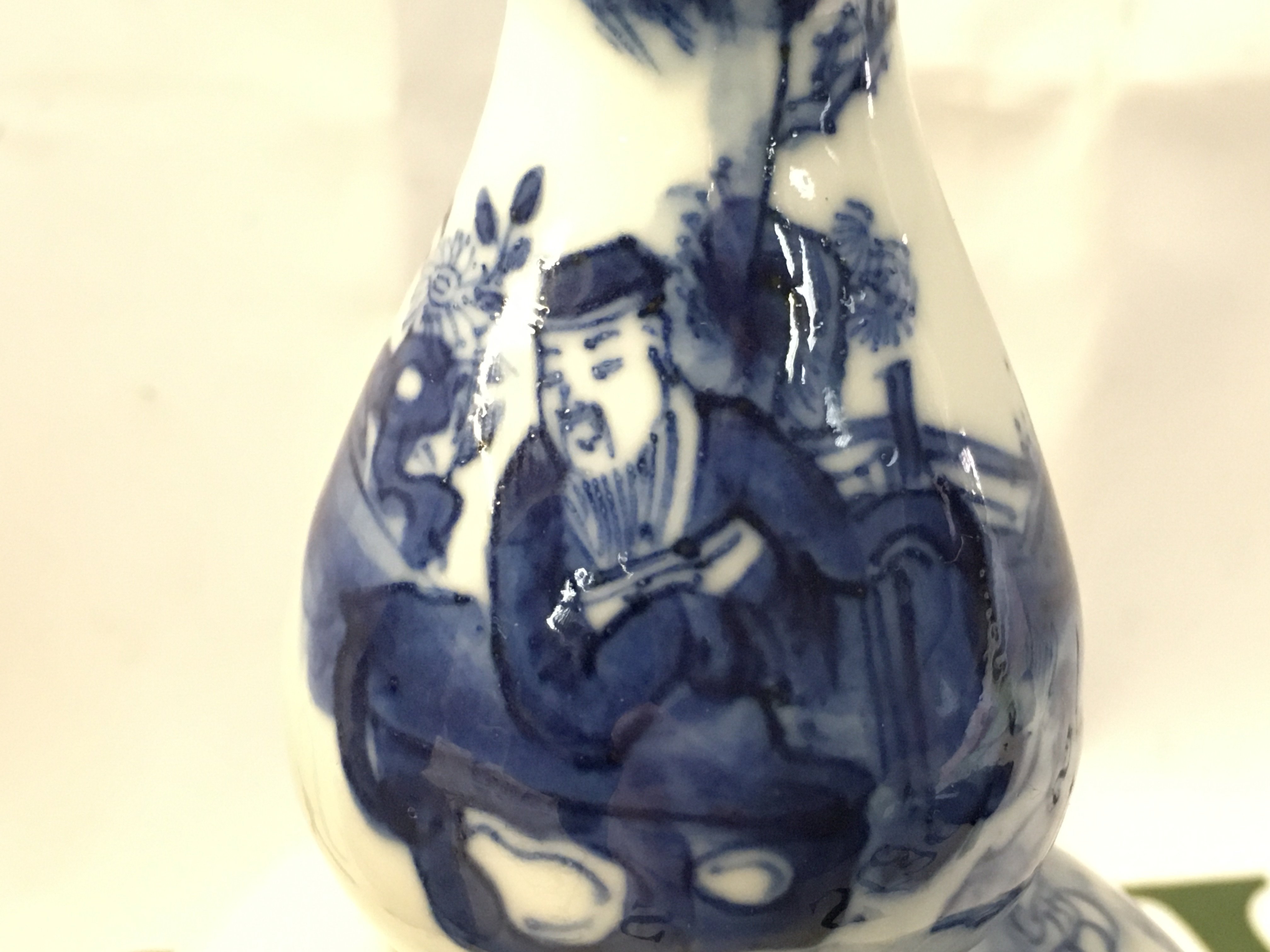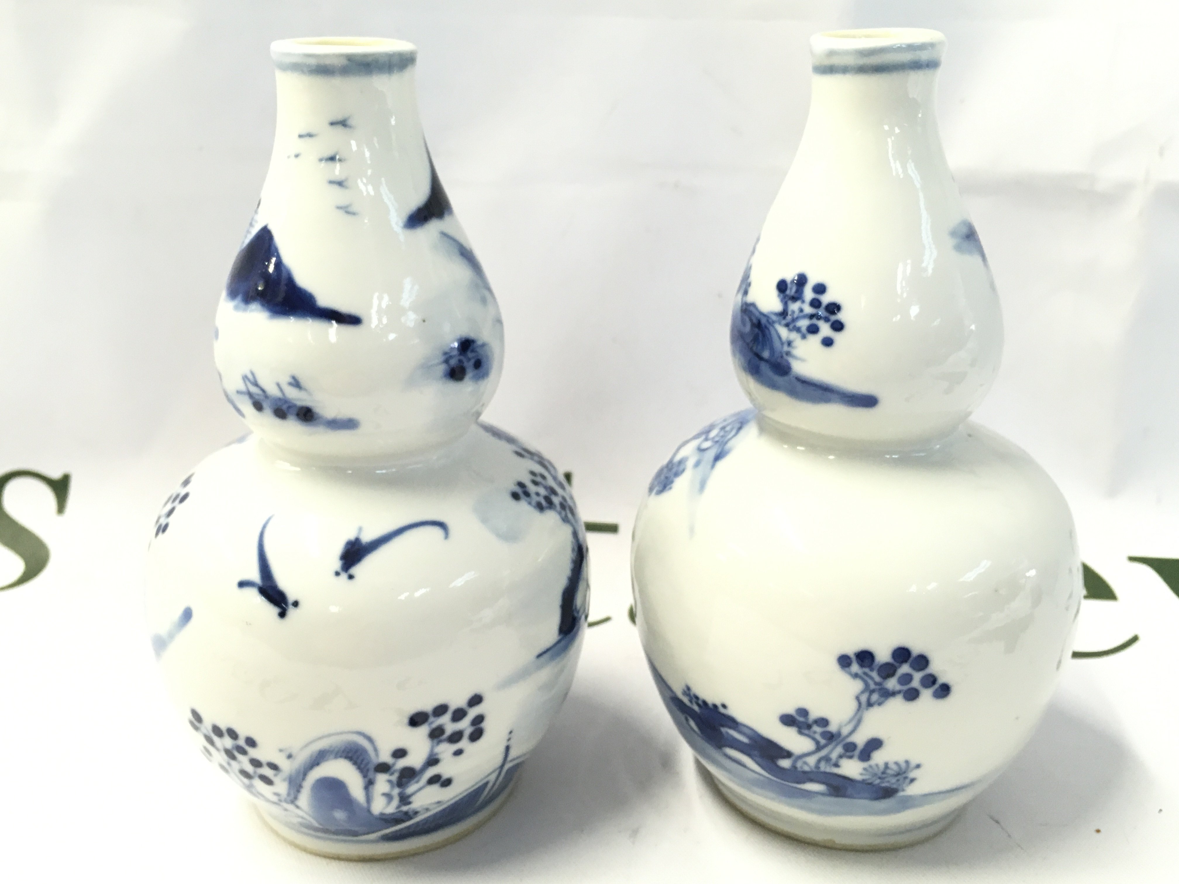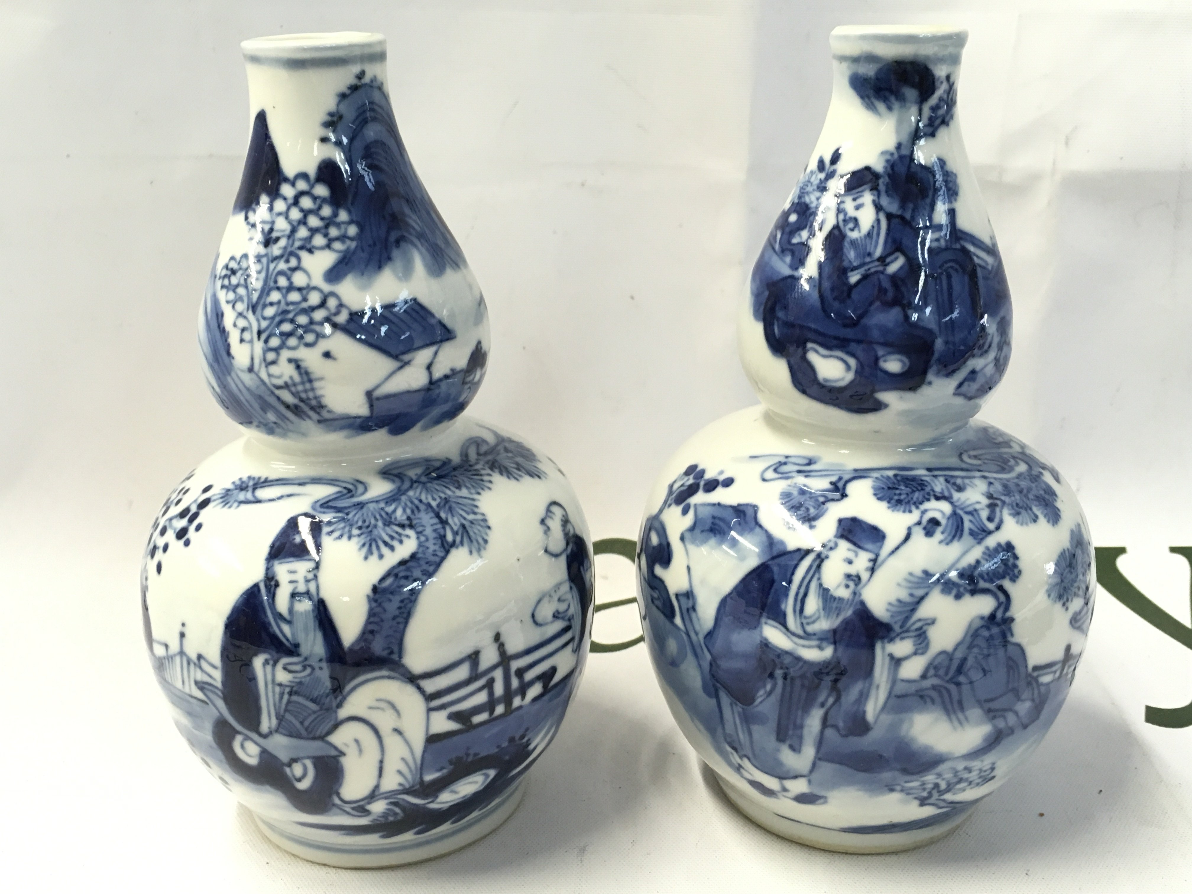 Two small Chinese Double Gourd blue and white vases decorated with scenes of figures with four character Kangxi marks at base. approximately 13cm tall. This lot cannot be posted