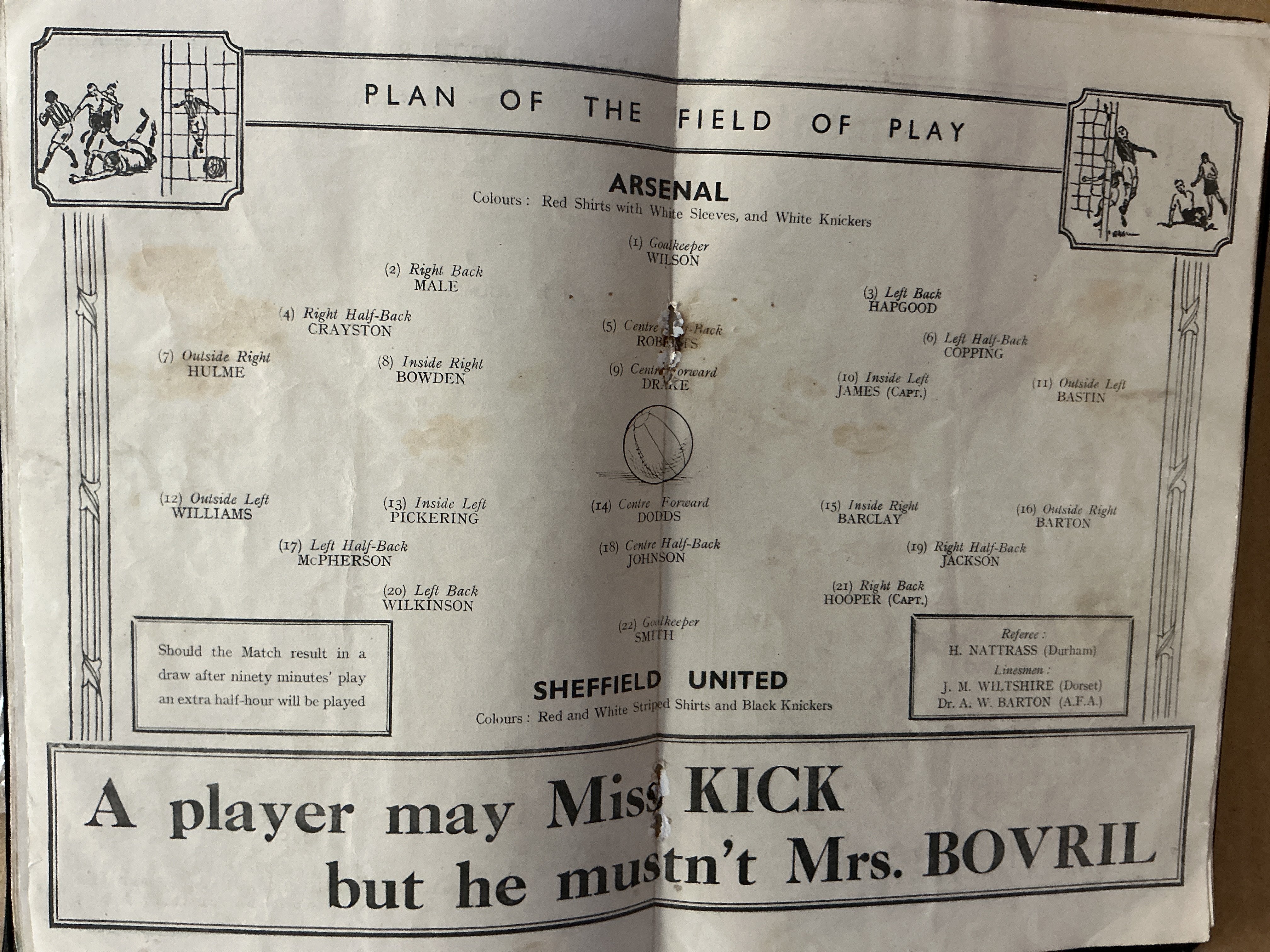 1936 FA Cup Final Football Programme: Arsenal v Sheffield United in fair condition with no team changes. Professional repair to spine and staples never replaced.