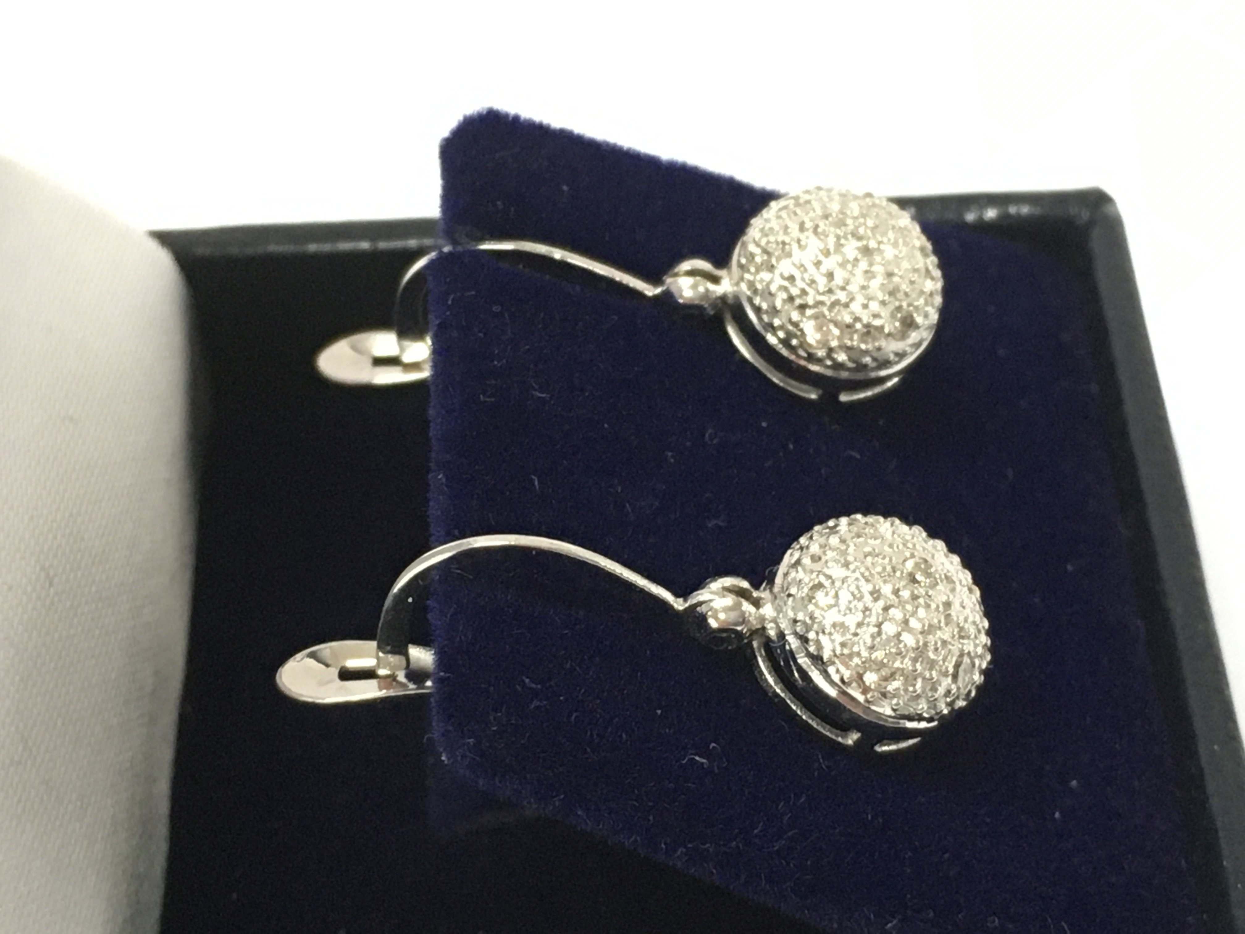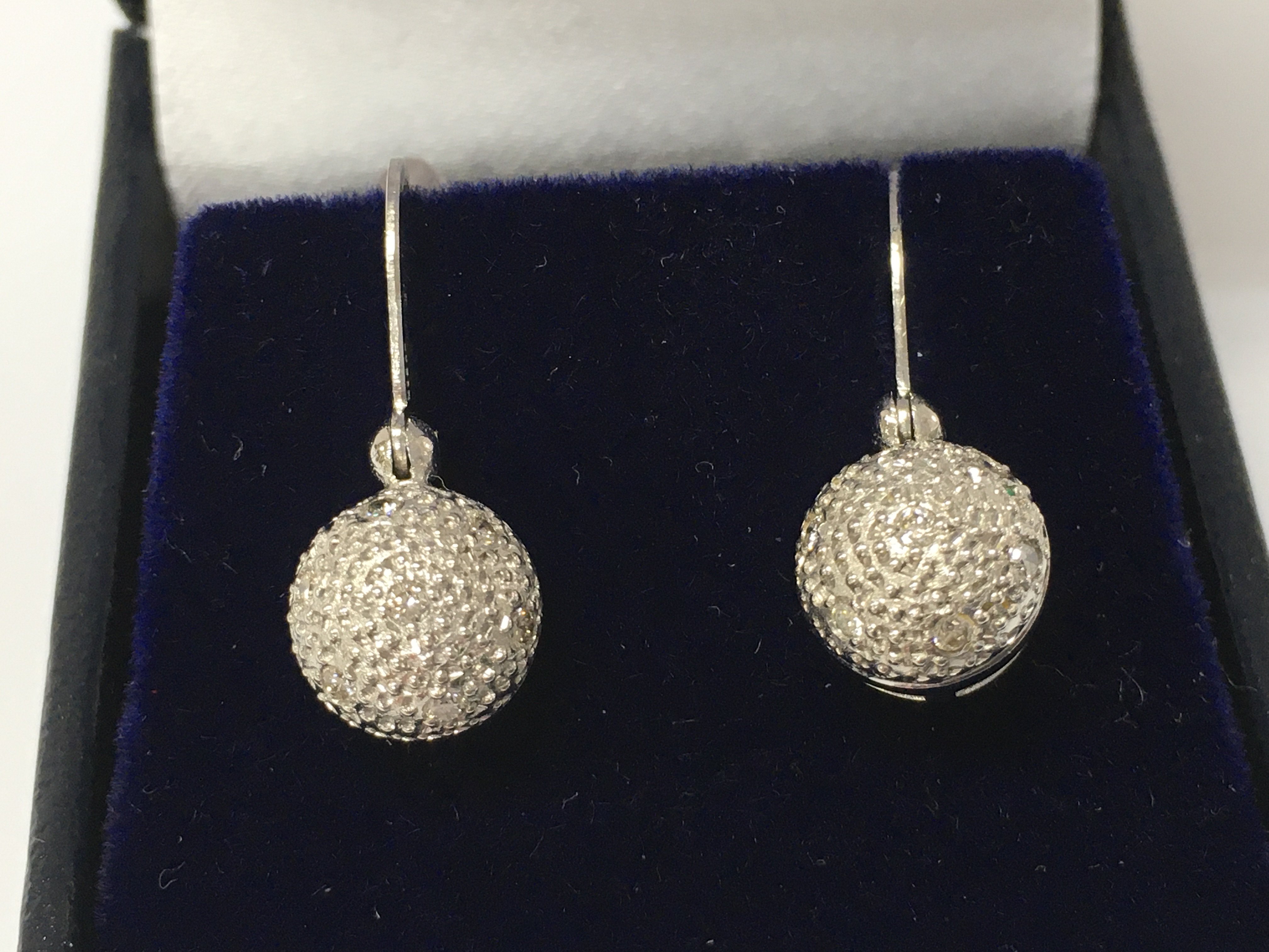 A pair of 18ct white gold droplet earrings set with diamond ball cluster with omega fastenings. Diamonds 0.18ct approx.