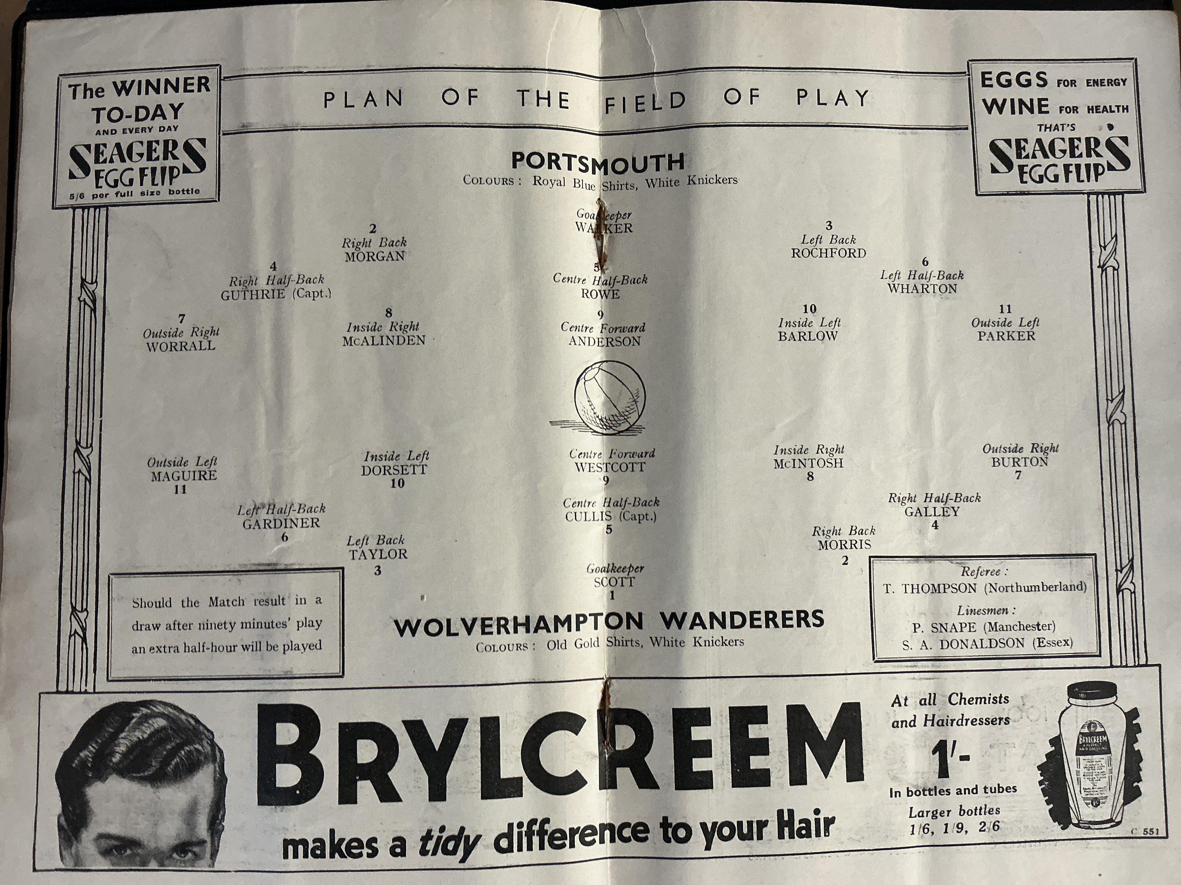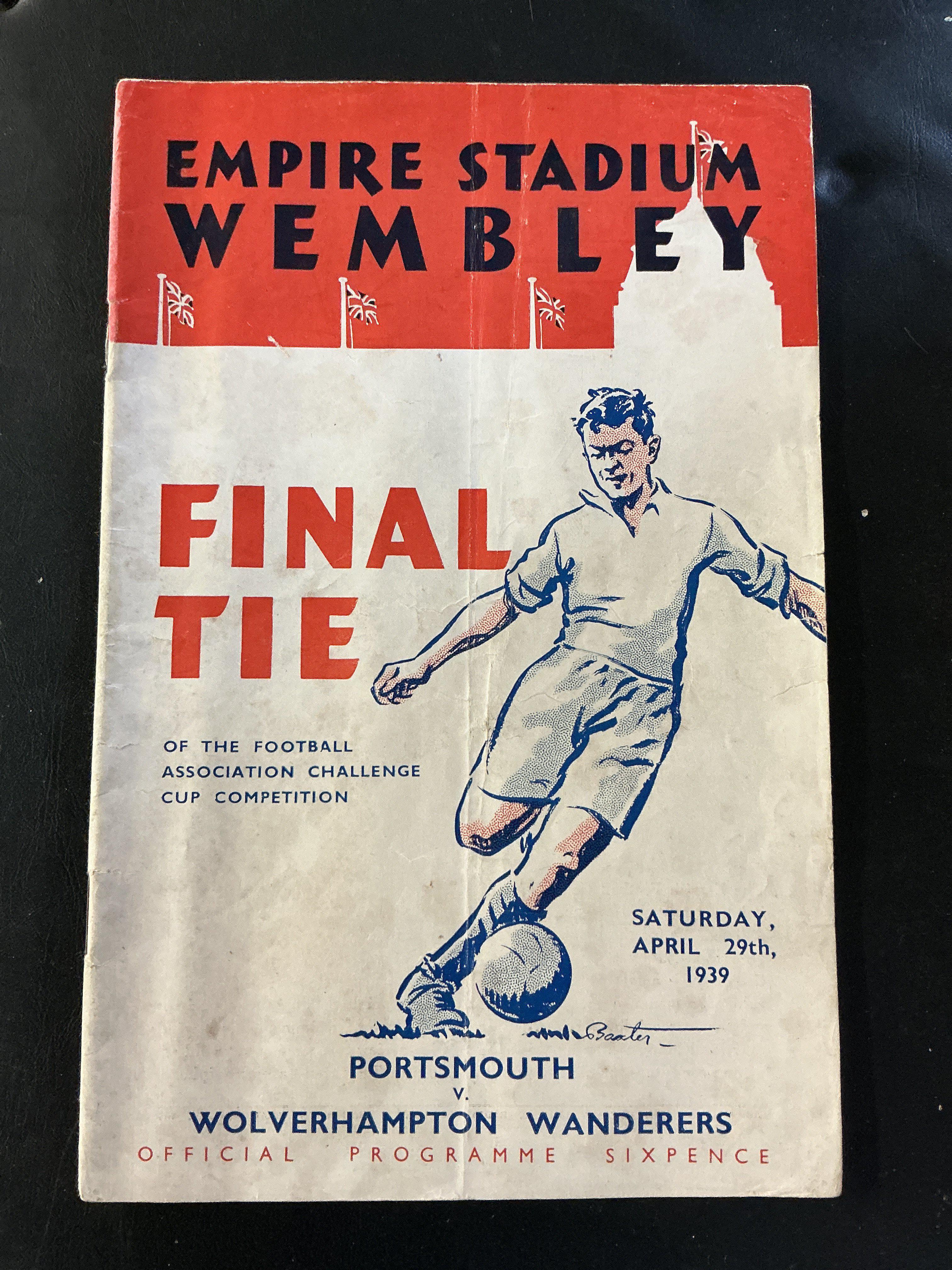 1939 FA Cup Final Football Programme: Portsmouth v Wolves in fair/good condition with no team changes. Fold.