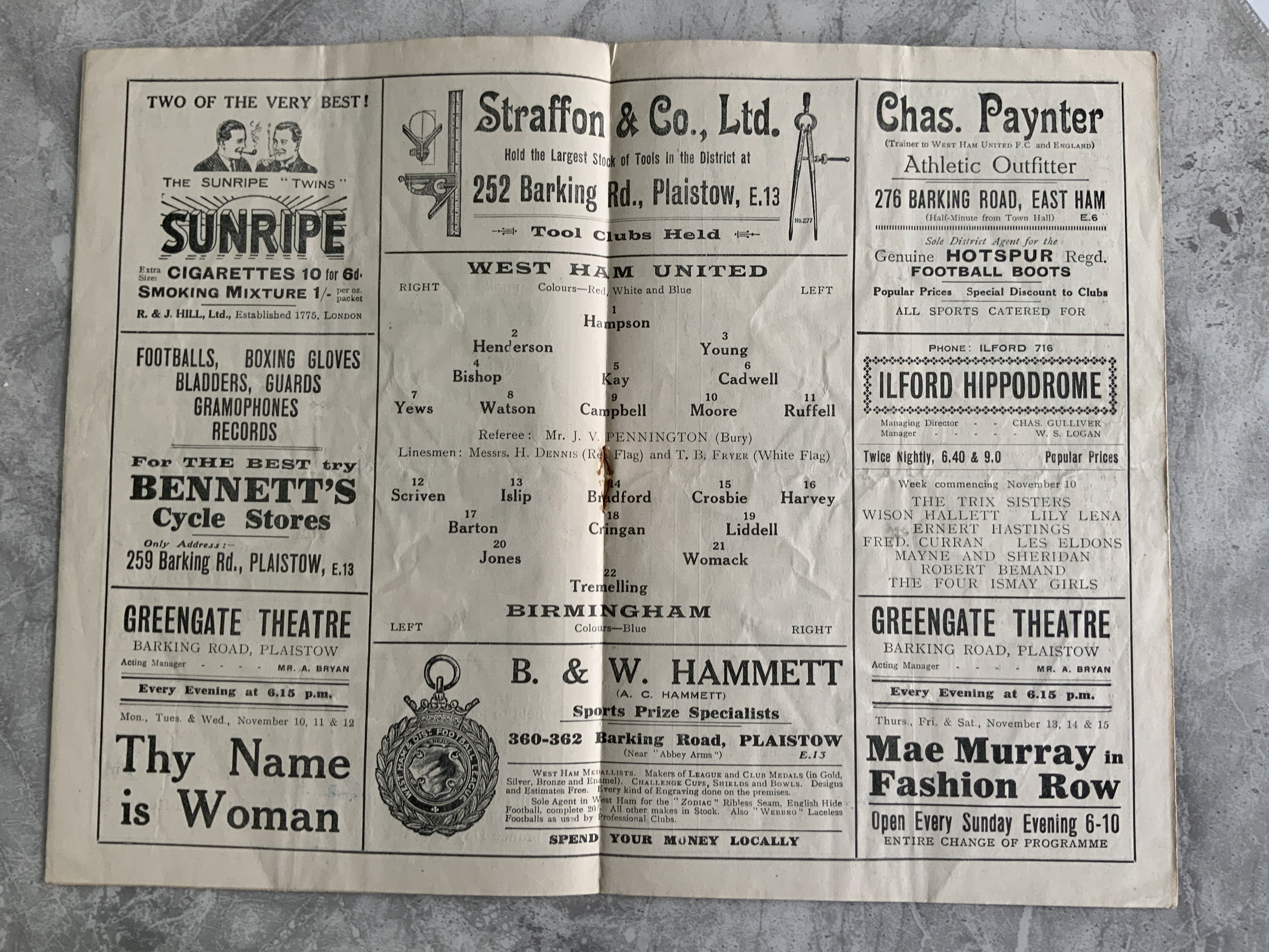 1924 - 1925 West Ham v Birmingham Football Programme: Excellent condition division one programme with no team changes.