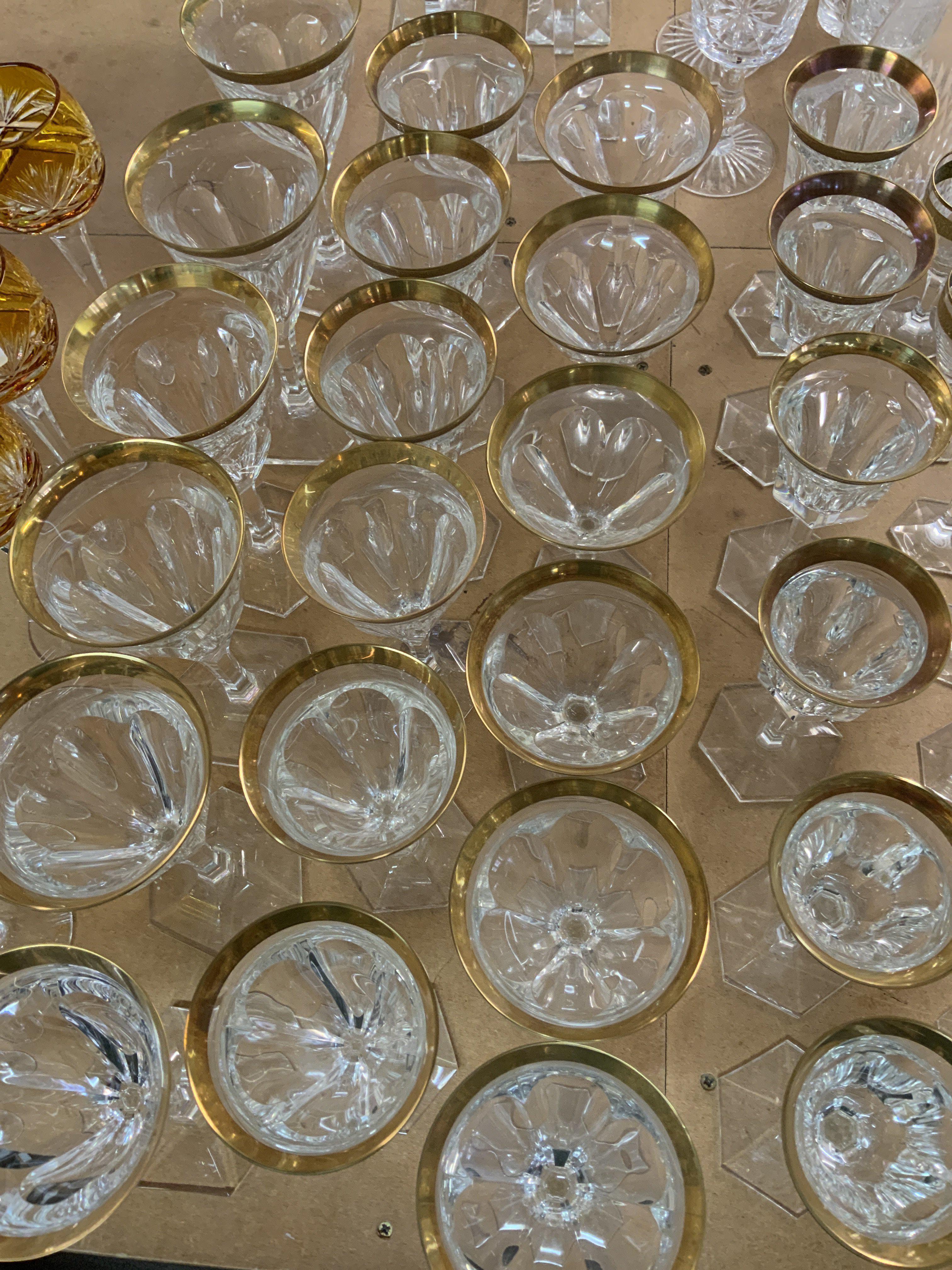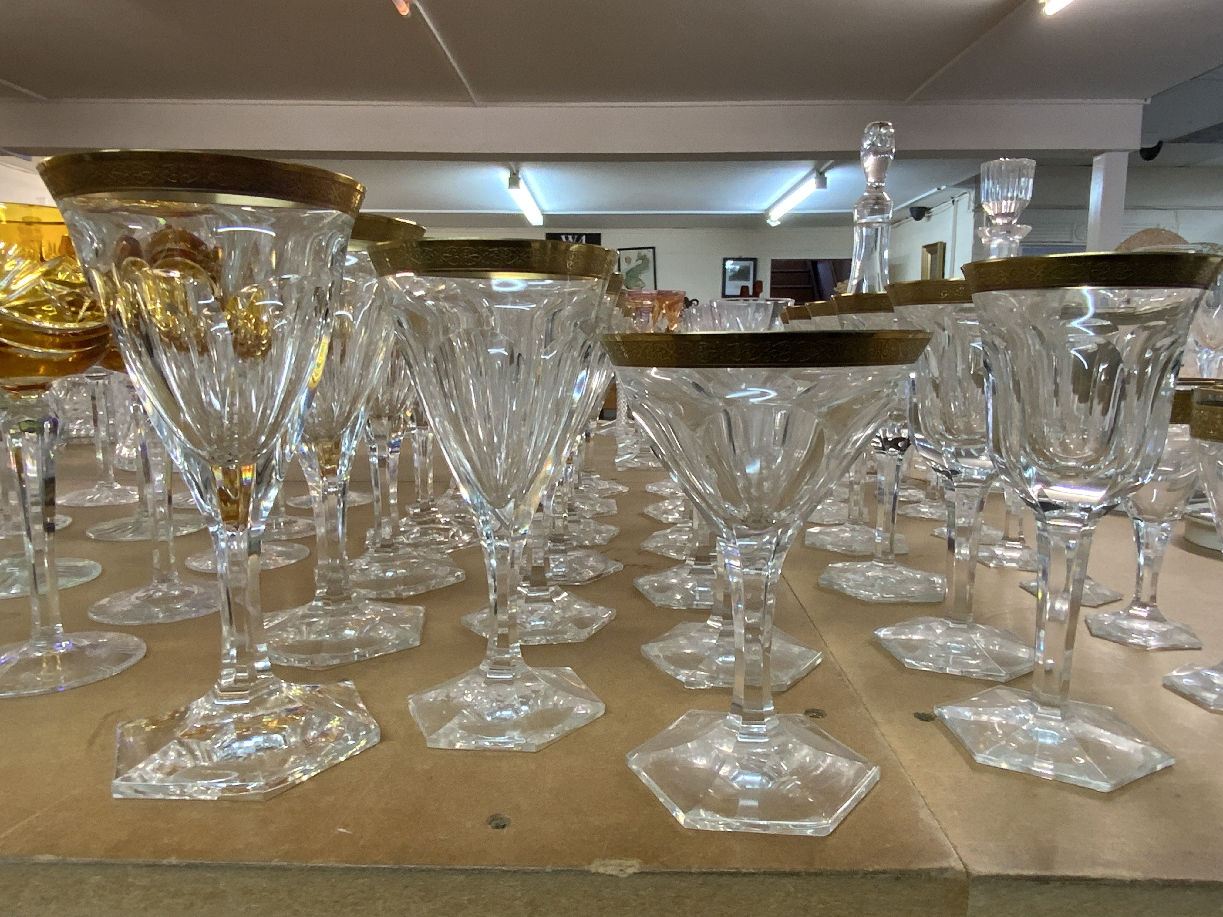 A suite of Moser crystal glassware in the Lady Hamilton pattern. With etched gold borders and flat cut decoration. 4 seats of 6 glasses. (D)