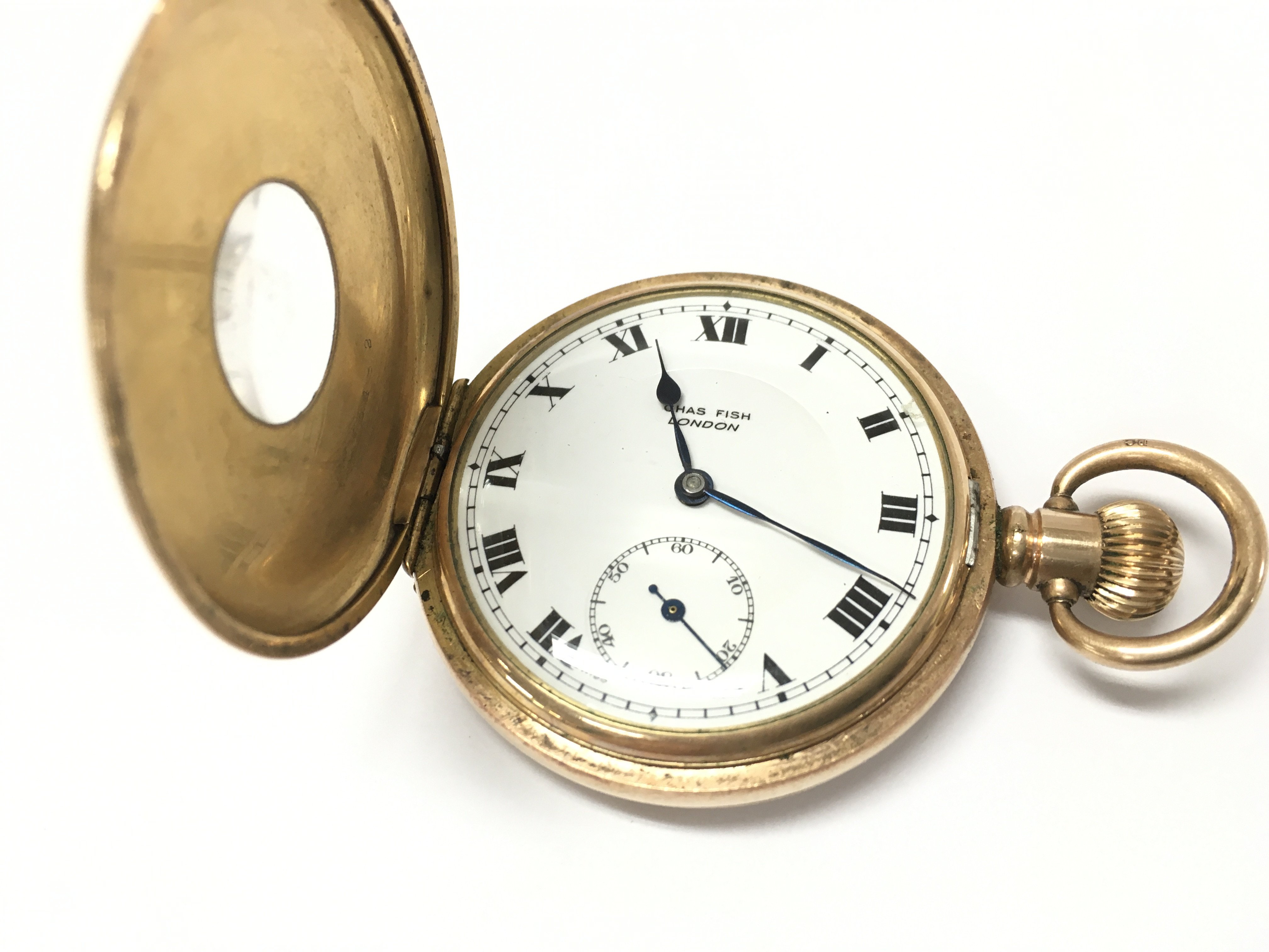 A gold plated pocket watch by Chas Fish London, seen working. Postage category A