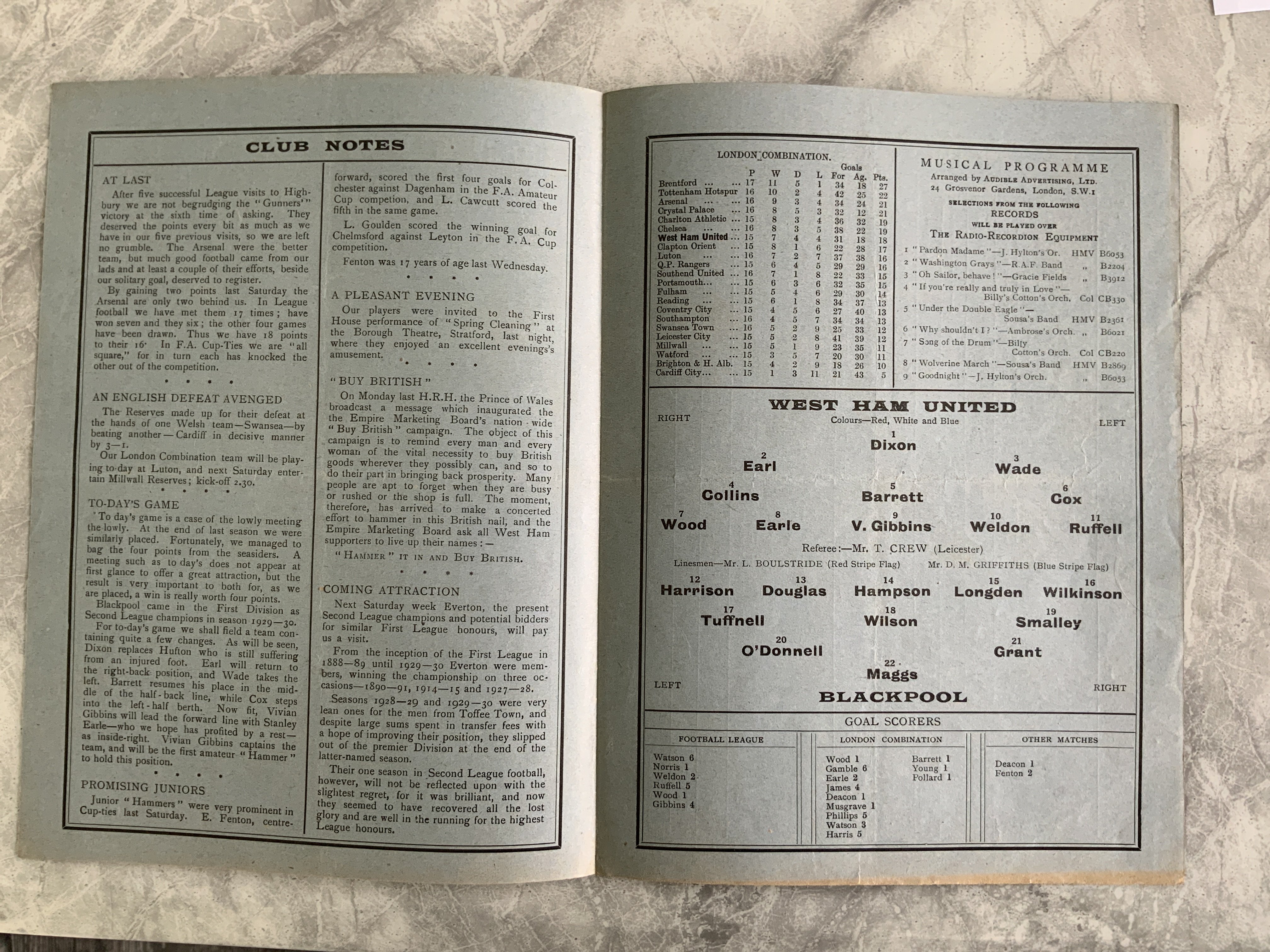 1931 - 1932 West Ham v Blackpool Football Programme: Excellent condition division one programme with no team changes. Light fold.