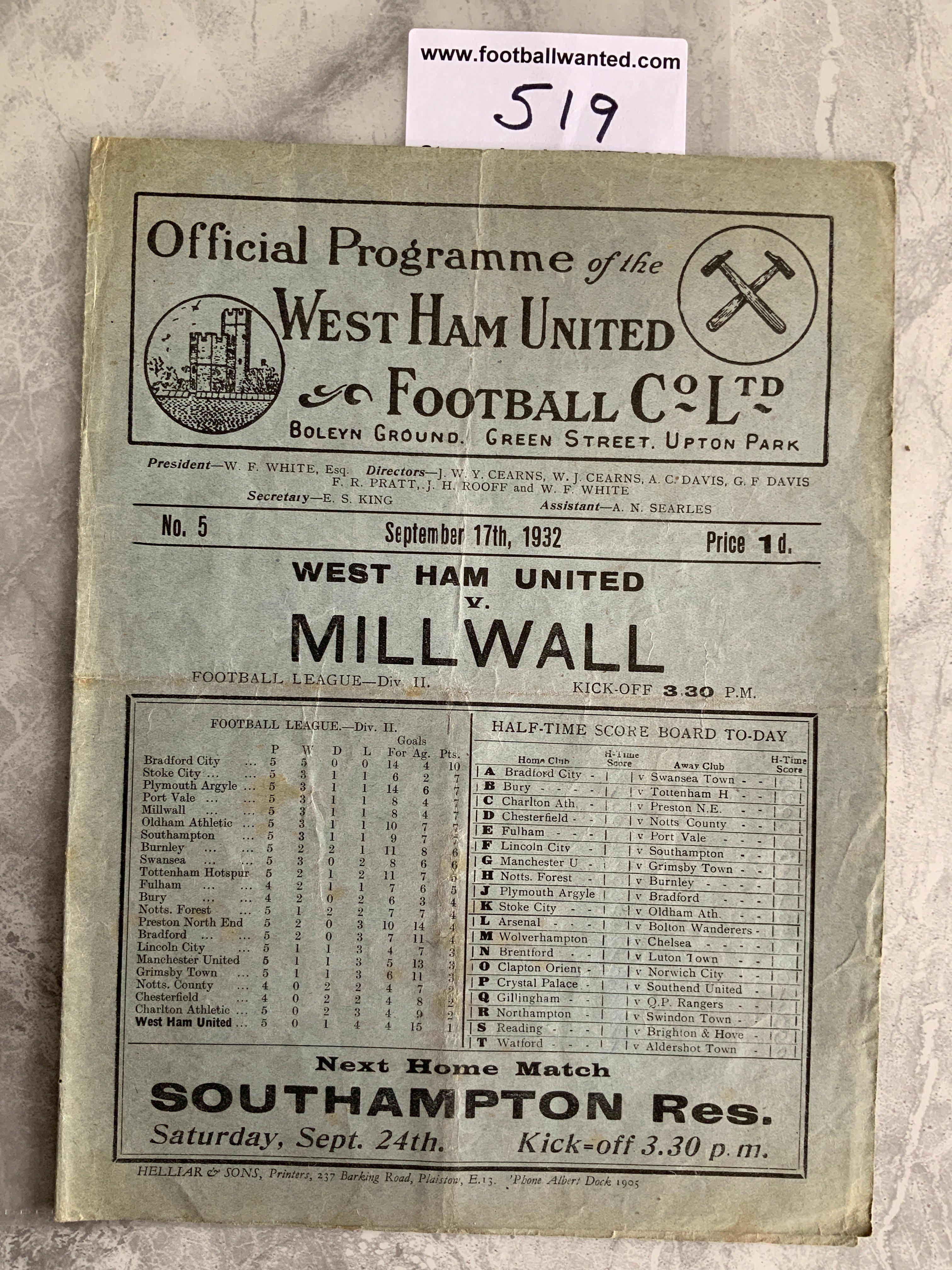 1932 - 1933 West Ham v Millwall Football Programme: Fair/good condition division two programme with no team changes. Folding.
