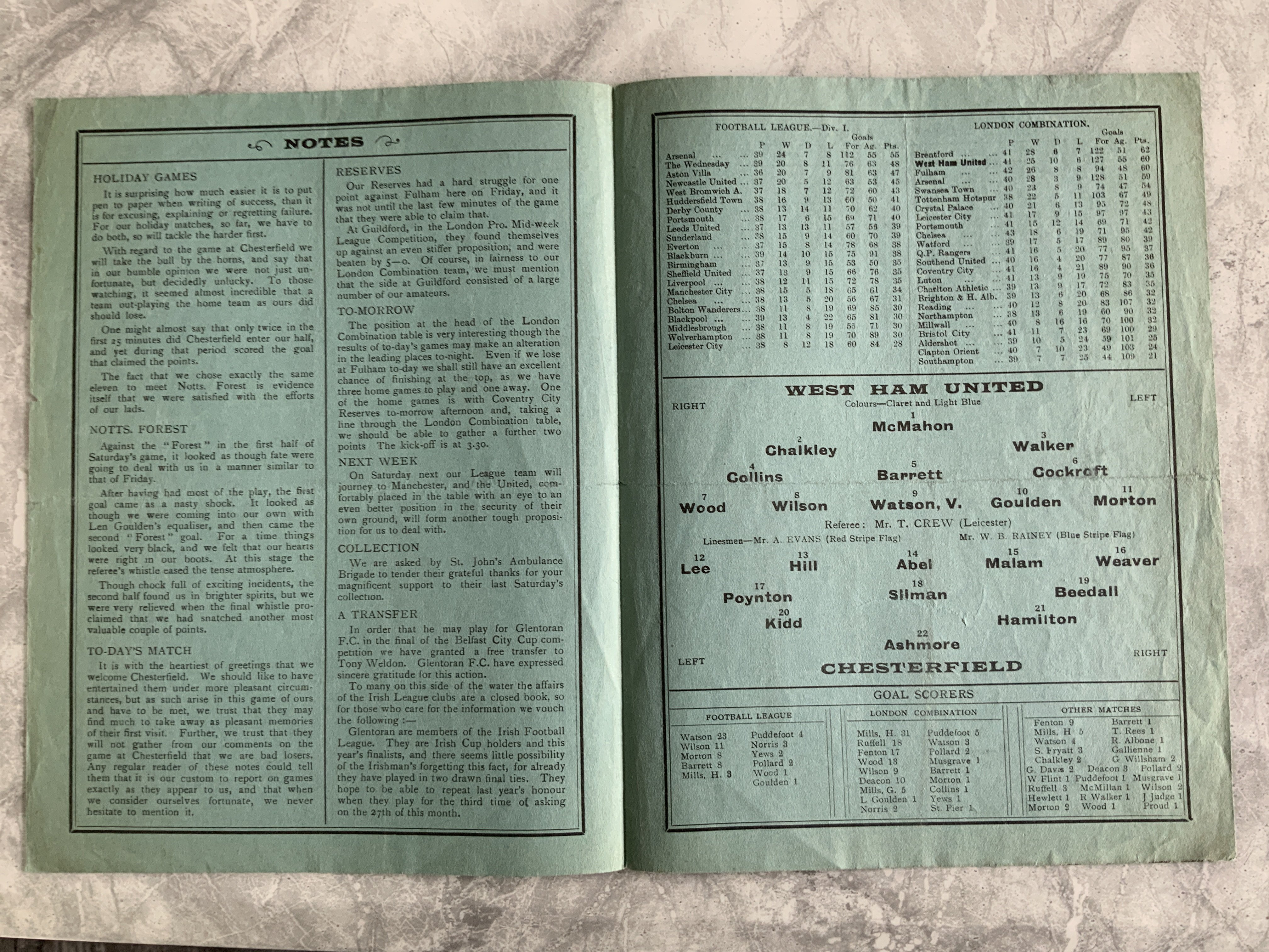 1932 - 1933 West Ham v Chesterfield Football Programme: Very good condition division two programme with no team changes. Fold.