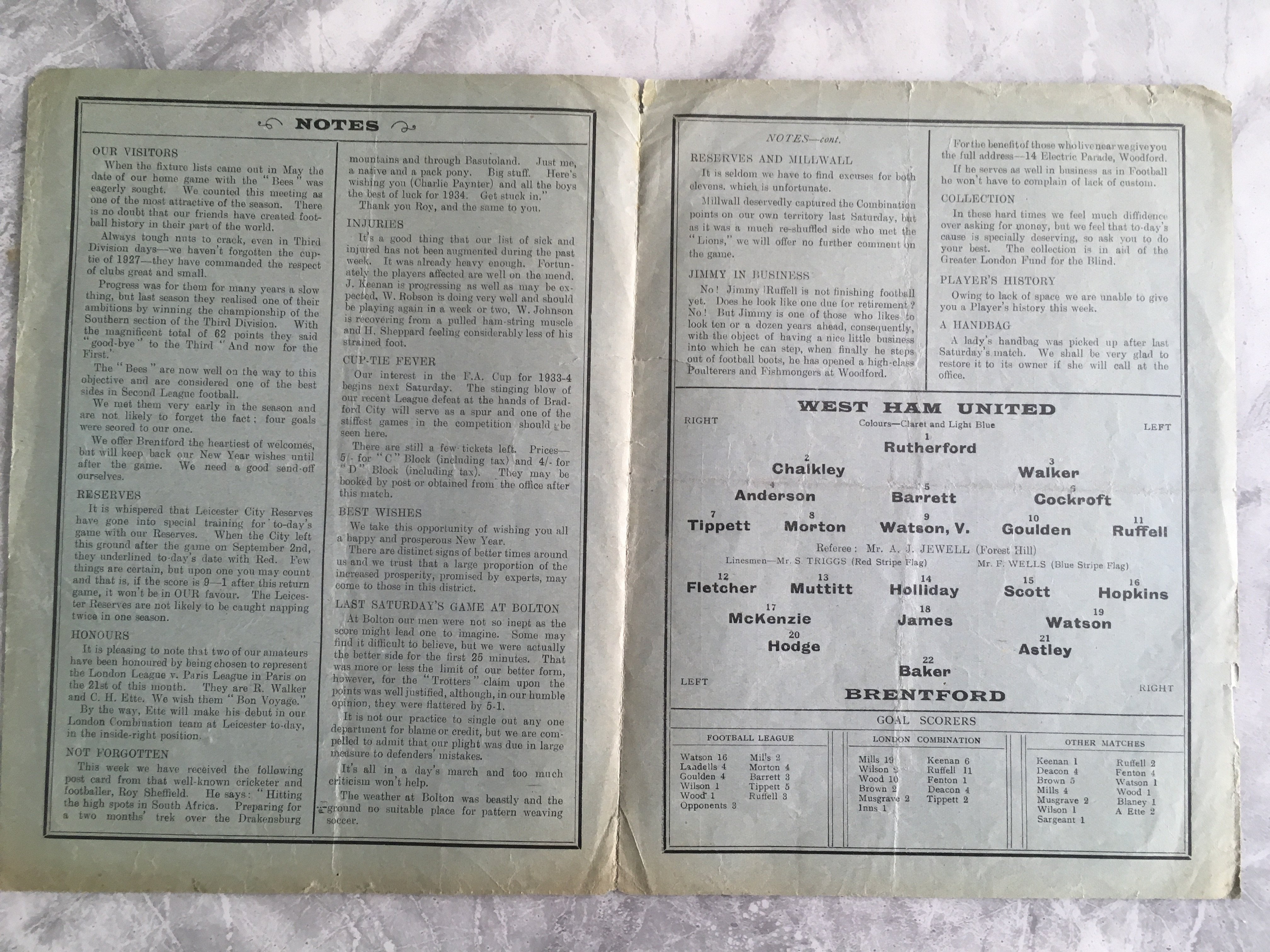 1933 - 1934 West Ham v Brentford Football Programme: Fair/good condition division two programme with no team changes. Folding and small tear.