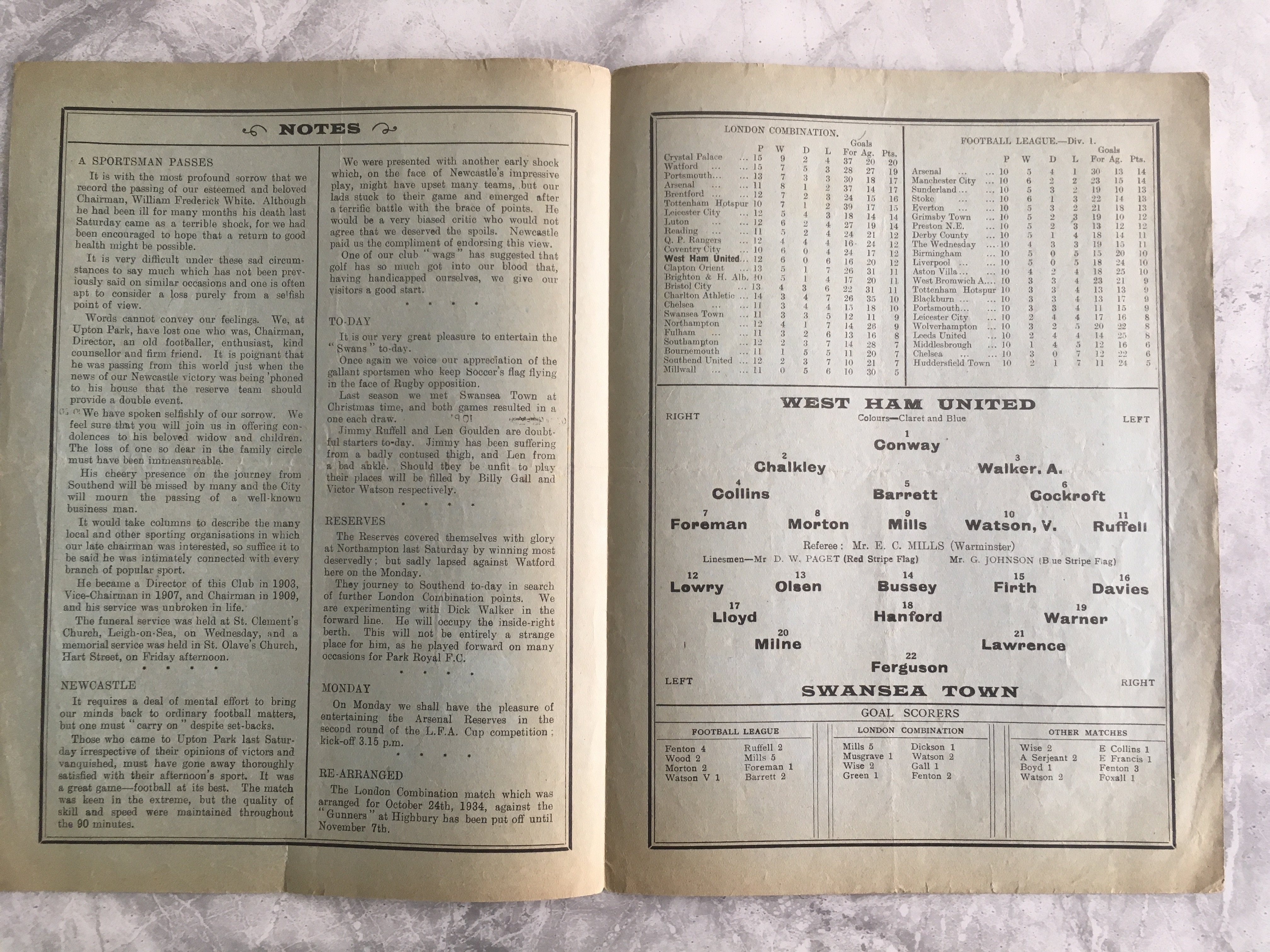 1934 - 1935 West Ham v Swansea Football Programme: Fair/good condition division two programme with no team changes. Tiny tear to border.