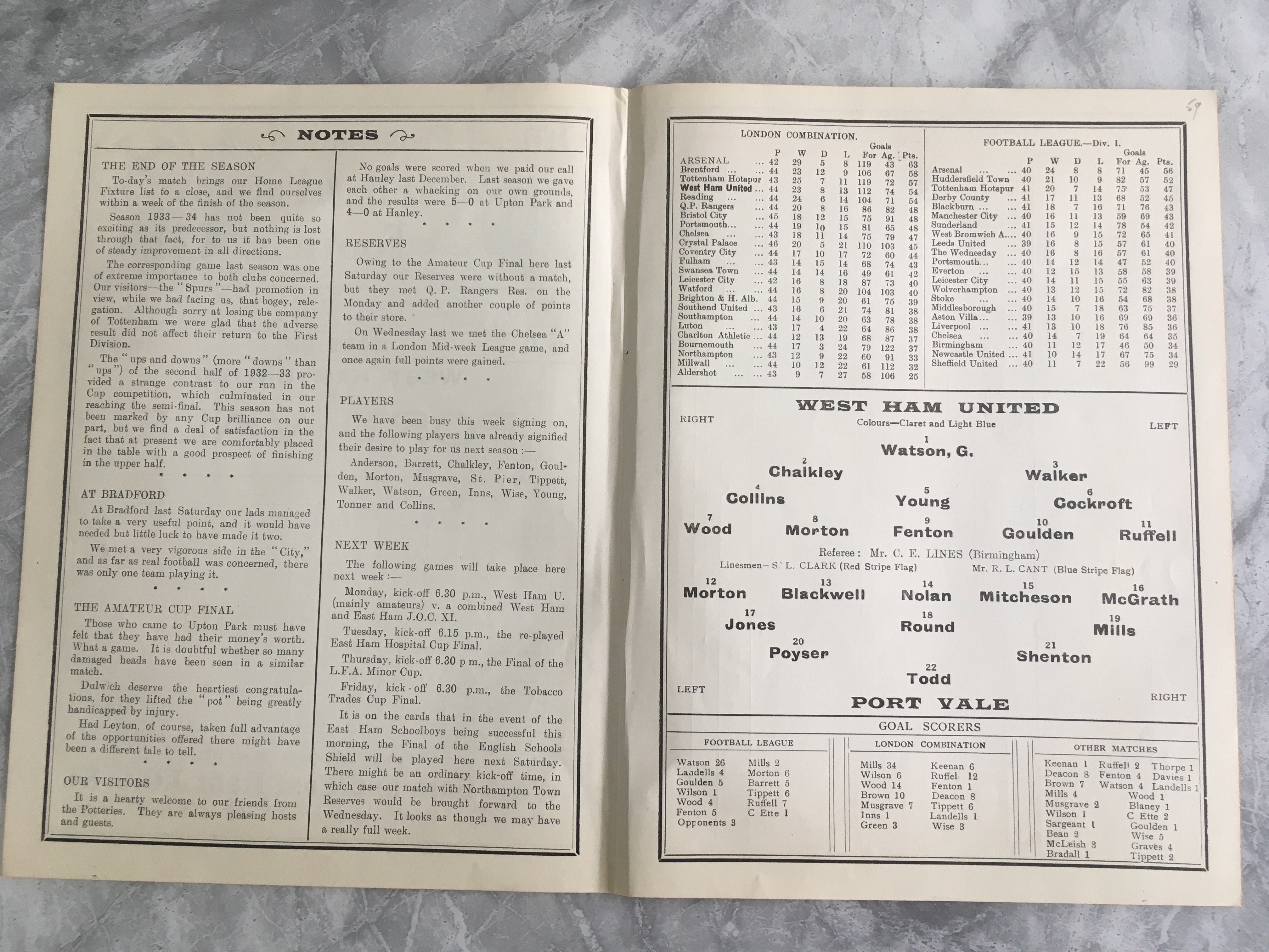 1933 - 1934 West Ham v Port Vale Football Programme: Excellent condition ex bound white division two programme with no team changes.