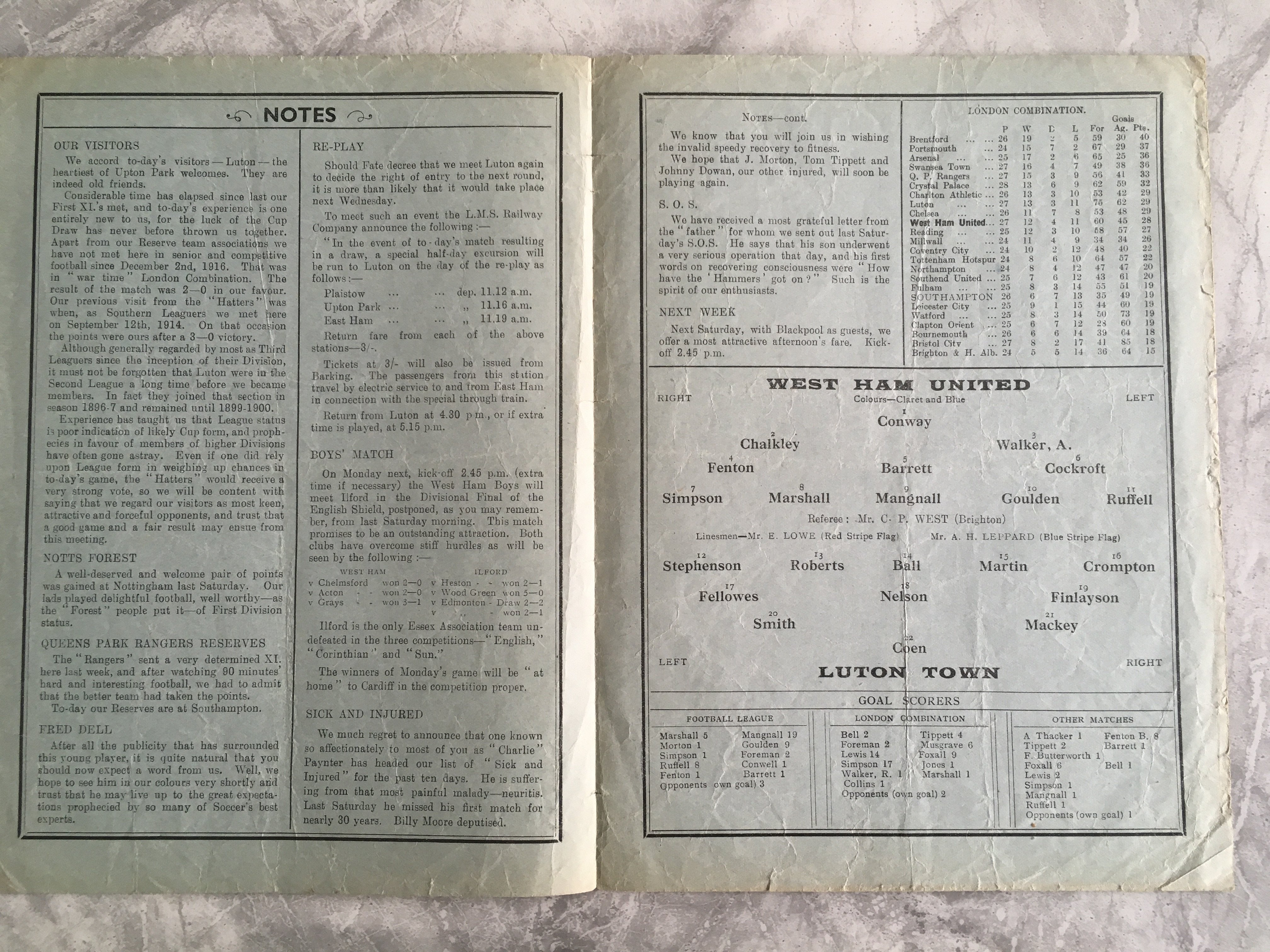 1935 - 1936 West Ham v Luton Football Programme: Good condition FA Cup programme with no team changes. Folding.