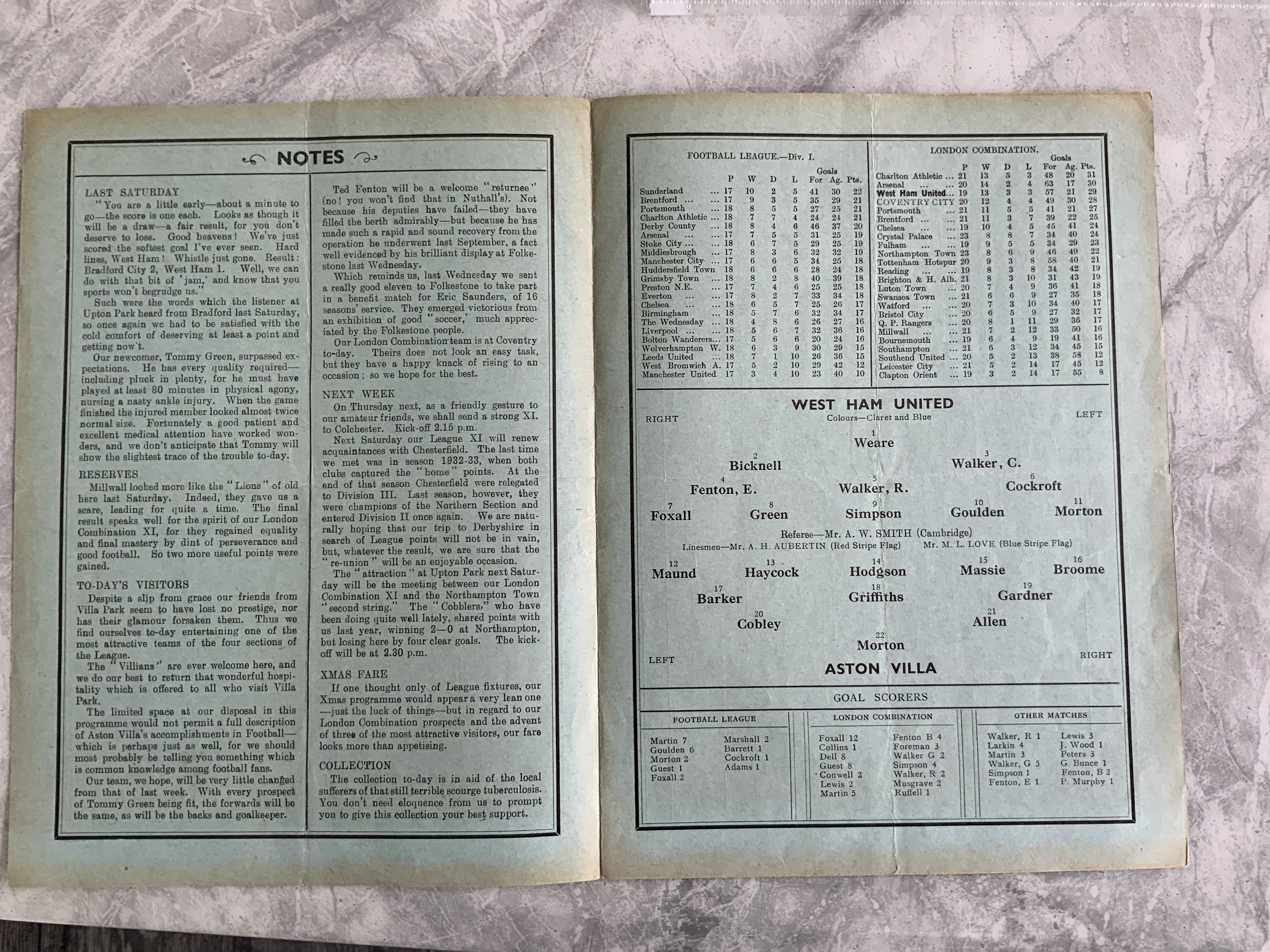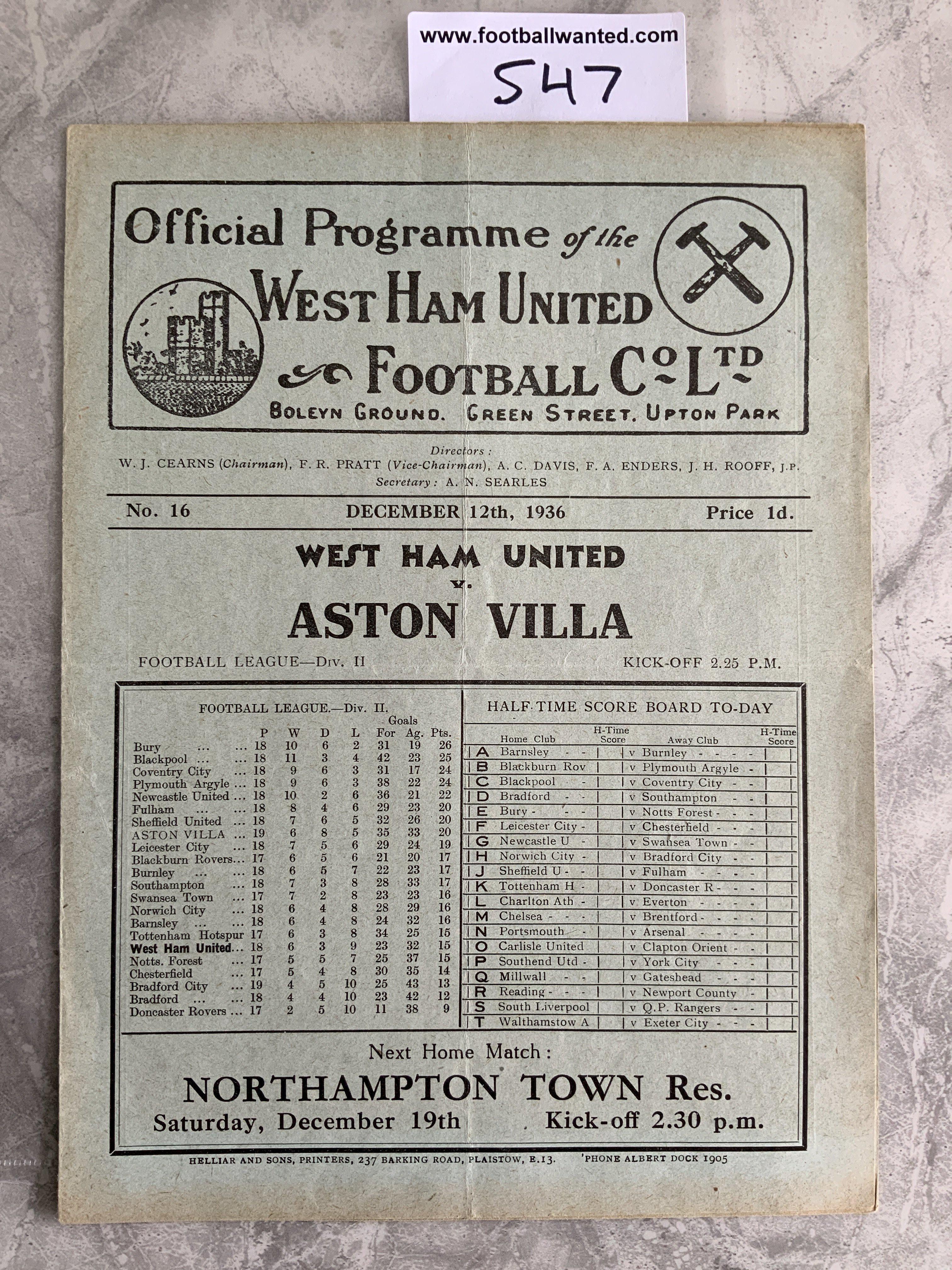 1936 - 1937 West Ham v Aston Villa Football Programme: Very good condition division two programme with no team changes. Folding.
