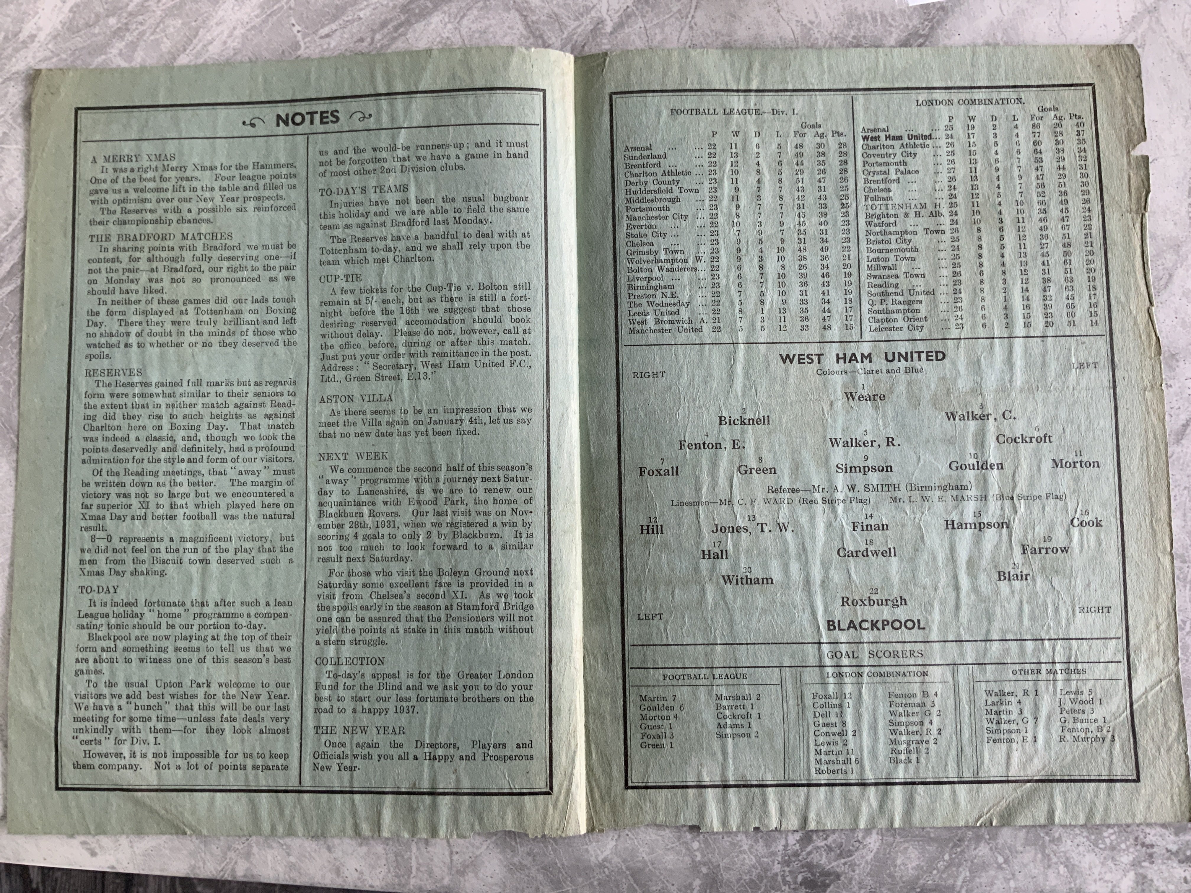 1936 - 1937 West Ham v Blackpool Football Programme: Fair/good condition division two programme with no team changes. Creasing.