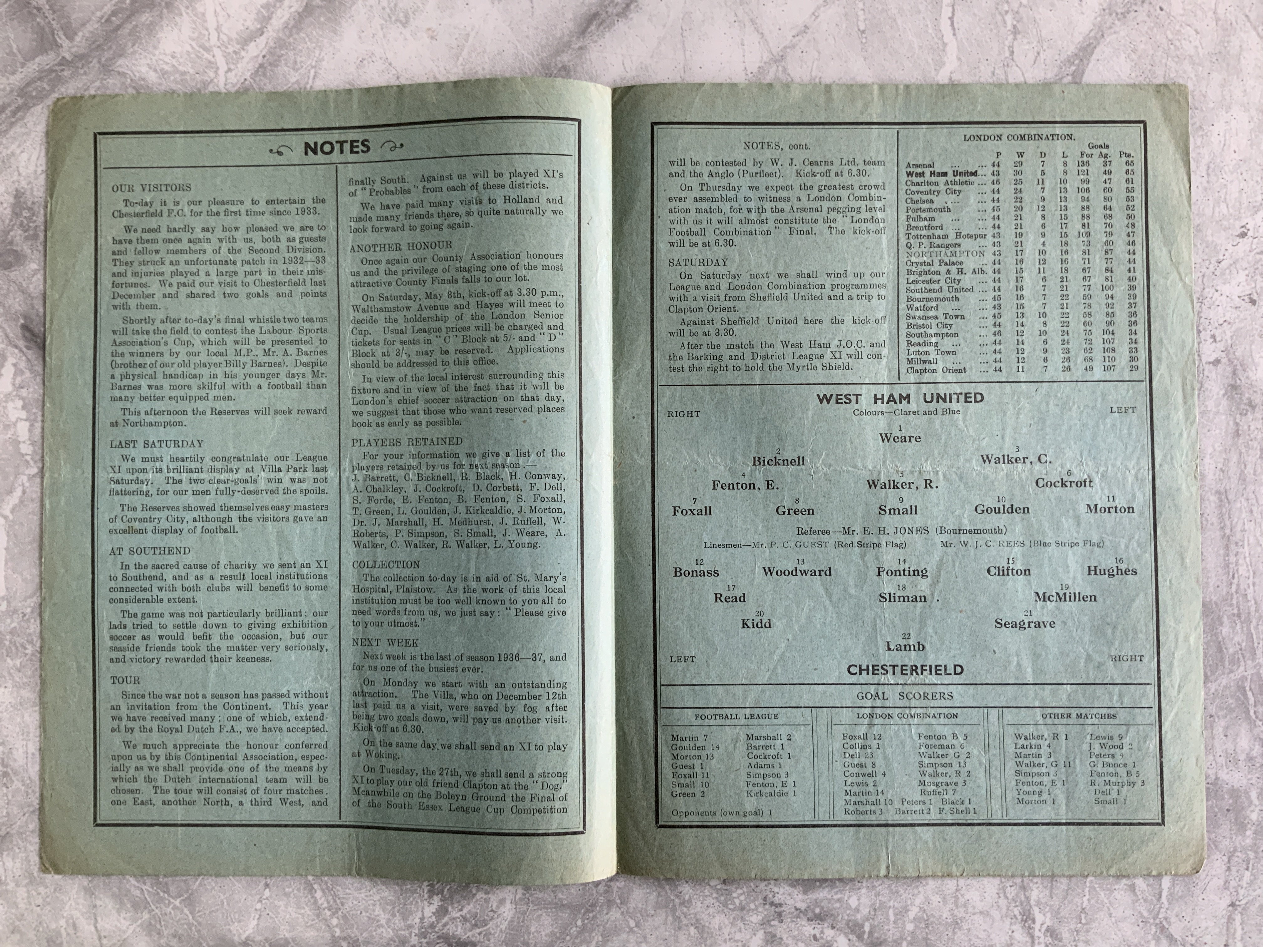 1936 - 1937 West Ham v Chesterfield Football Programme: Good condition division two programme with no team changes.