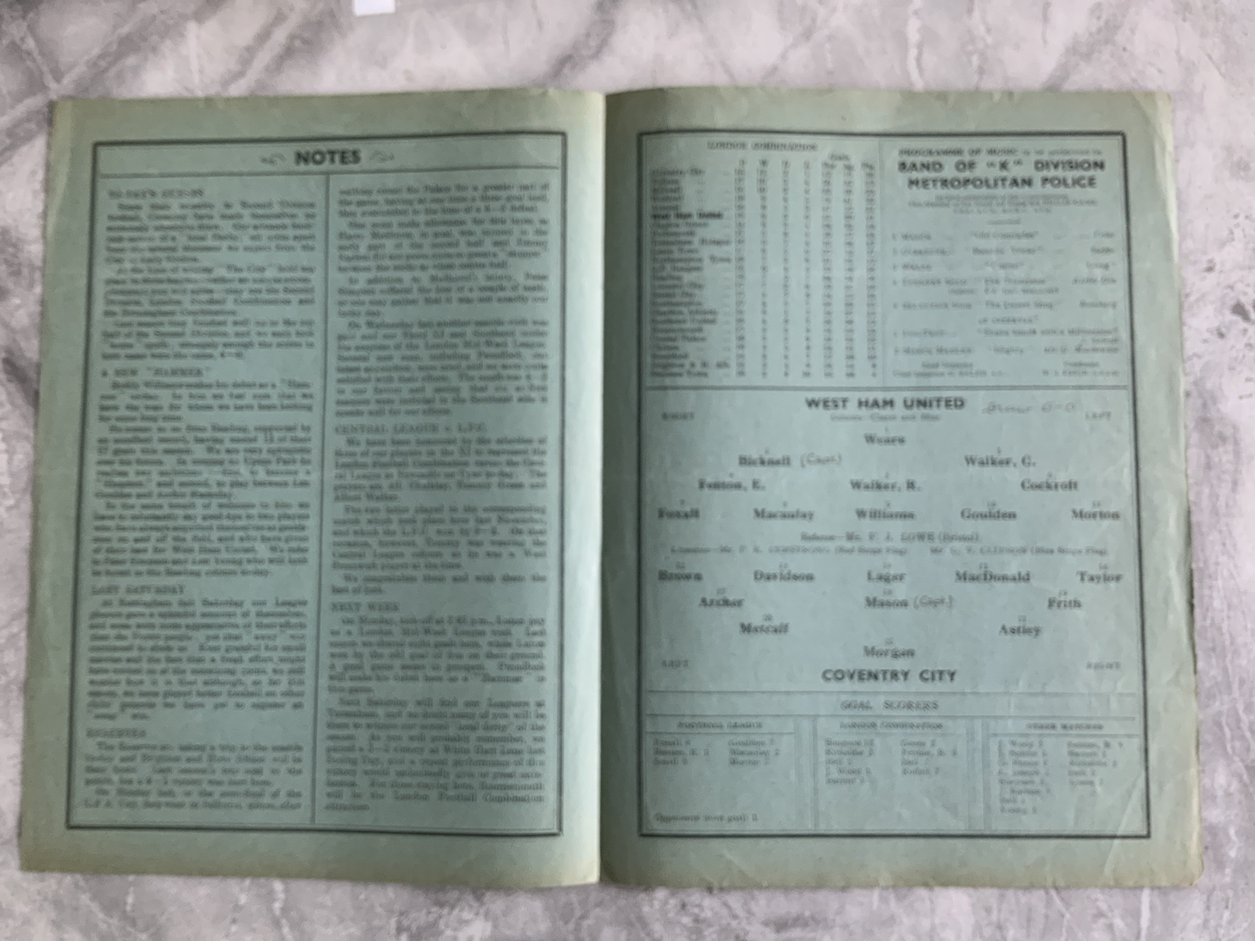 1937 - 1938 West Ham v Coventry Football Programme: Very good condition division two programme with no team changes. Pencilled results inside .