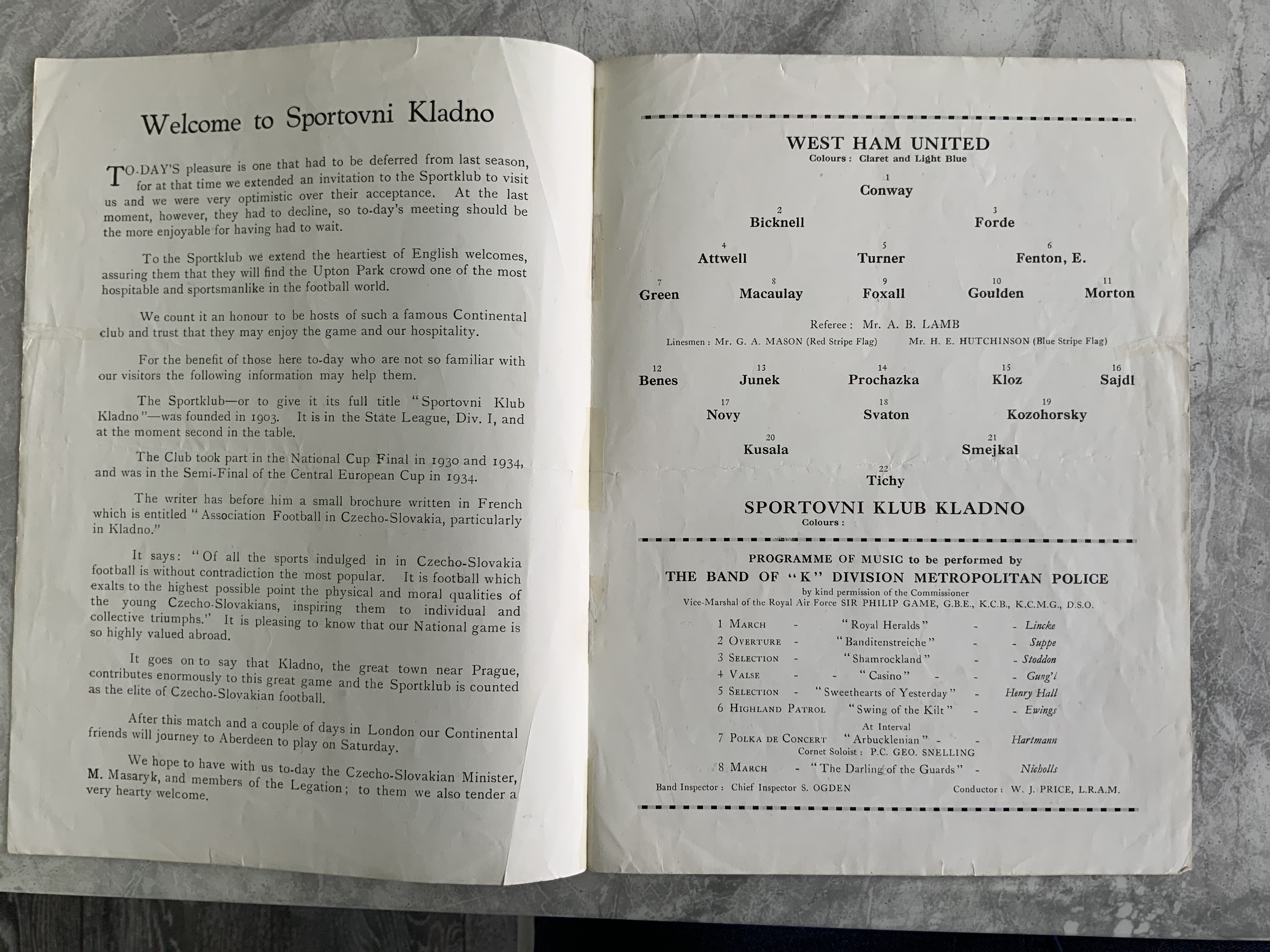 1937 - 1938 West Ham v Sportovni Klub Kladno Football Programme: Good condition friendly programme v the Czechoslovakian team with no team changes.