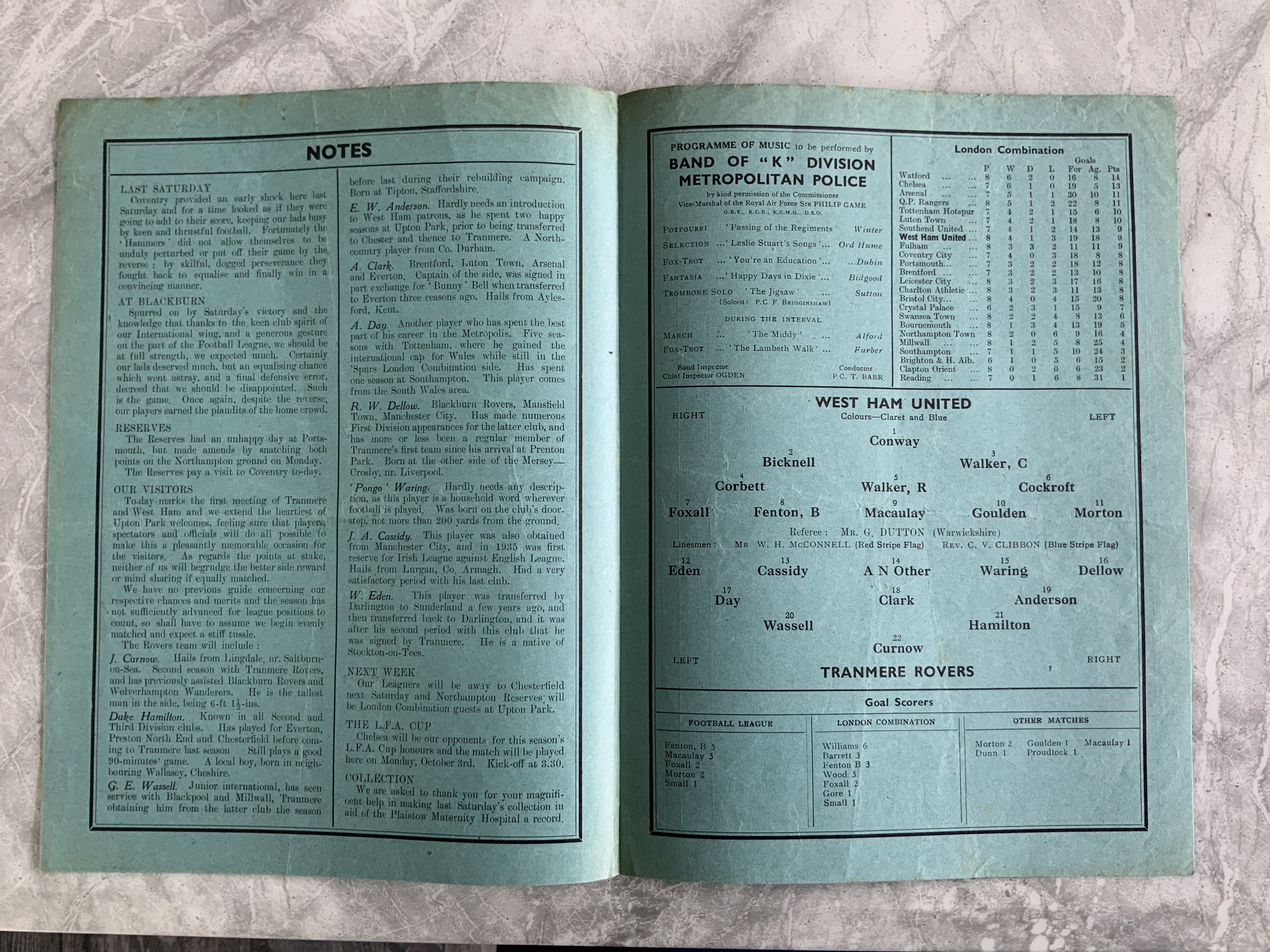 1938 - 1939 West Ham v Tranmere Rovers Football Programme: Very good condition division two programme with no team changes.