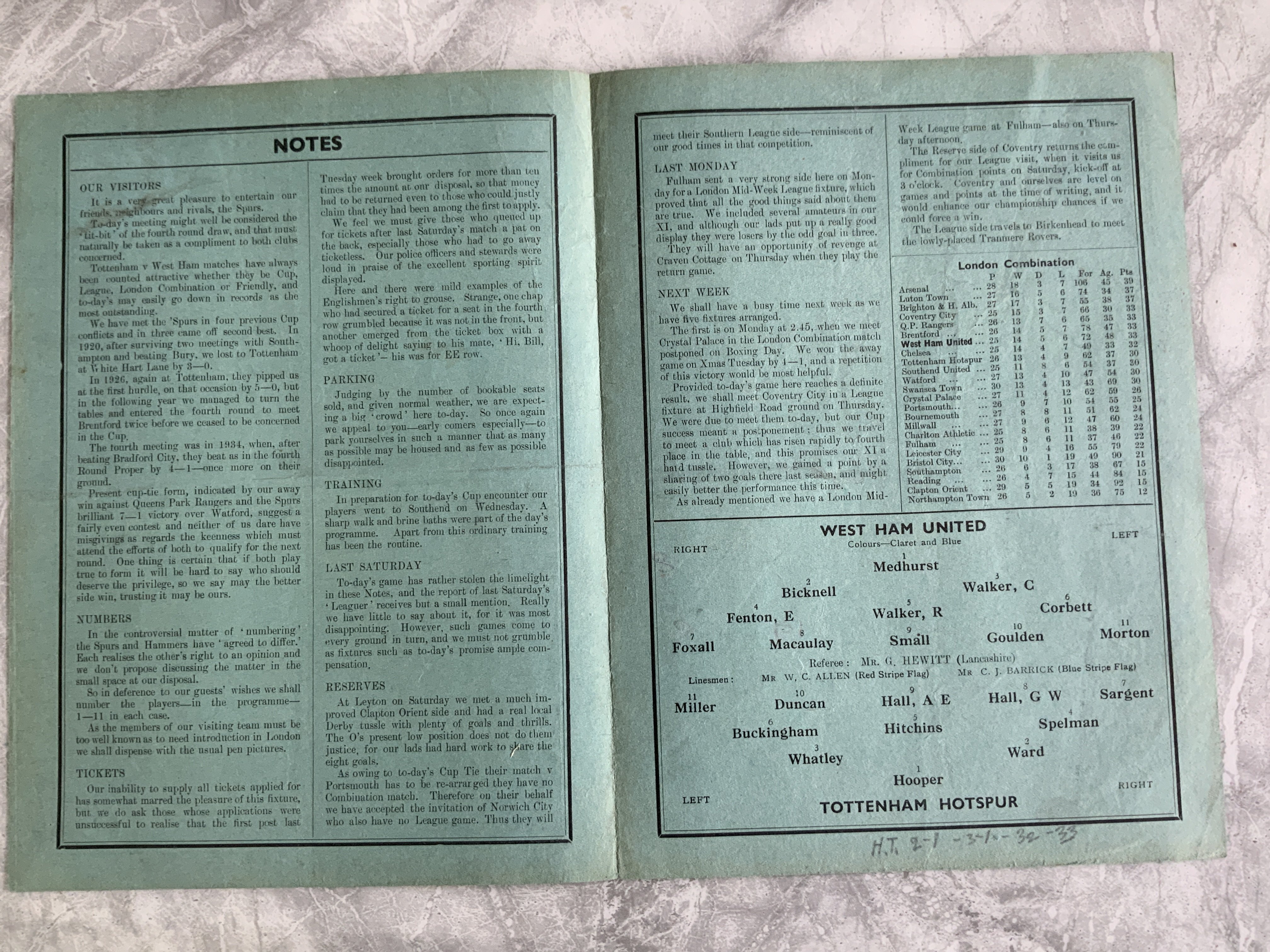 1938 - 1939 West Ham v Tottenham Football Programme: Good condition FA Cup programme with no team changes. Pencilled number to corner.