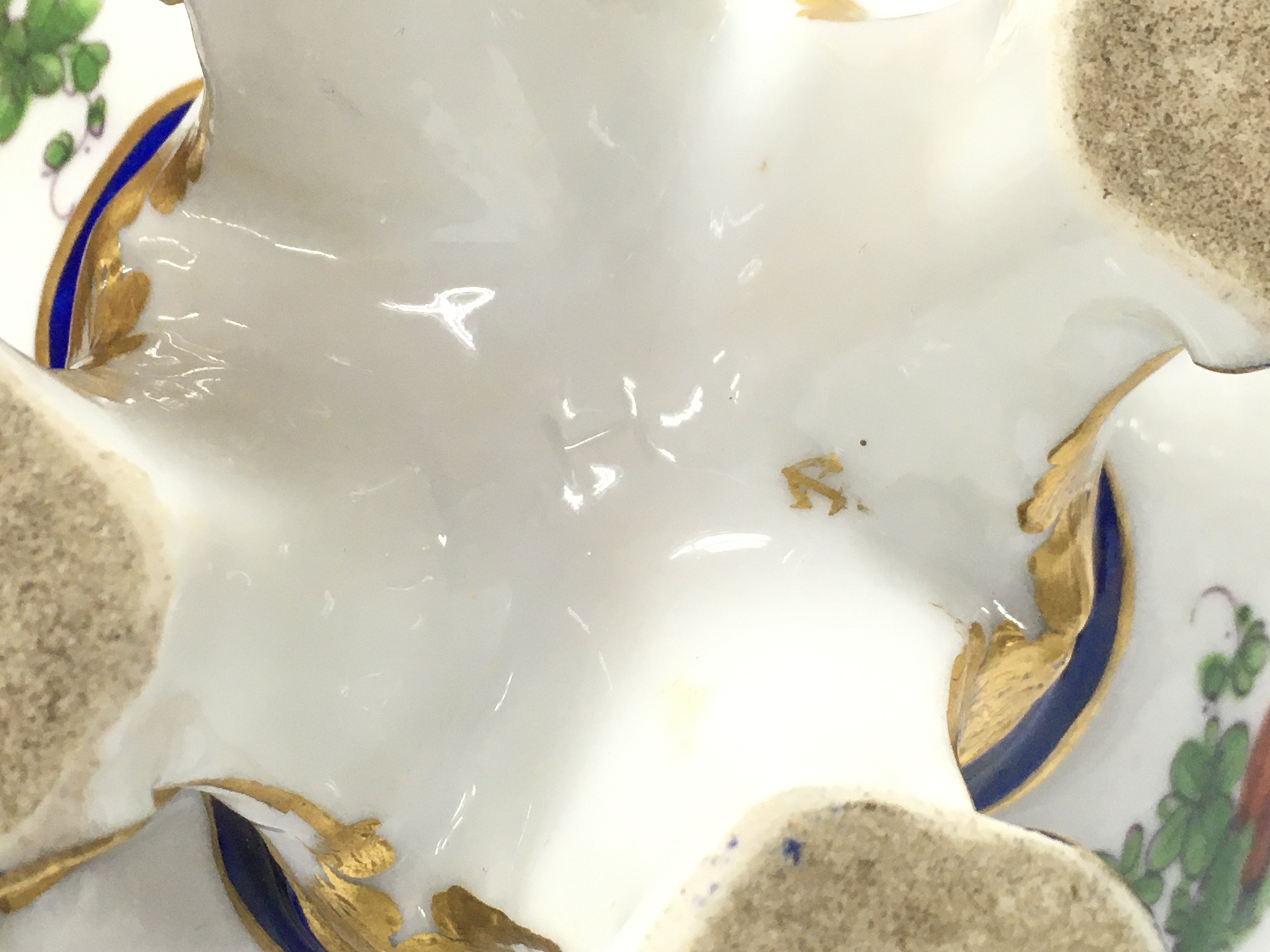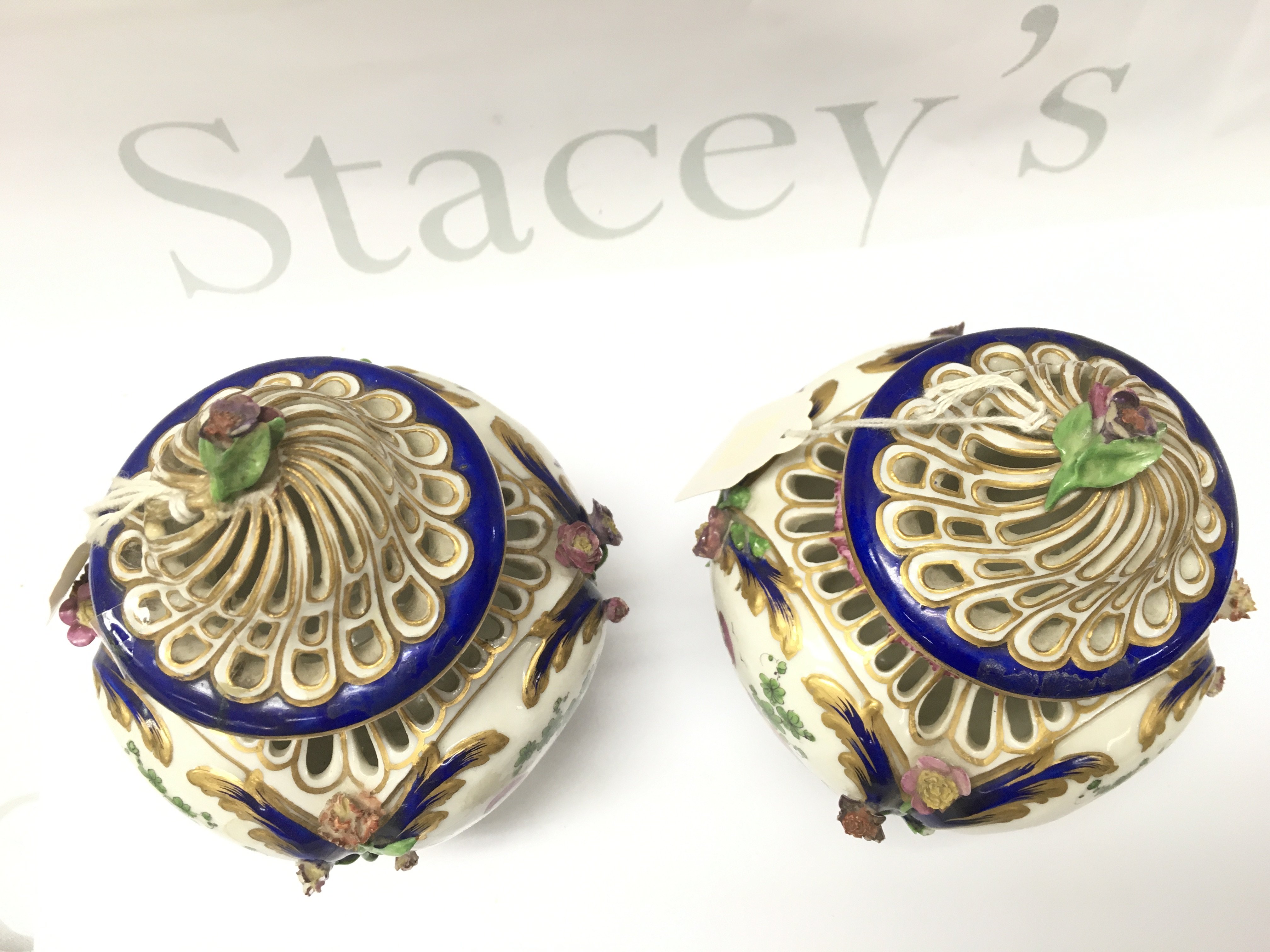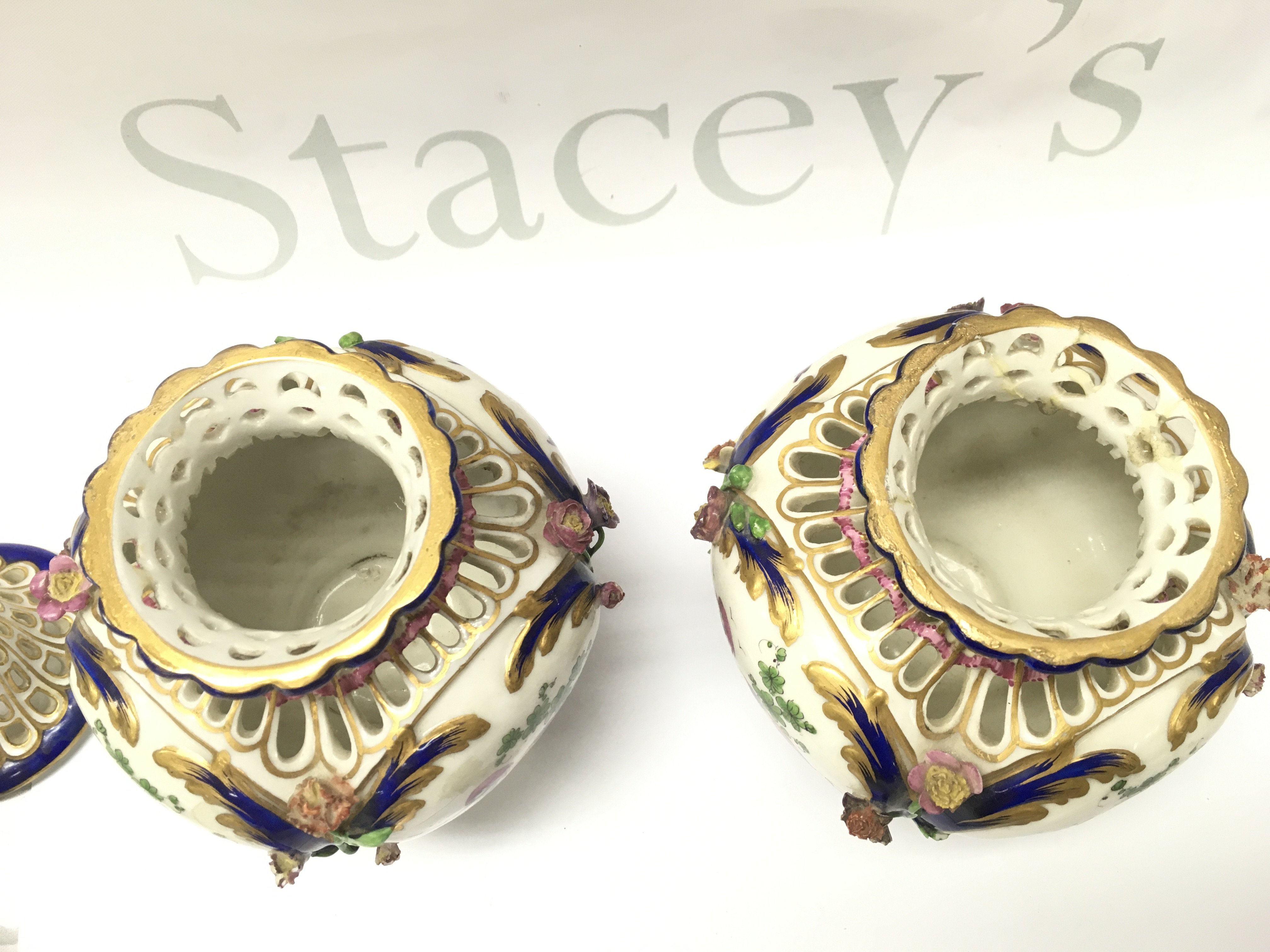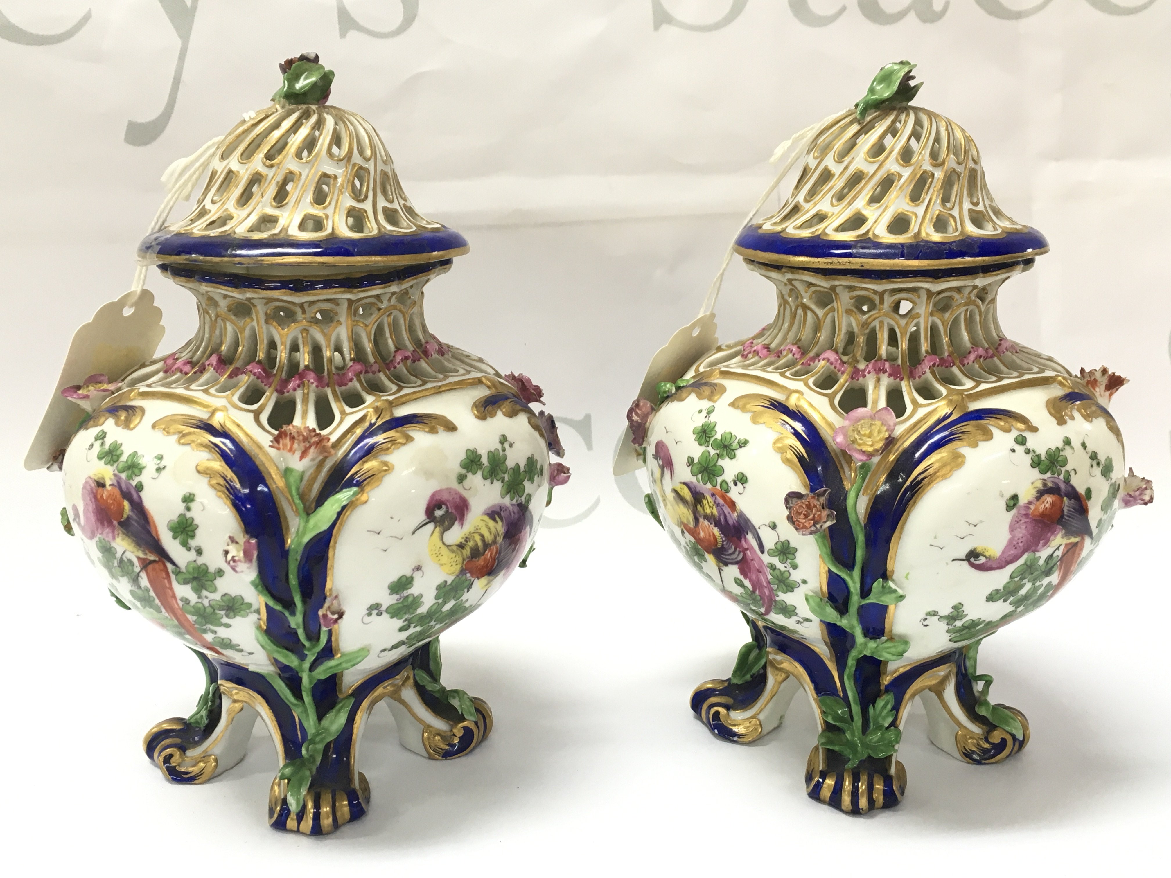 A pair of small 19th century pot porri vases in the style of Vincennes with hand painted mythical bird decoration. Some restoration. Marked H at base. This lot cannot be posted
