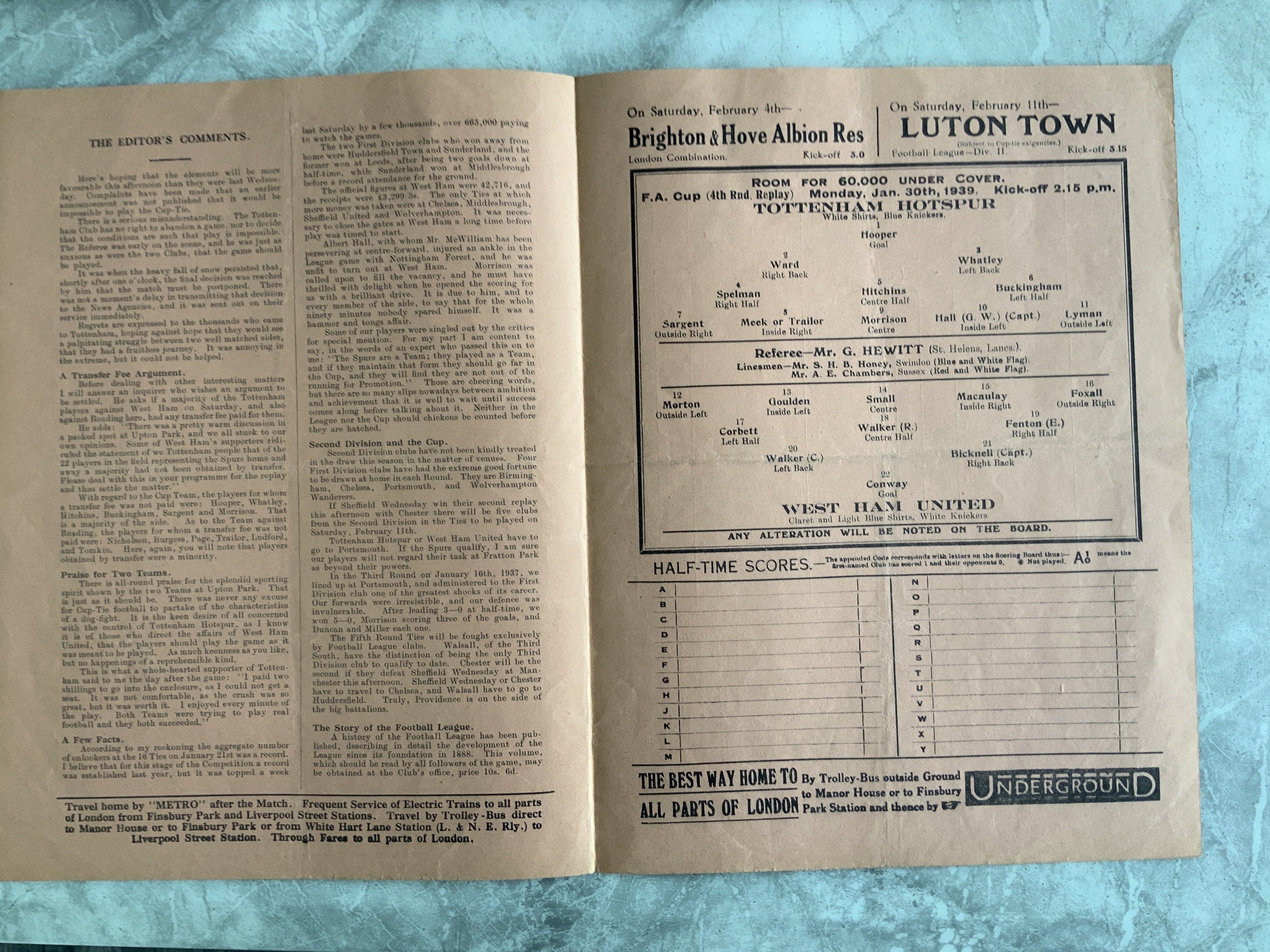 1938 - 1939 Tottenham v West Ham Football Programme: Good condition FA Cup replay programme with no team changes.