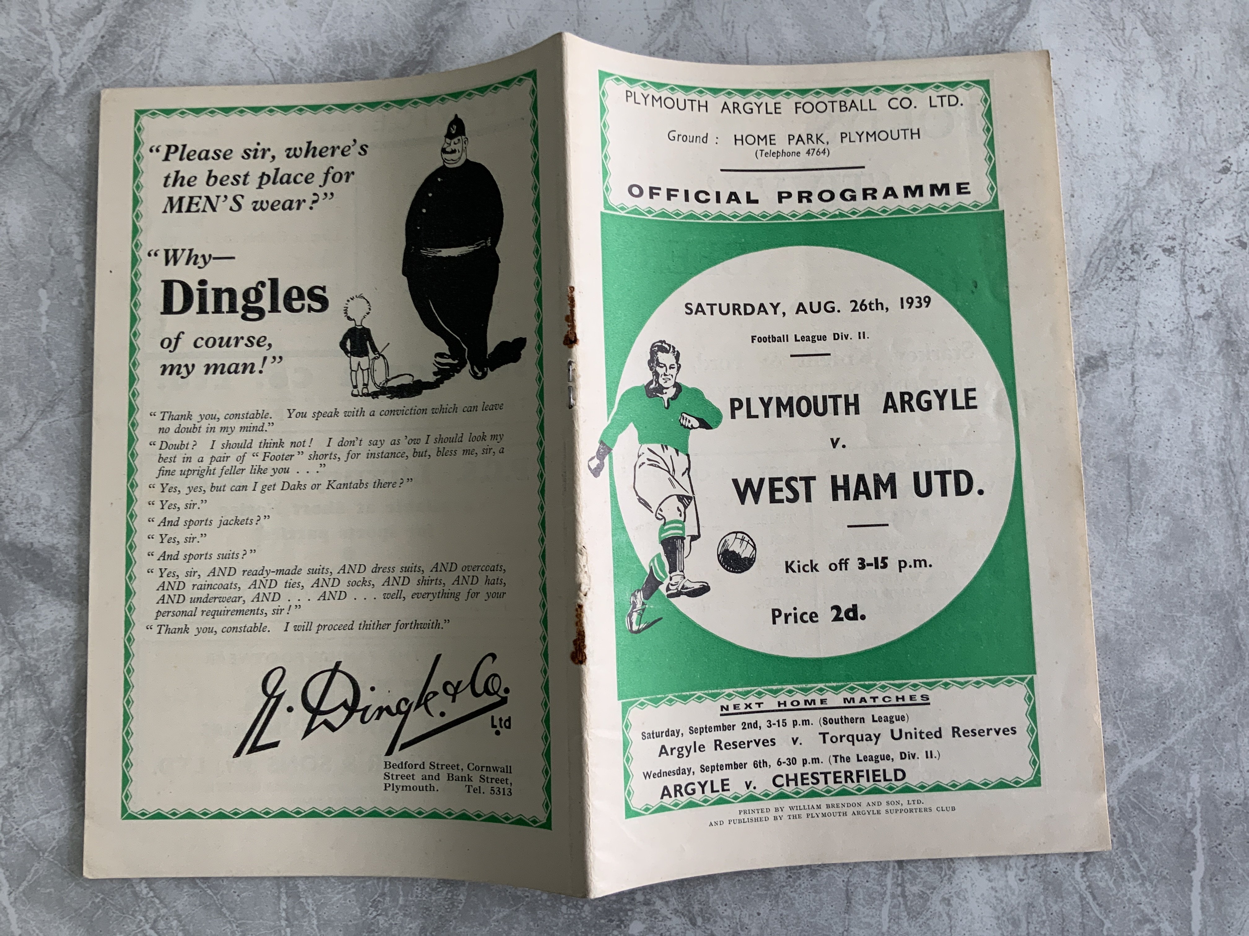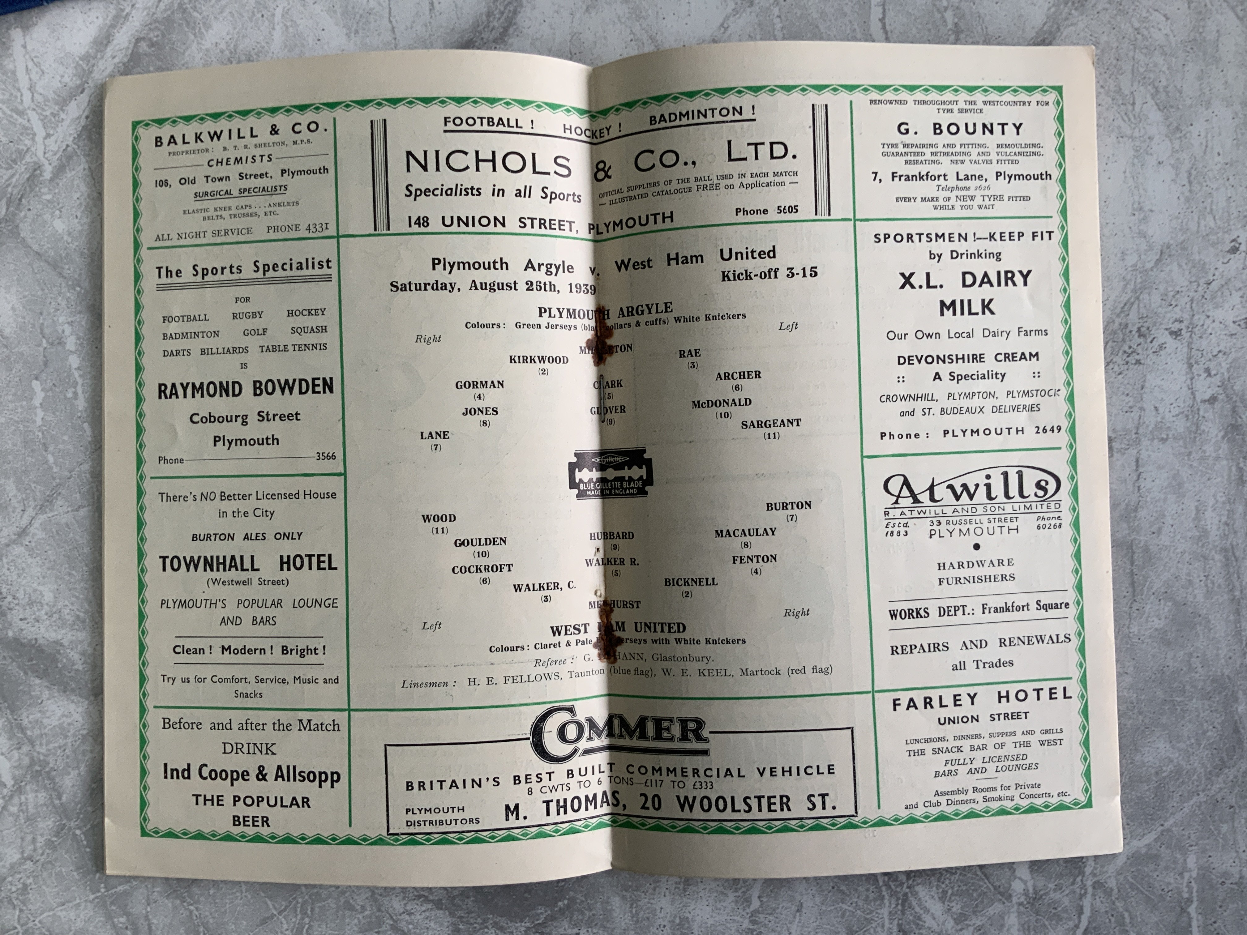 1939 - 1940 Plymouth Argyle v West Ham Football Programme: Very good condition rare defunct season programme with no team changes. Rusty staples removed and re stapled. Dated 26 8 1939 which was West Hams only away match before war broke out.