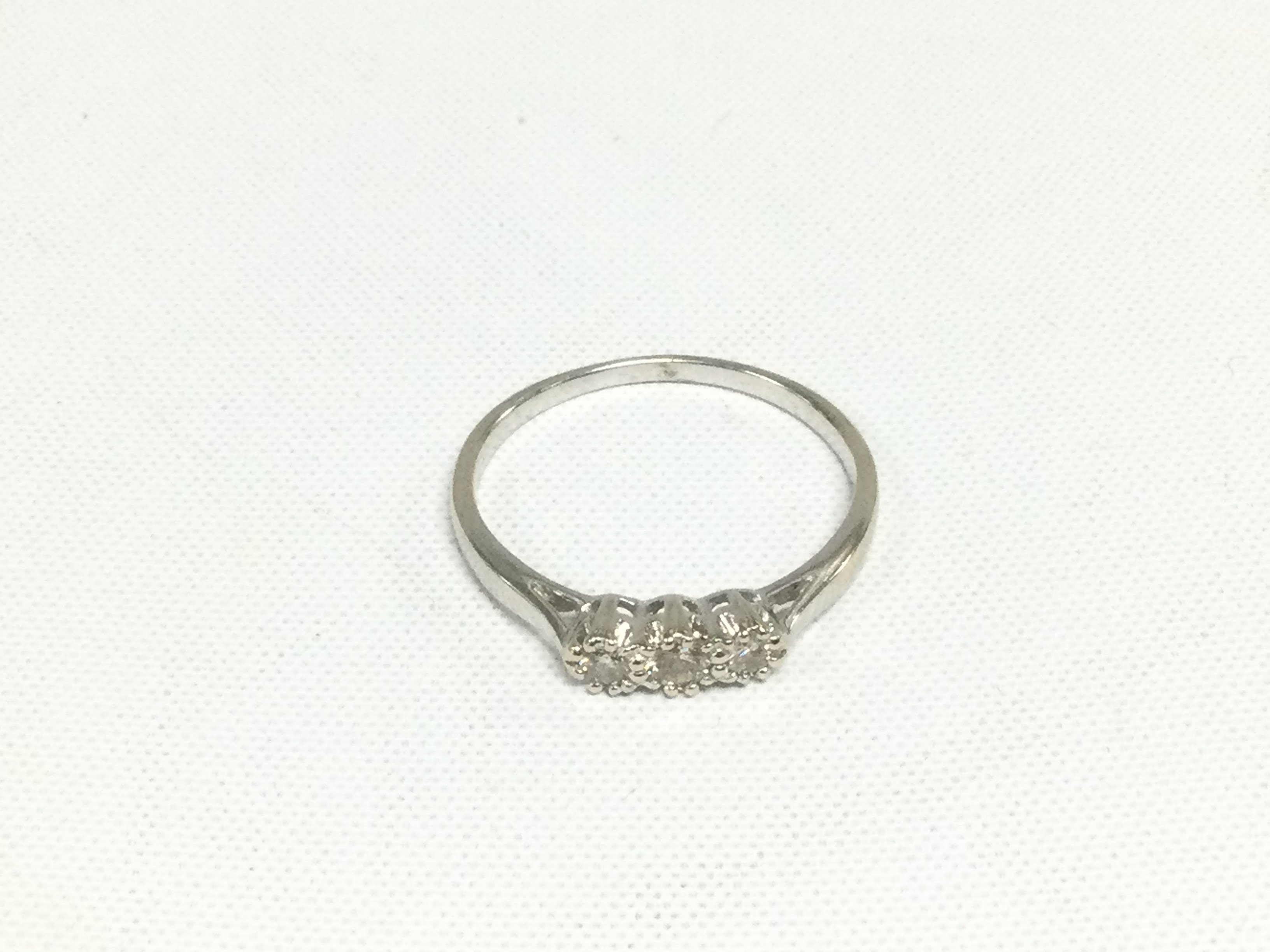 An 18ct white gold three stone diamond ring, approx 2.7g and approx size S. Shipping category A.