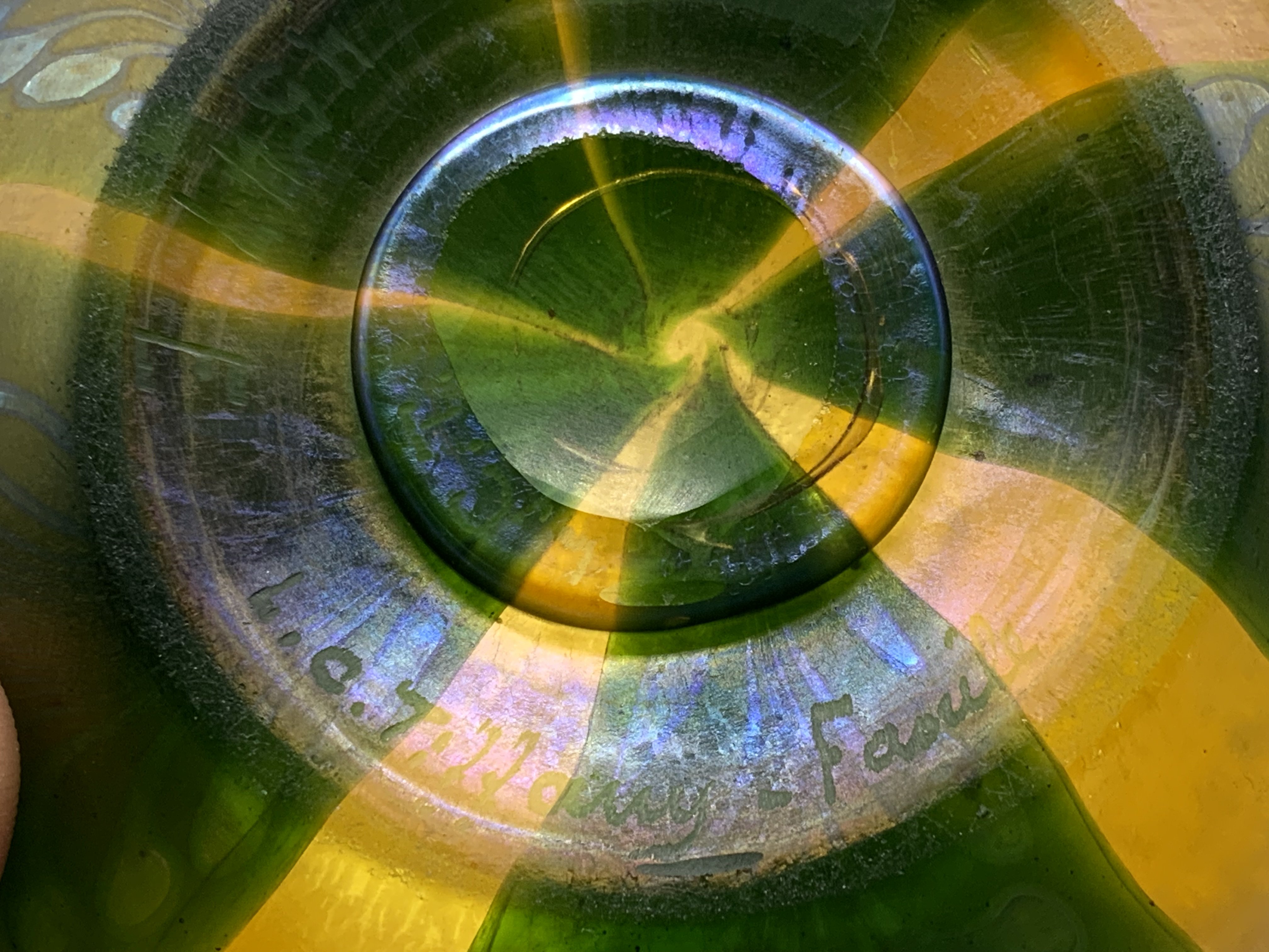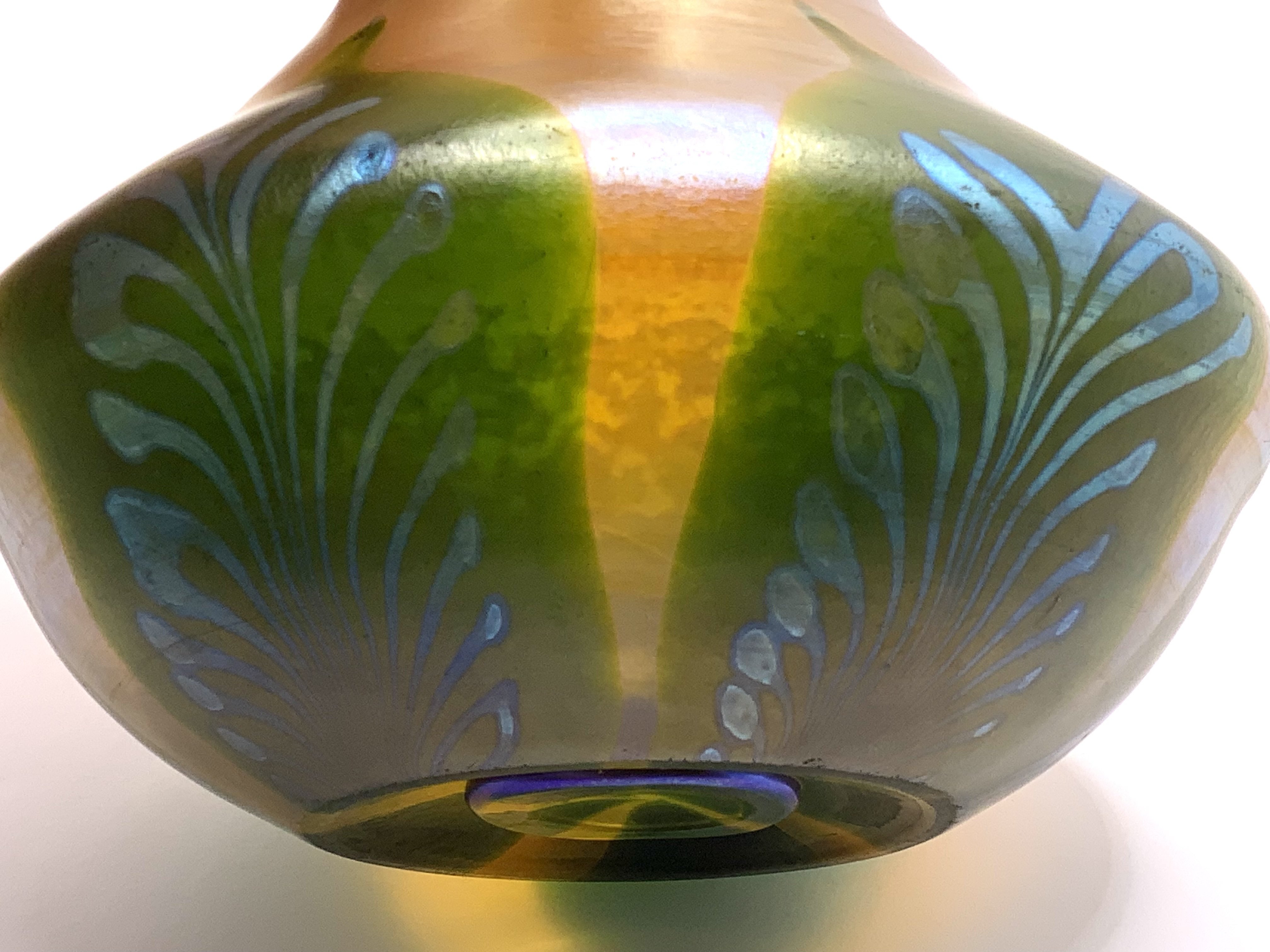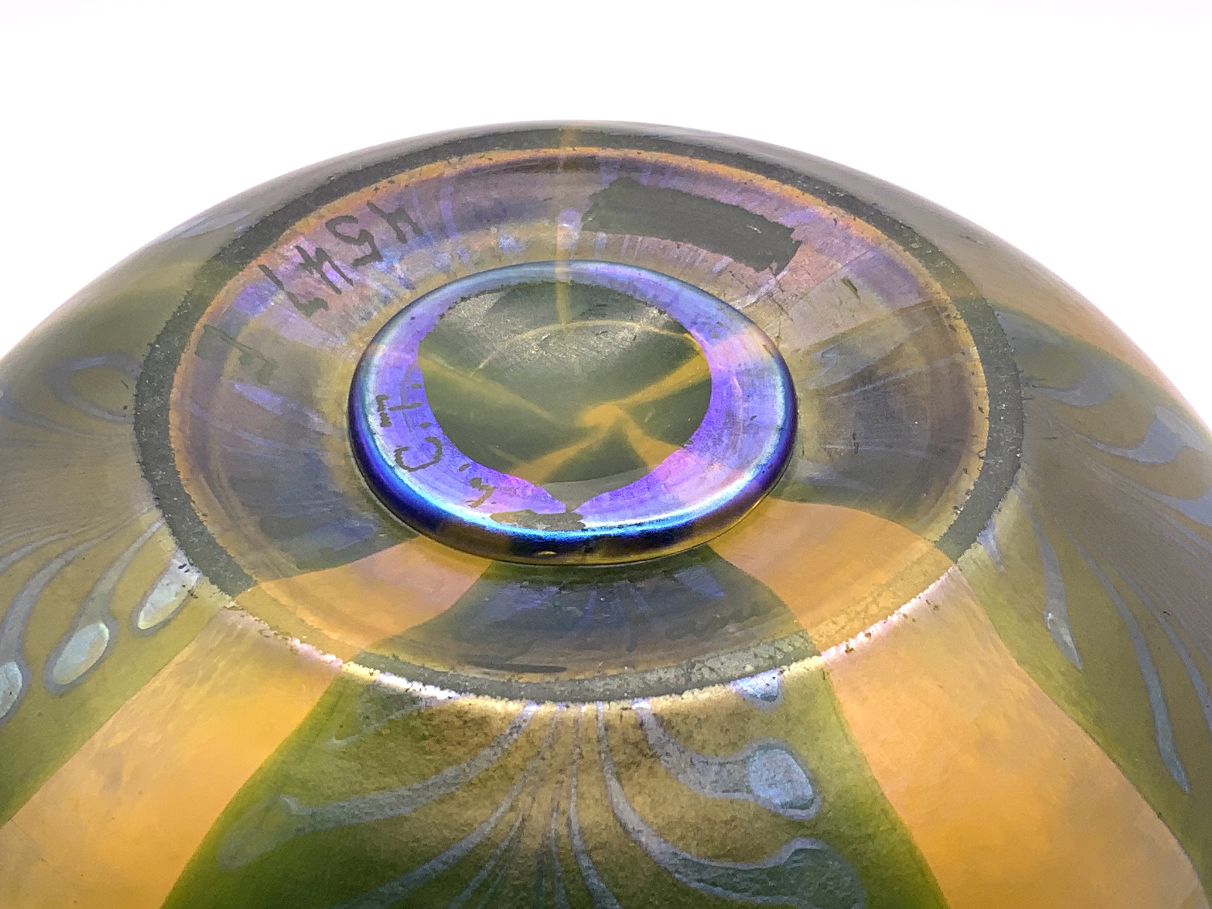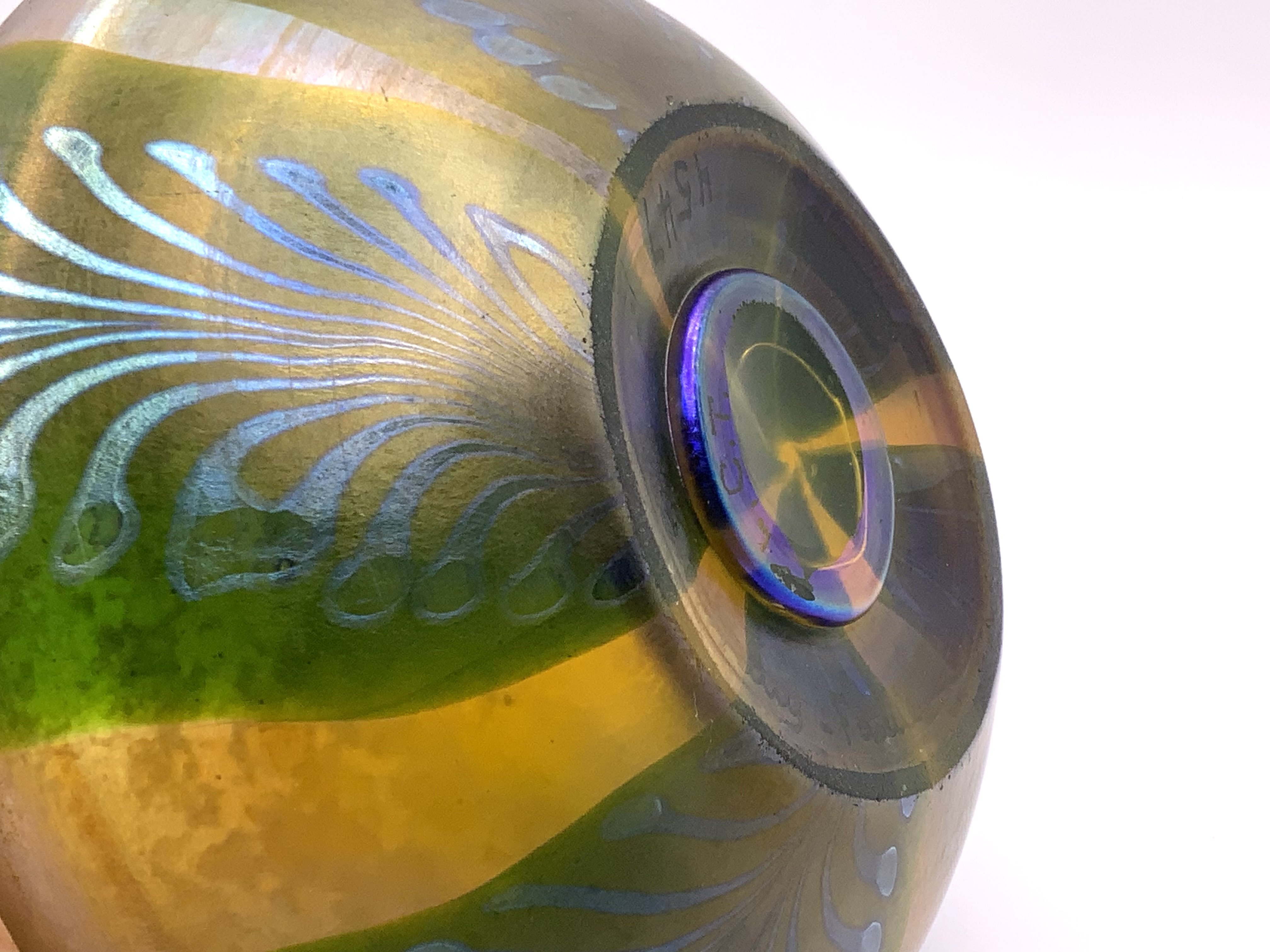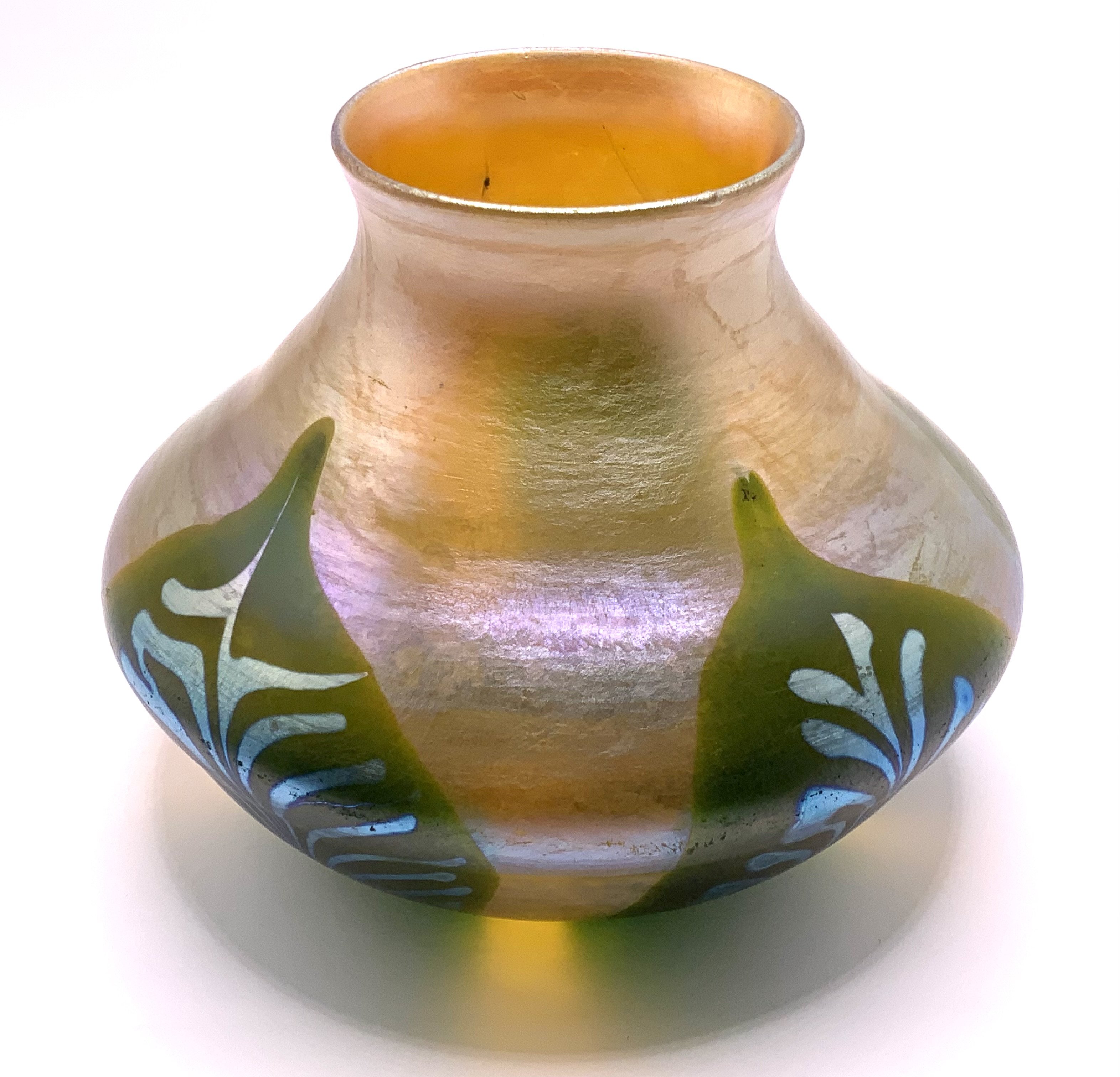 Fine quality Louis Comfort Tiffany Favrile squat glass vase with pulled feather decoration on gold iridescent body, pontil marked LCT, signed L C Tiffany Favrile 4547 circa 1910. 10cm. (D)