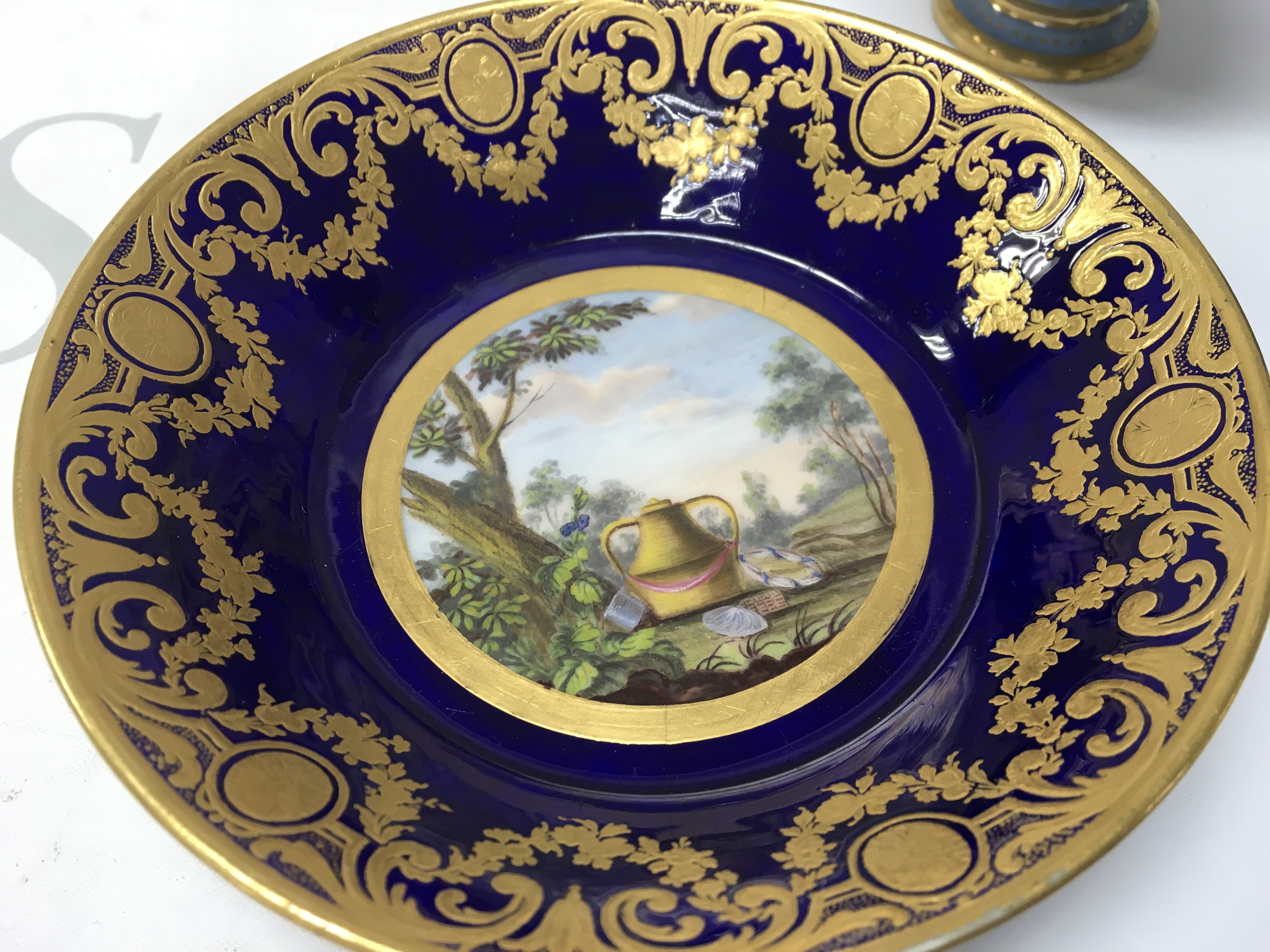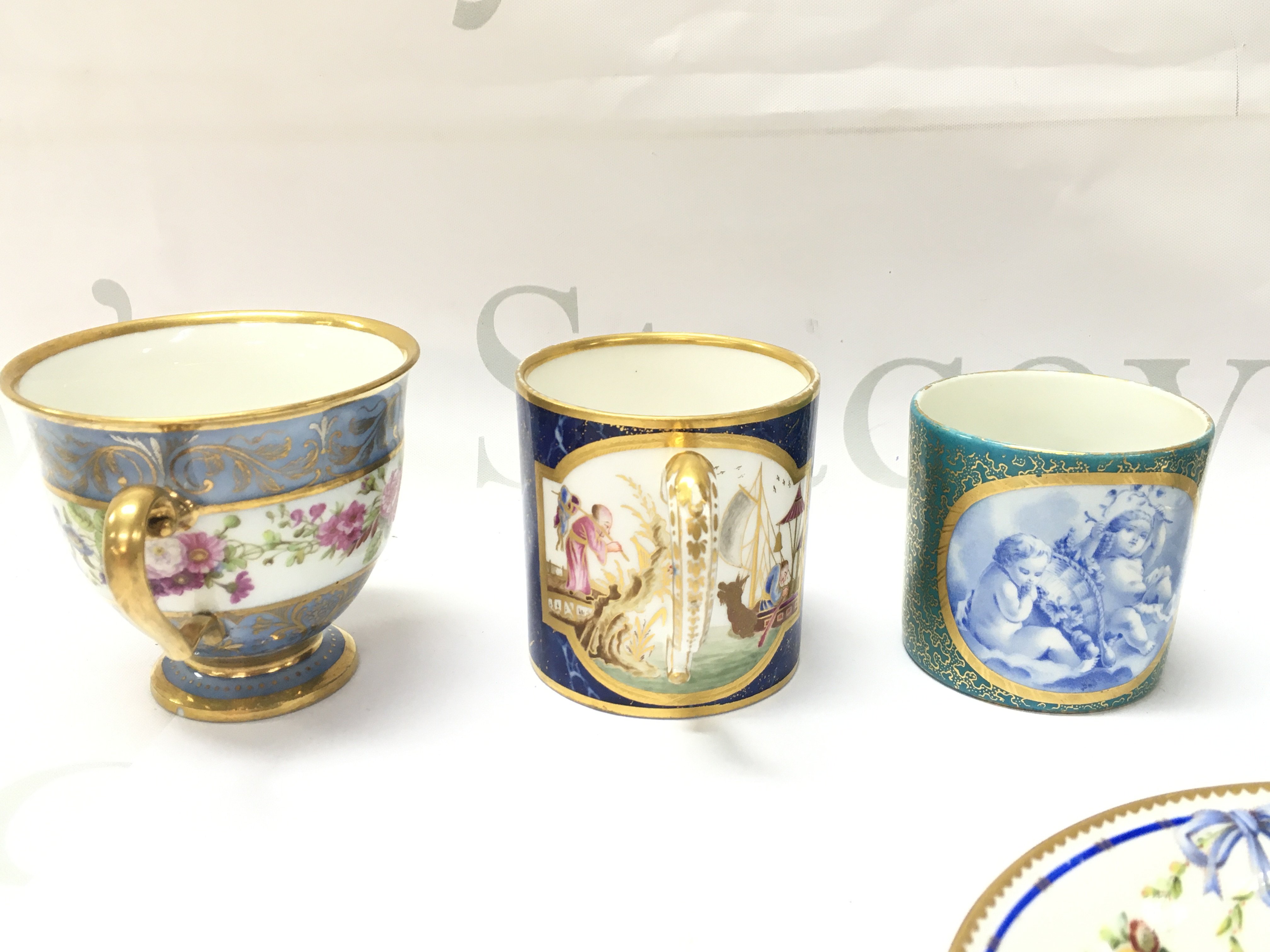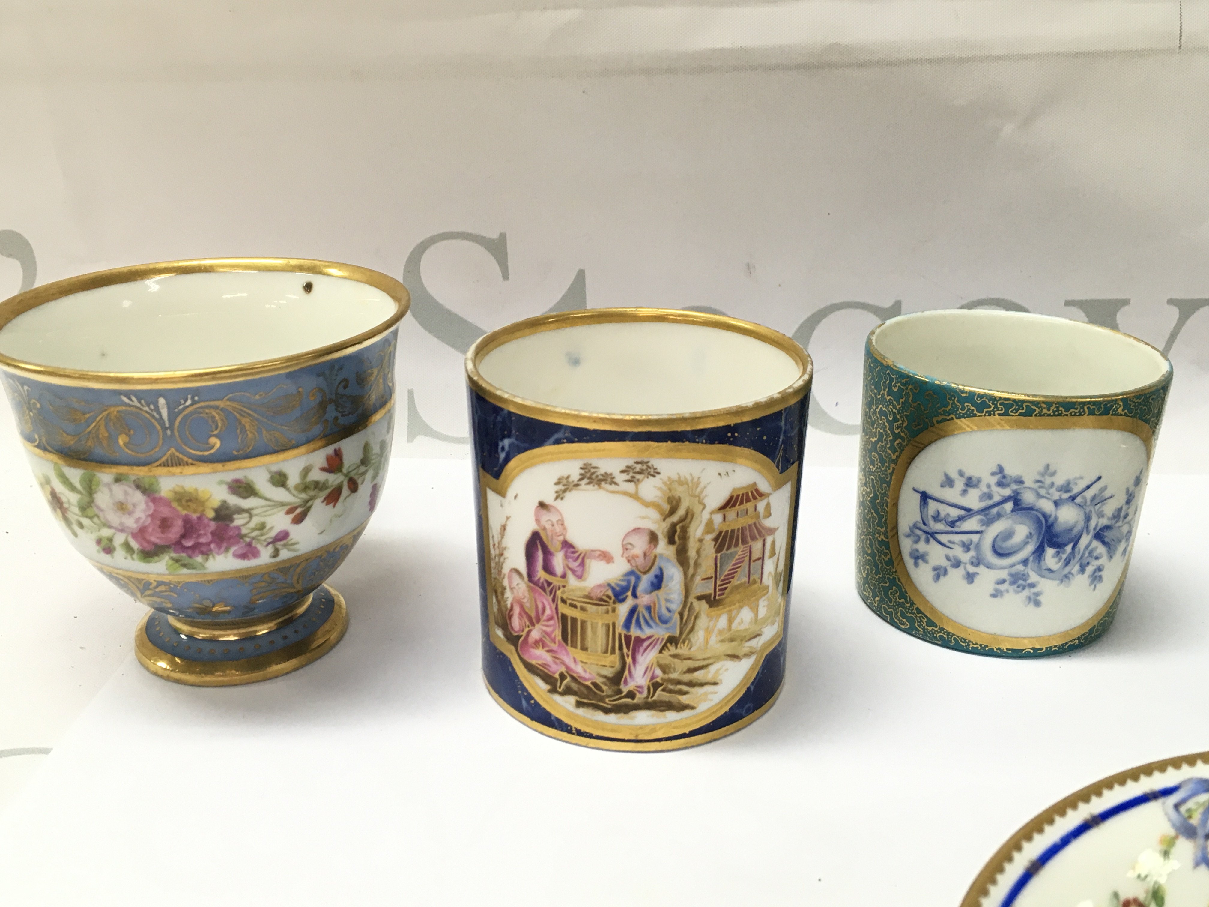 A collection of Sevres ceramics including dishes and cups , one dish dated 1779 decorated with an urn in a country scene painters mark for Jean Chabry & gilders mark for Michelle Barnabie Chauvaux . Some restoration. This lot cannot be posted