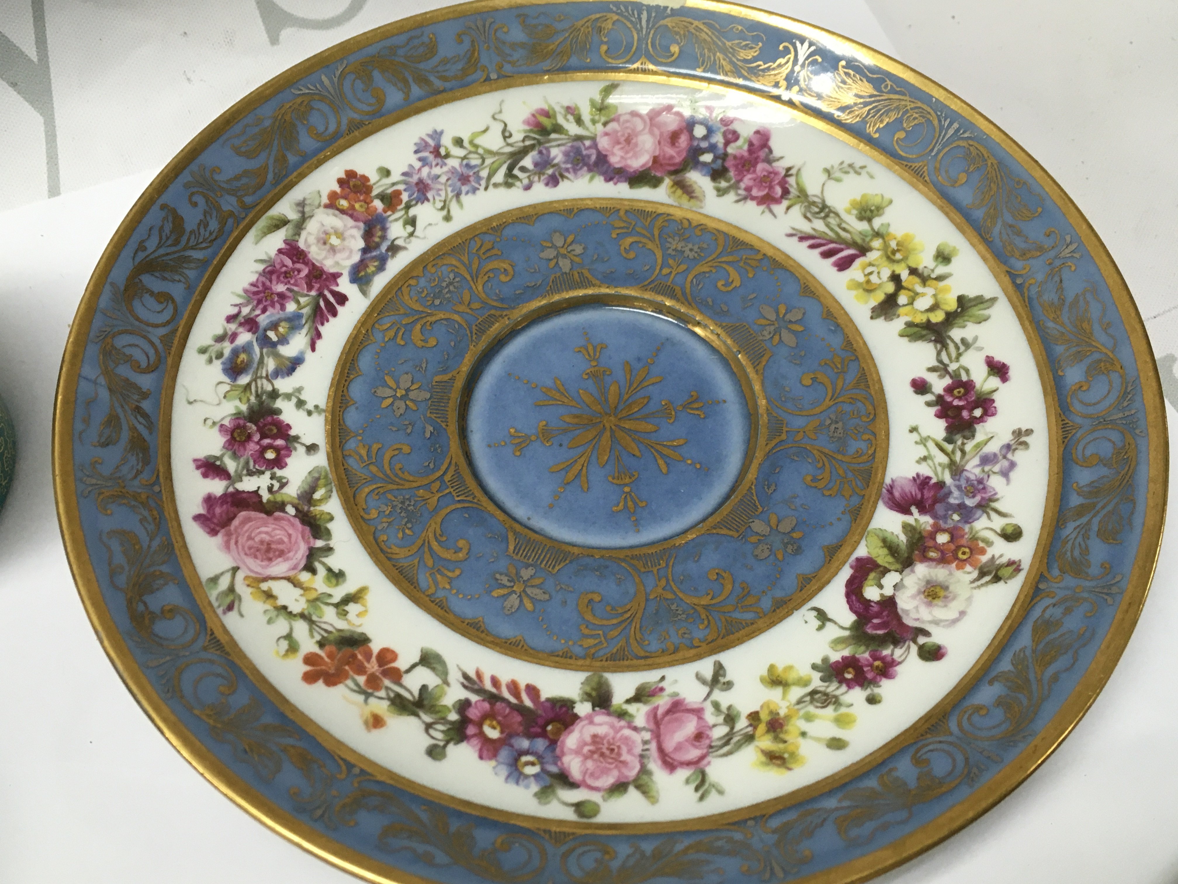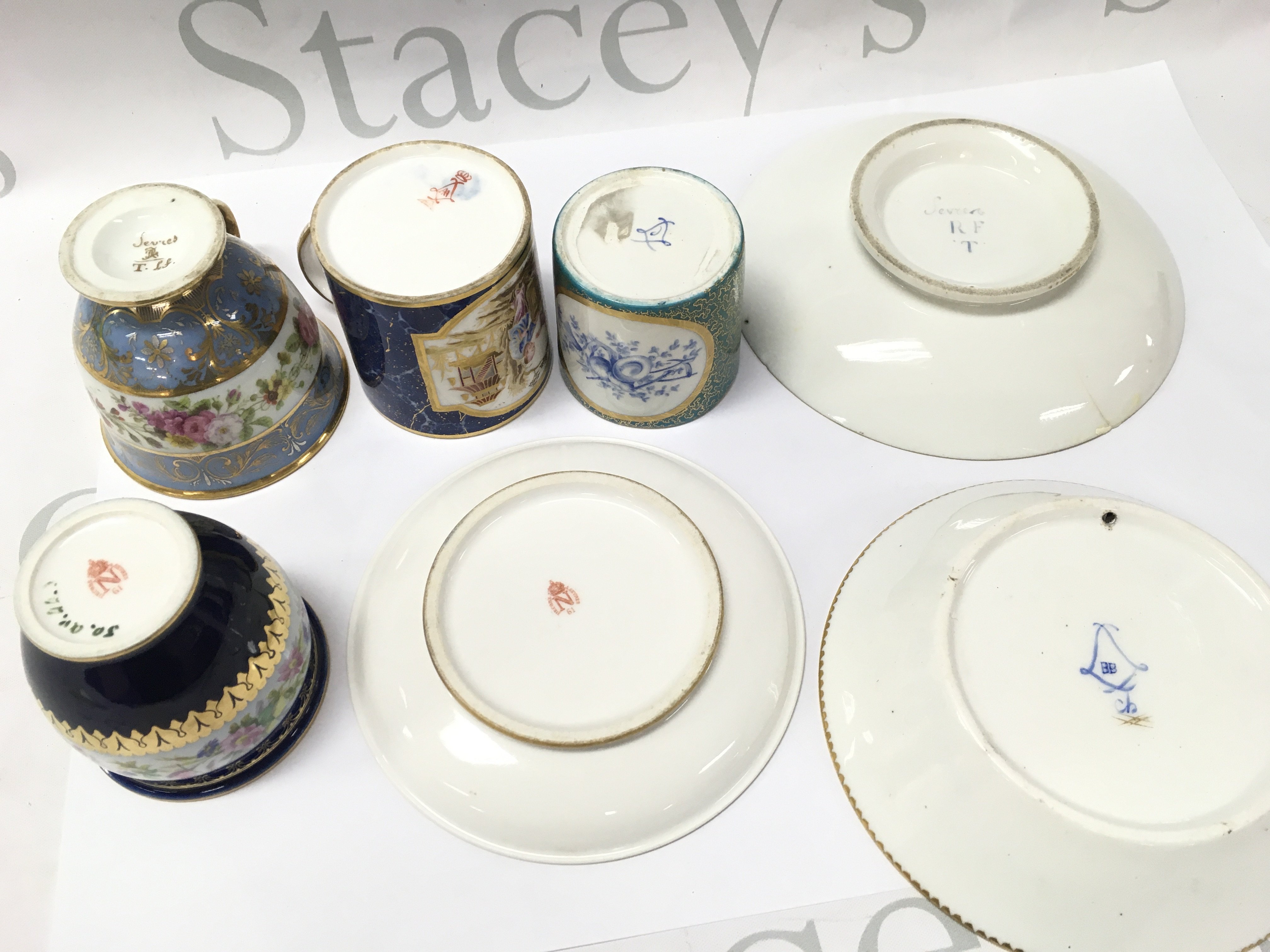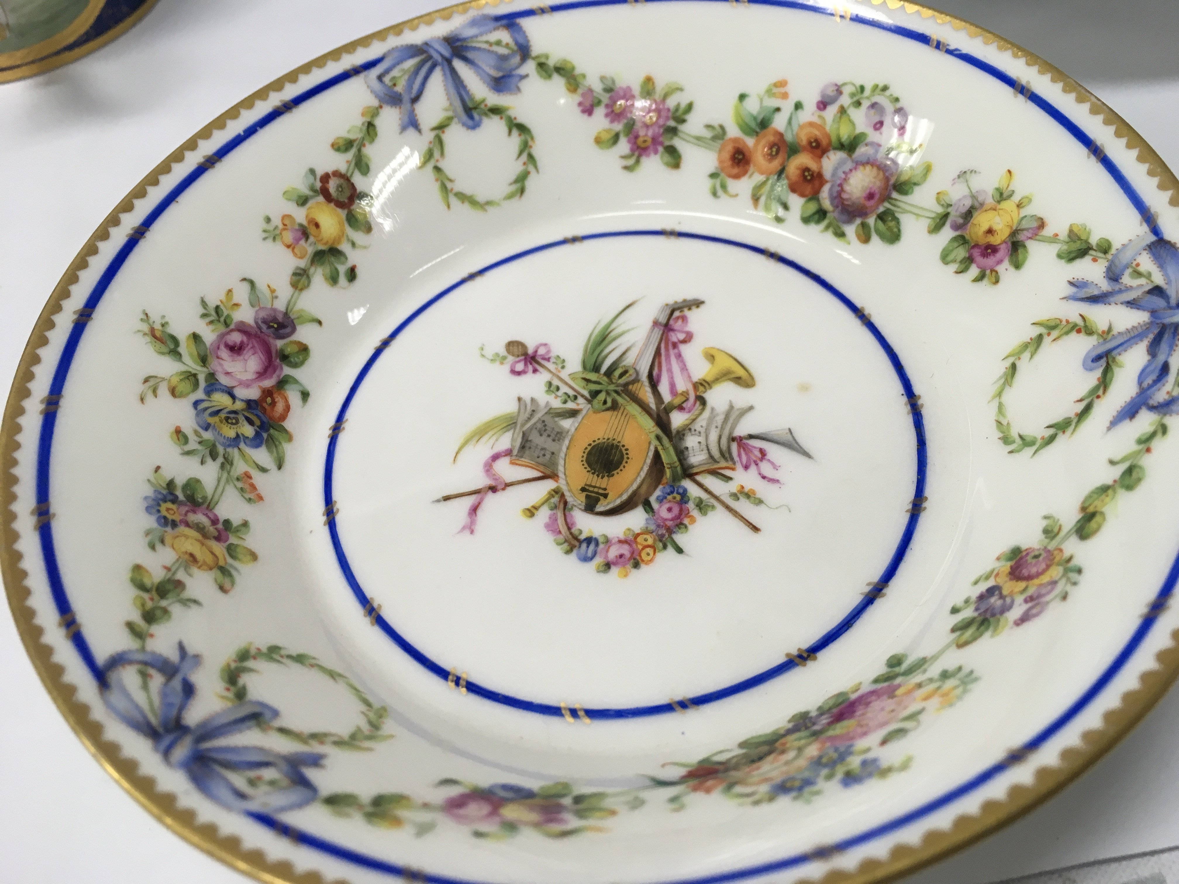 A collection of Sevres ceramics including dishes and cups , one dish dated 1779 decorated with an urn in a country scene painters mark for Jean Chabry & gilders mark for Michelle Barnabie Chauvaux . Some restoration. This lot cannot be posted