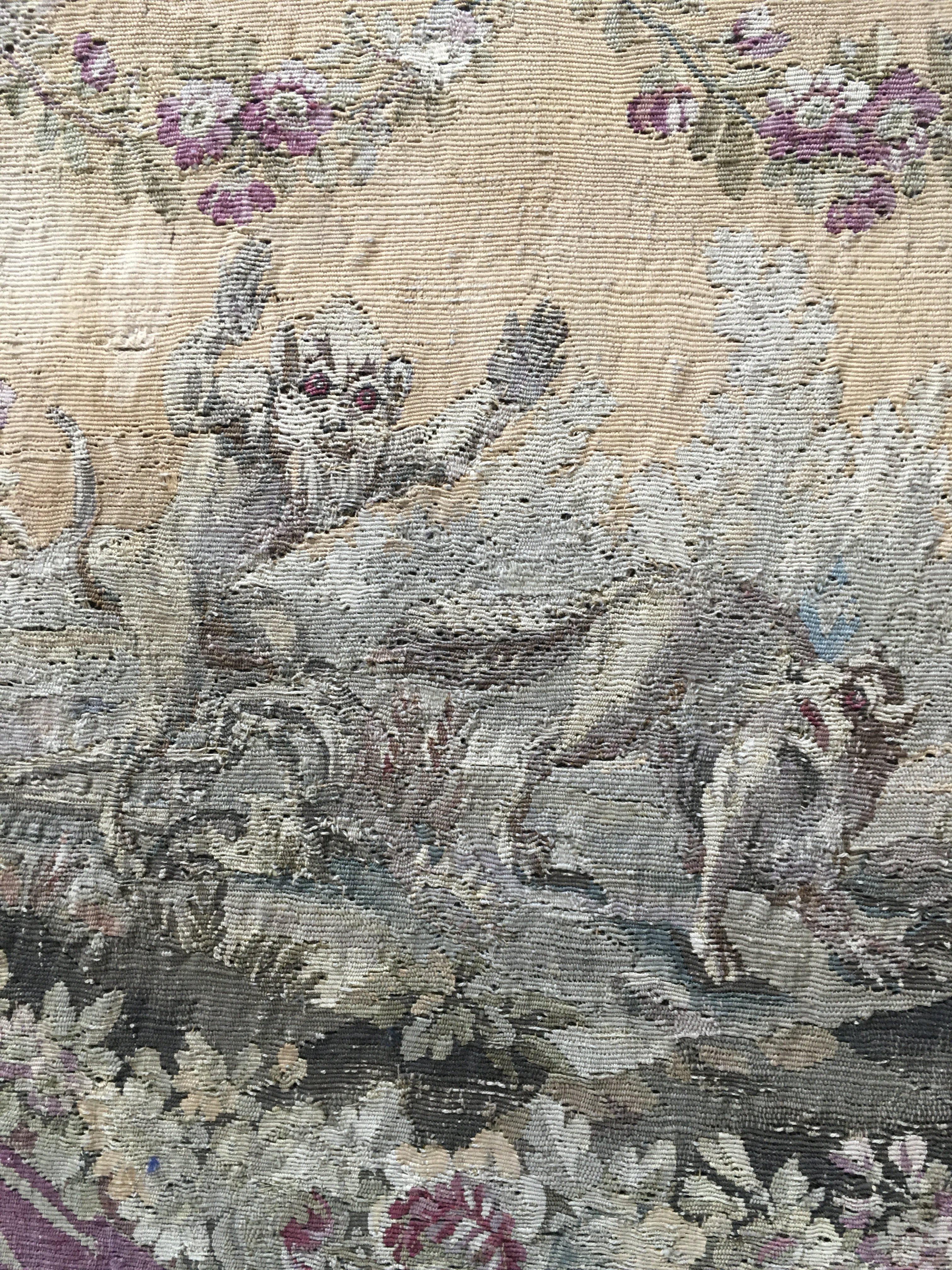 An 18th century framed tapestry of a wolf being chased by a devil dimensions 49x64cm