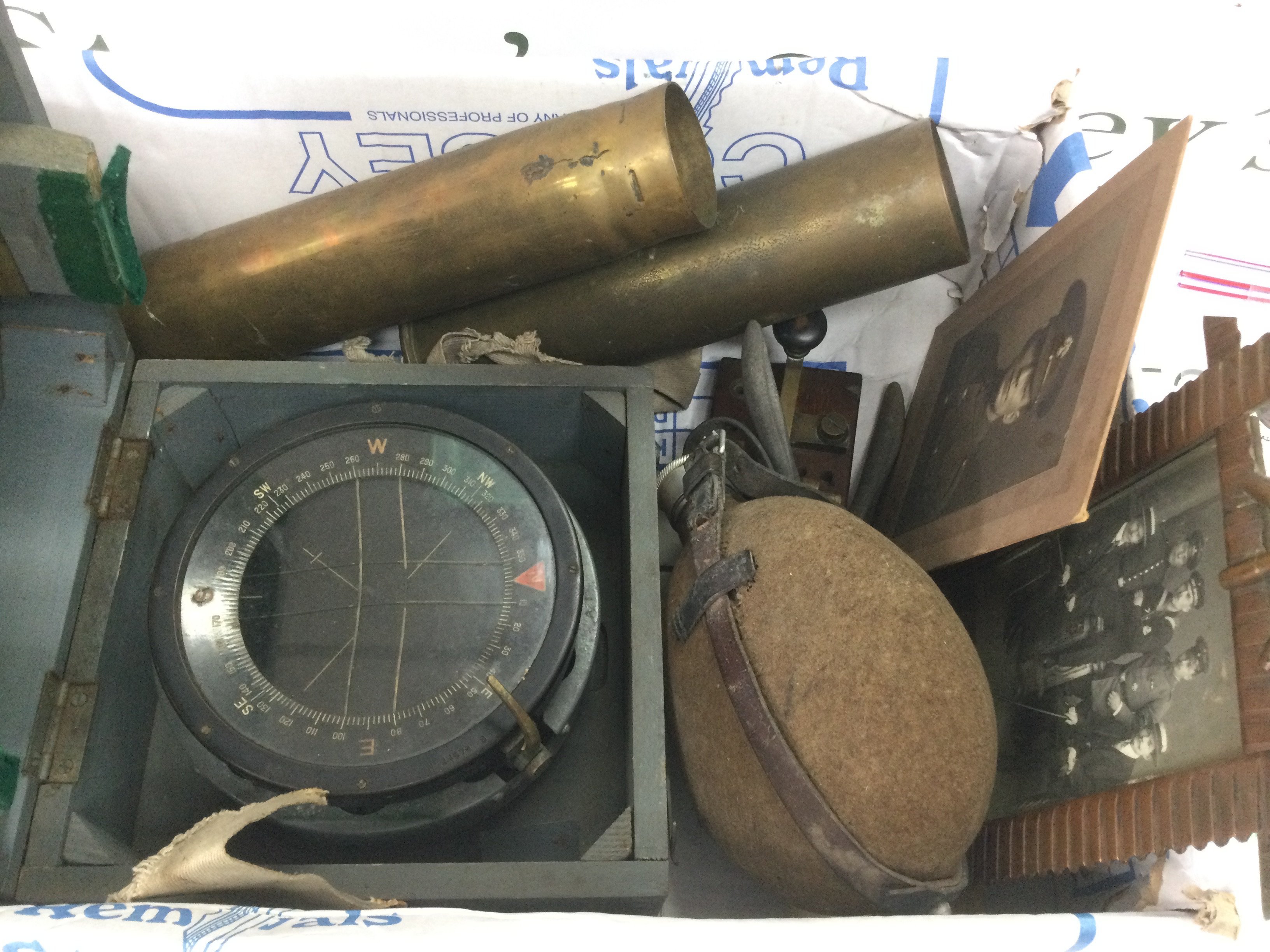A collection of military items comprising a WW2 RAF Type P10 compass with a morse code sender, brass shell casings, trench art etc. Shipping category D.
