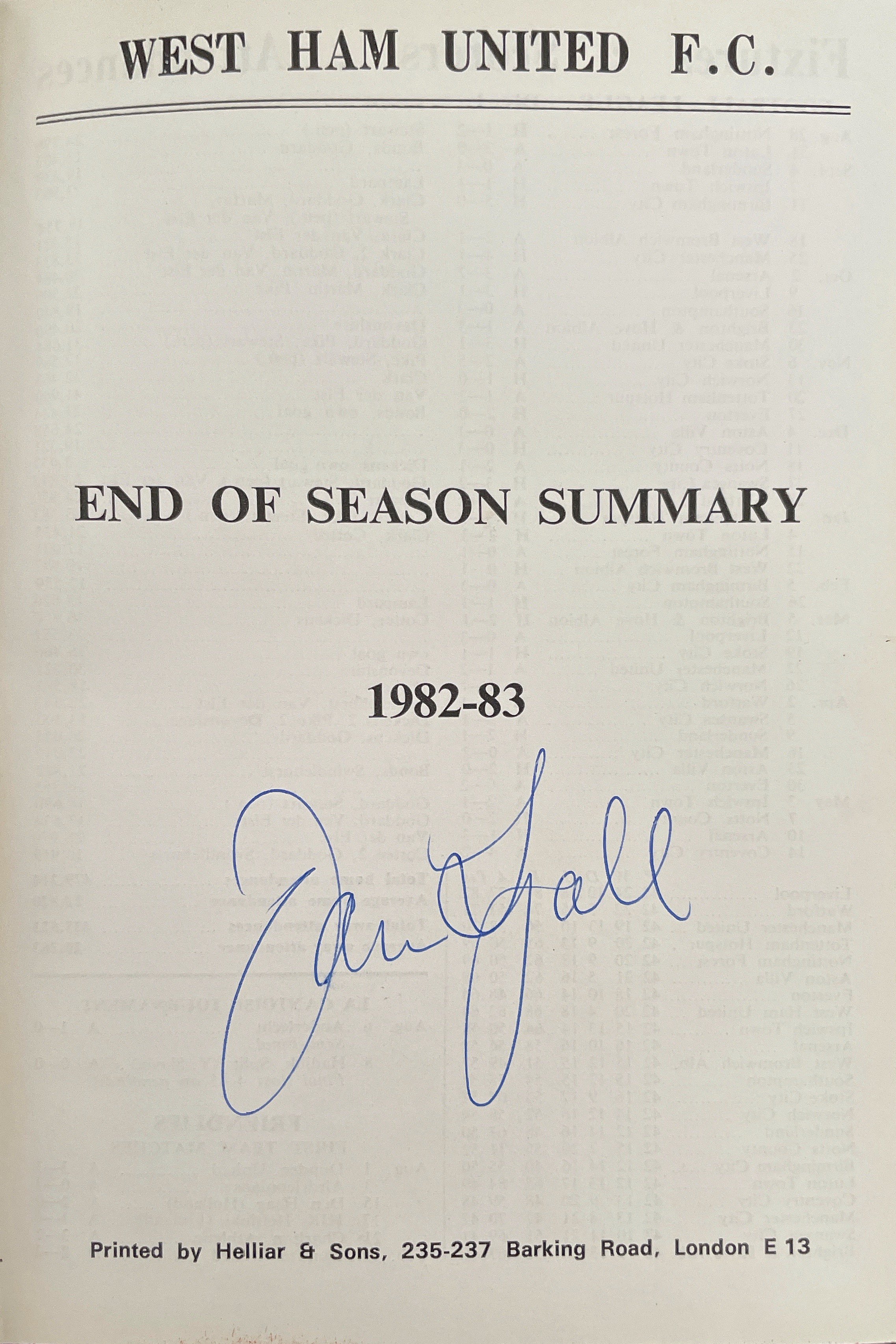 John Lyalls 82-83 West Ham Bound Volume Of Football Programmes: Official bound volume with around 50 programmes covering all home matches in the numbered set. Consists of all League FA Cup, League Cup, Reserves and Youth. Front is embossed J Lyall and is signed by him on the summary of the season.