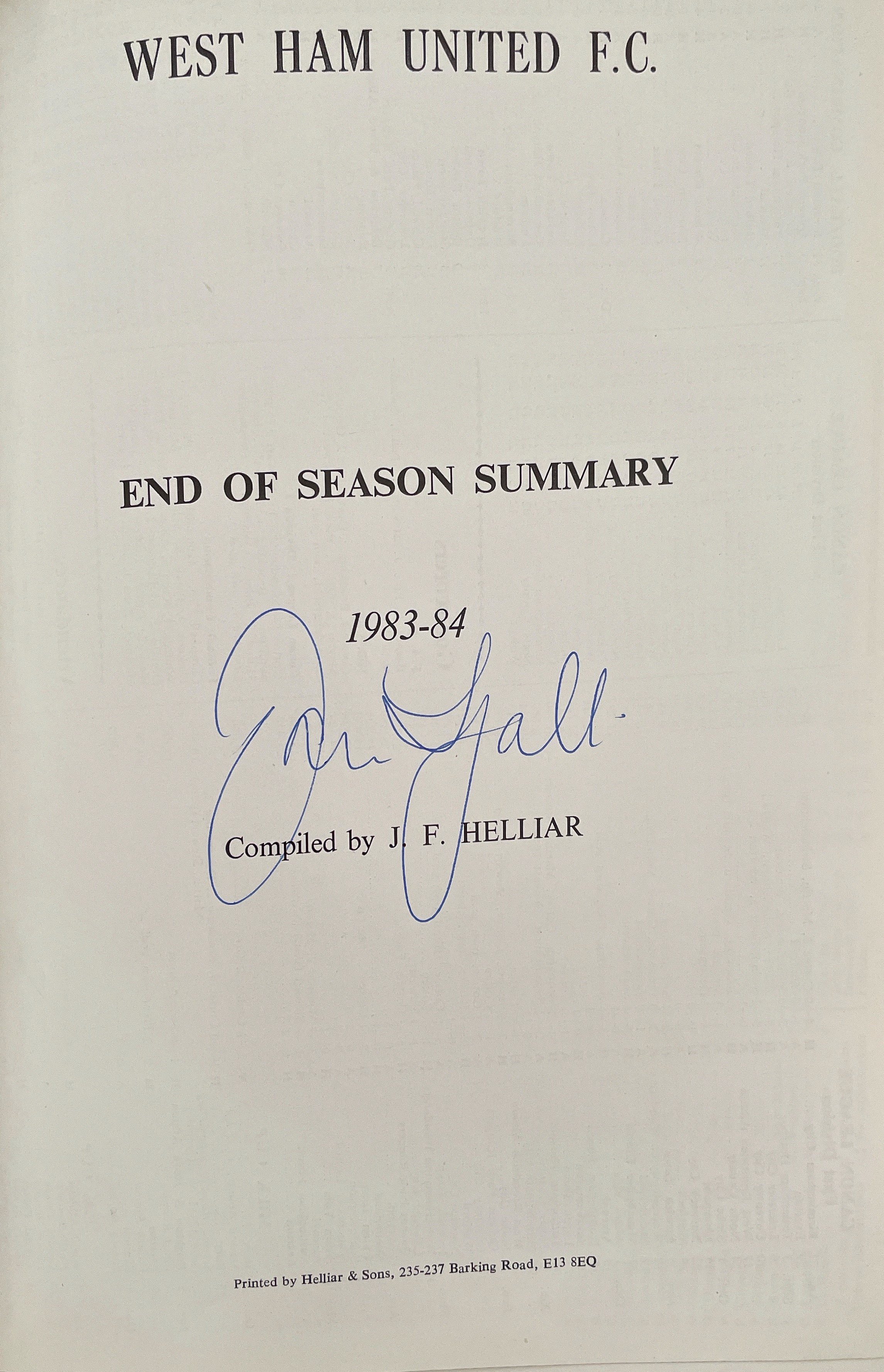 John Lyalls 83-84 West Ham Bound Volume Of Football Programmes: Official bound volume with around 50 programmes covering all home matches in the numbered set. Consists of all League FA Cup, League Cup, Reserves and Youth. Front is embossed J Lyall and is signed by him on the summary of the season.