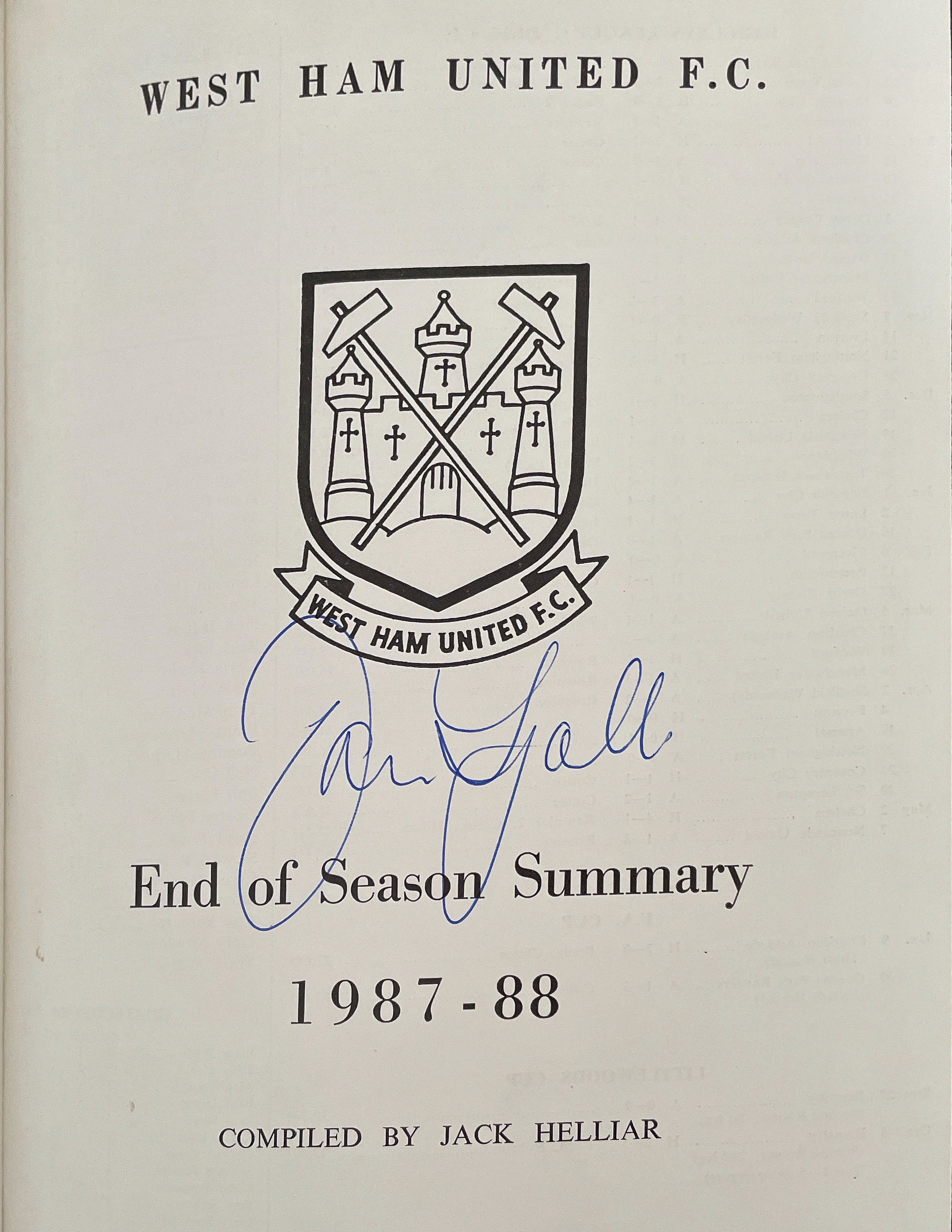 John Lyalls 87-88 West Ham Bound Volume Of Football Programmes: Official bound volume with around 50 programmes covering all home matches in the numbered set. Consists of all League FA Cup, League Cup, Reserves and Simod Cup. Front is embossed J Lyall and is signed by him inside on the summary of the season.