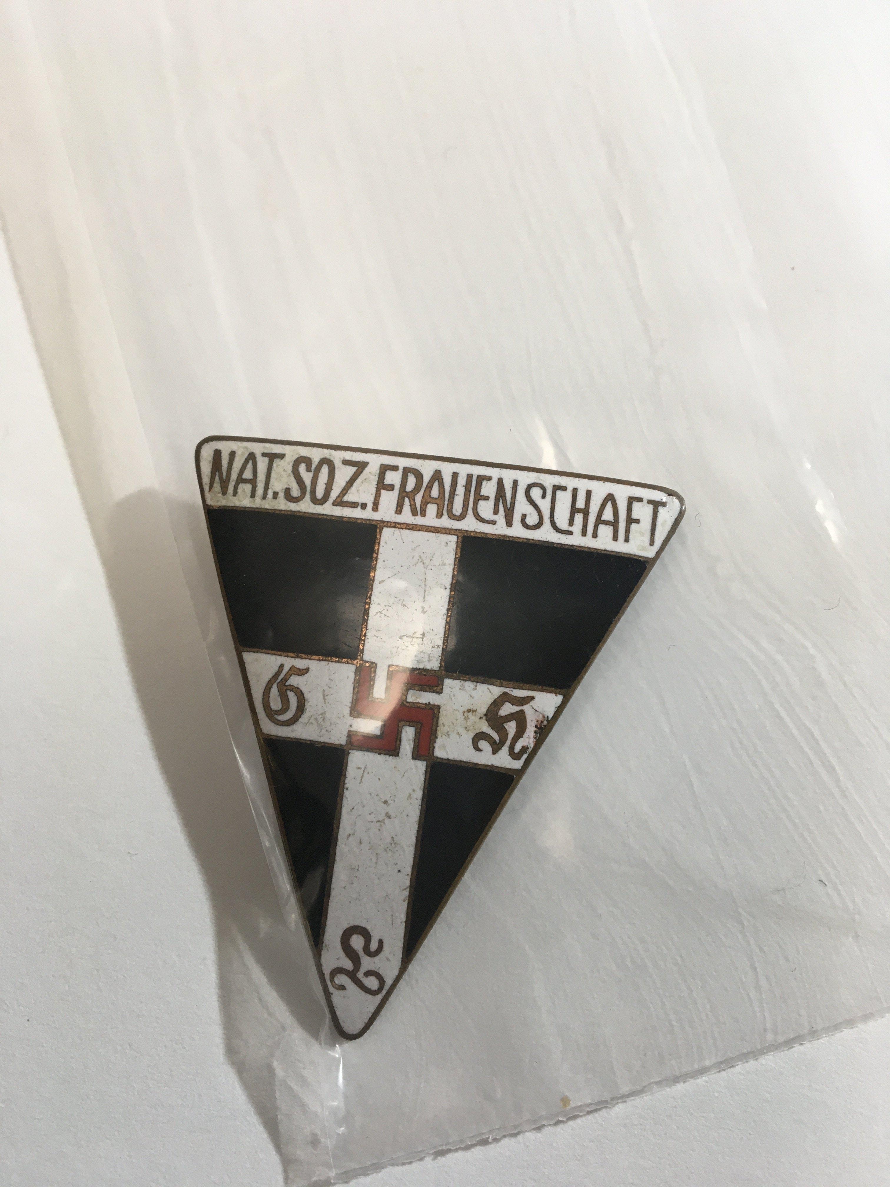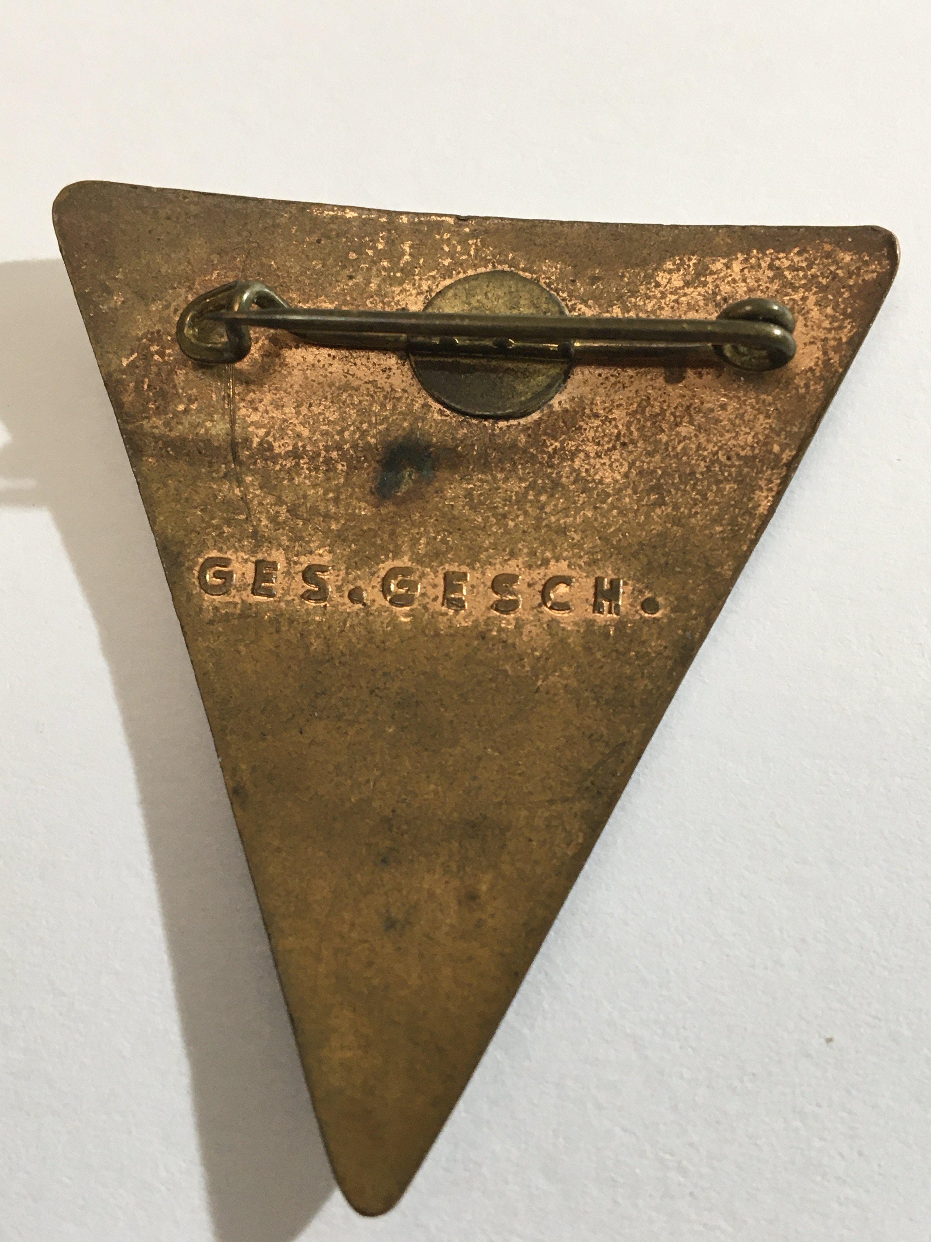 A Rare German Third Enamel badge of triangle shape awarded to Woman of the the National Socialist Party the reverse with raised makers stamp.