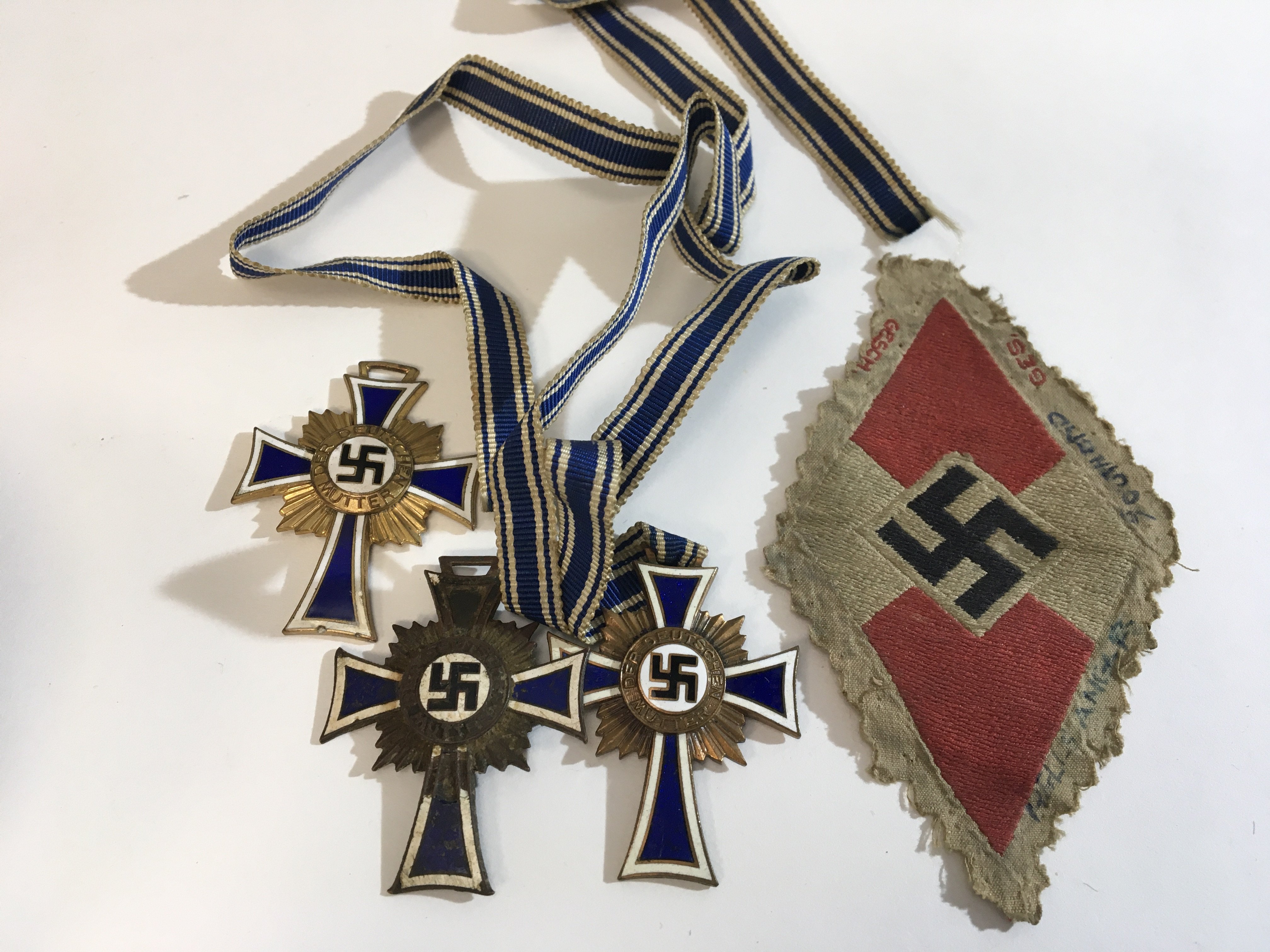 Three German Third Reich Mother cross of honour state decoration one gold two bronze. and a German Nazi cloth badge (4)
